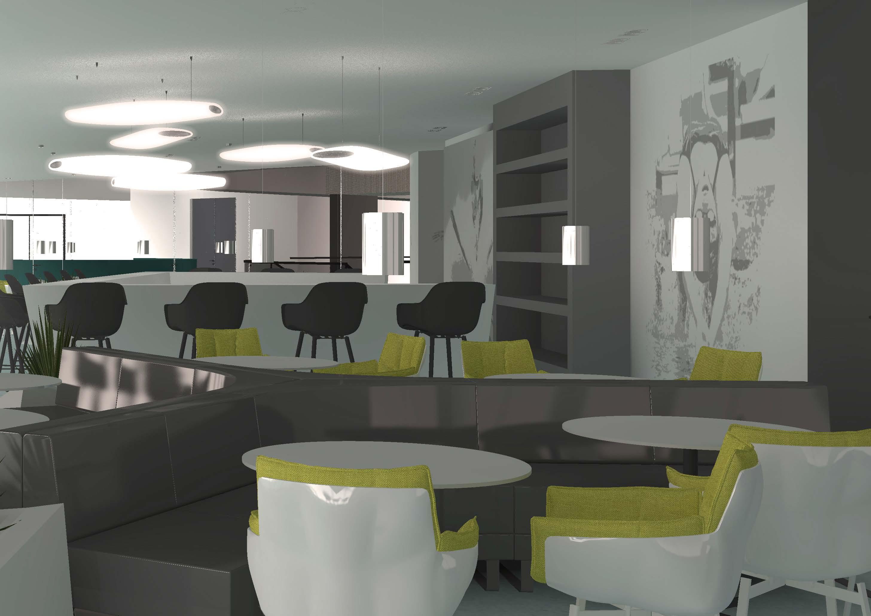 Sienos dekoruojamos moderniais achromatinio kolorito, plauki kų vaizdais, kurie puikiai dera prie bendros stilistikos. Rišantis elementas yra žalsvai-melsva spalva, kuri suteikia interjerui gaivumo įspūdį. Interjero akcentas- blizgūs, laužytų formų recepcijos, bei barų stalai, kurie suteikia interjerui subtilios dinamikos.
