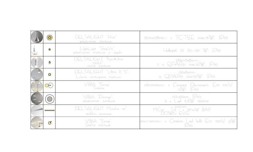 etimo charakterá skirtingoms kam bario zonoms. Naudojami taðškiniai, profiliniai, staliniai ðšviestuvai ir torðšerai. Vidiniame kiemelyje ben dram apšðvietimui sukurti naudojami ant sienø montuojami dekoratyviniai lauko šðviestuvai. Þiemos sode nau dojami pakabinami šðviestuvai bend rai šðviesai, toršðerai ir specialaus spektro augalø augimà stimuliuo jantys šðviestuvai. Dizaino aspektu visi ðšviestuvai parinkti minimalistiðš ki, lakoniðkø geometriniø formø.