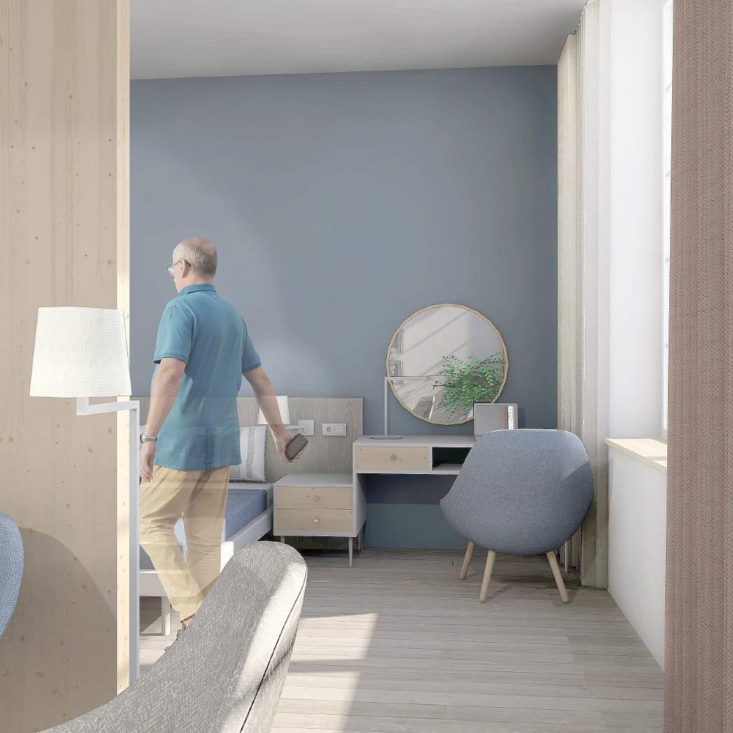 sodas“ su realaus ðšiltnamio ir re lakso jame funkcijomis. Jáįkuriant taip pat laikomasi centrines kom pozicijos, simetrijos, naudojami skai drûs paviršðiai, aþûras, slankiojanèios pertvaros ir mobili baldinë áranga. Tame paèiame pastate projektuo jamø seneliø namø pagrindinis tiks las sukurti jaukius, modernius ir patogius namus ávairaus amþiaus ir bûklës (išðskyrus klinikinës) senjo rams. Projektuojami keliø skirtingø tipø kambariai su galimybëmis ap sigyventi ðšeimai, ásikurti intensyvios globos kambaryje, gyventi vienam arba dviese viename kambaryje.