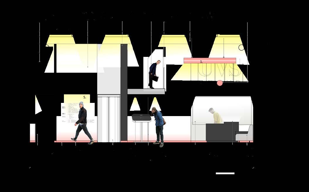 Todėl tai padiktuoja problemą, kad reikalingi pokyčiai struk tūroje. Pratęsiant vertikalų pastato ašyje esantį ryšį iš I-II a. projektuo jama aktyviai naudojama atraktyvi laiptinė su interaktyvia ekspozicija, vedanti į naują, bendrą maitimo zoną, tiekiančią maistą visiems pen kiem aukštams. Kavinė suteikia sąlygas dalintis idėjomis ir pavaišinti svečius kava. Projektuojamas amfiteatras ir antresolė. Hube sukuria mos sąlygos rengti konferencijas, eksponuoti savo IT darbus projek tuojamoje atraktyvioje, dalinai atvertoje į kavinę (bendrą laisvalaikio zoną) laiptinėje.