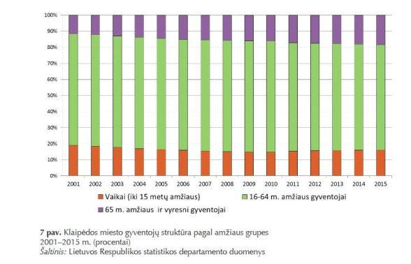 Taip pat labai aktuali problema - Klaipėdos miestas "senėja". Ne tik prastėja demografiniai rodikliai, išvyksta iš miesto žmonės, bet ir auga pensininkų amžius, jaunimo mažėja. Daugiausią Klaipėdą sudaro vaikai ir paaugliai iki 18 metų ir vyresnio amžiaus žmonės, pradedant nuo apytiksliai 40-ies ir toliau skaičiai tik kyla. Išvados tokios, kad dauguma jaunimo, baigę mokyklą, išvyksta studijuoti į kitus miestus arba į užsienį, o vėliau ir nebegrįžta į gimtajį miestą. Pagrindinės to problemos yra aukštųjų mokyklų trūkumas Klaipėdoje, prasta studijų kokybė, mažas darbo pasirinkimas. O taip pat ir neišlavinta kultūros struktūra, dėl ko jaunimui paprasčiausiai Klaipėdoje yra nuobodu