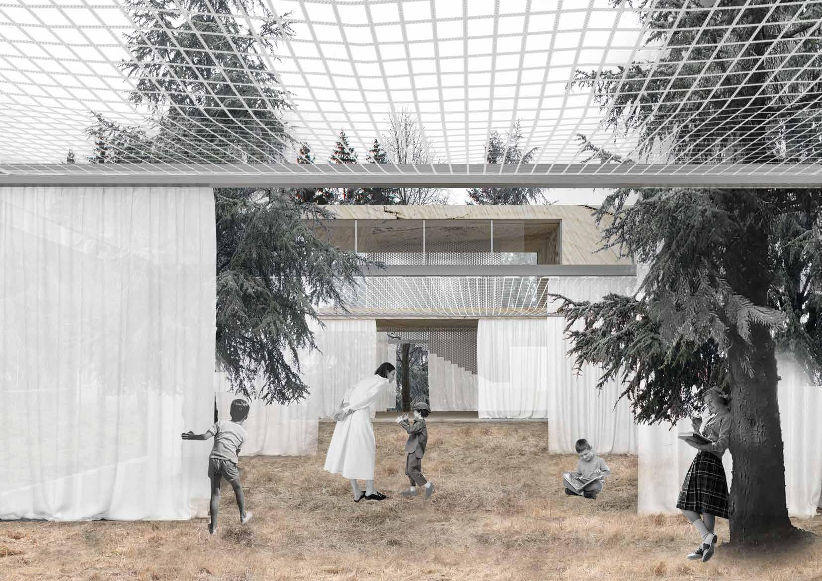 Most Lithuanian schools are built in the USSR. Today, children, their needs and experiences are different from those of people who grew up in the Soviet Union. The development of a child's cognitive competence is not yet sufficiently taken into account. Young people in schools lack a variety of environments, and the natural environment provides a different learning experience compared to education in the classroom. The aim of the project is to create intermediate fields of outdoor education, to discuss the typological of the educa tional building. A historically unique place has been chosen for the development of outdoor educationPūčkoriai, which belongs to Pavilniai Regional Park. This place is rich in its natural history. Selected object - Remains of a water mill. Taking into account the chosen location and the chosen teaching method - field education, it was decided that design and architectural solutions should be based on the principle of training and use of the senses. Inspiration is taken from landscape photo fixations, which are meaningful and used in the design elements, materials, textures that are created. Used materials: clay, CLT construction wood, concrete, coarse-textured plaster, textiles. Analyzing history and intertwining it with local geography, an attempt is made to decode the prevailing atmosphere and convey it through archi tectural and design solutions and materials