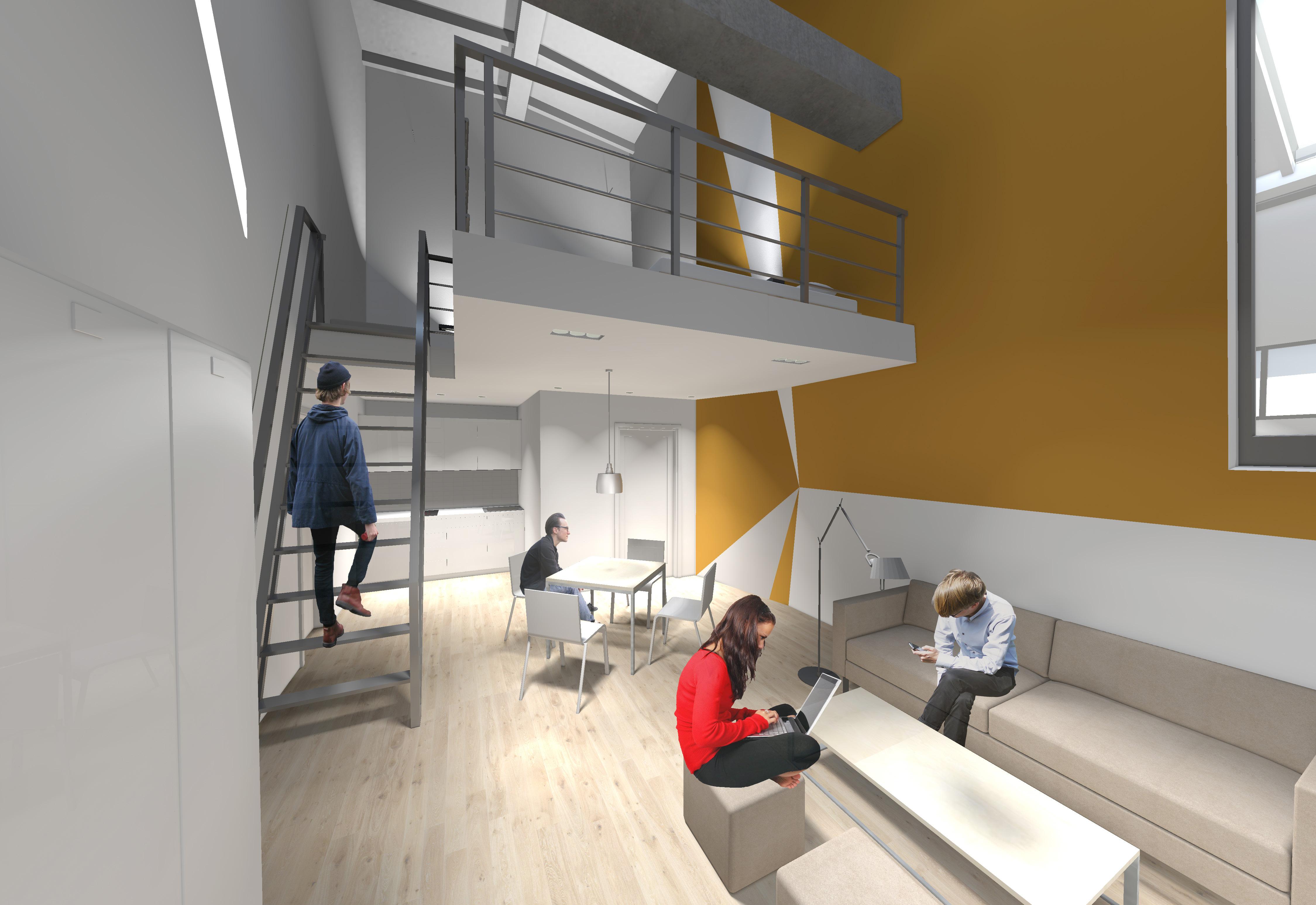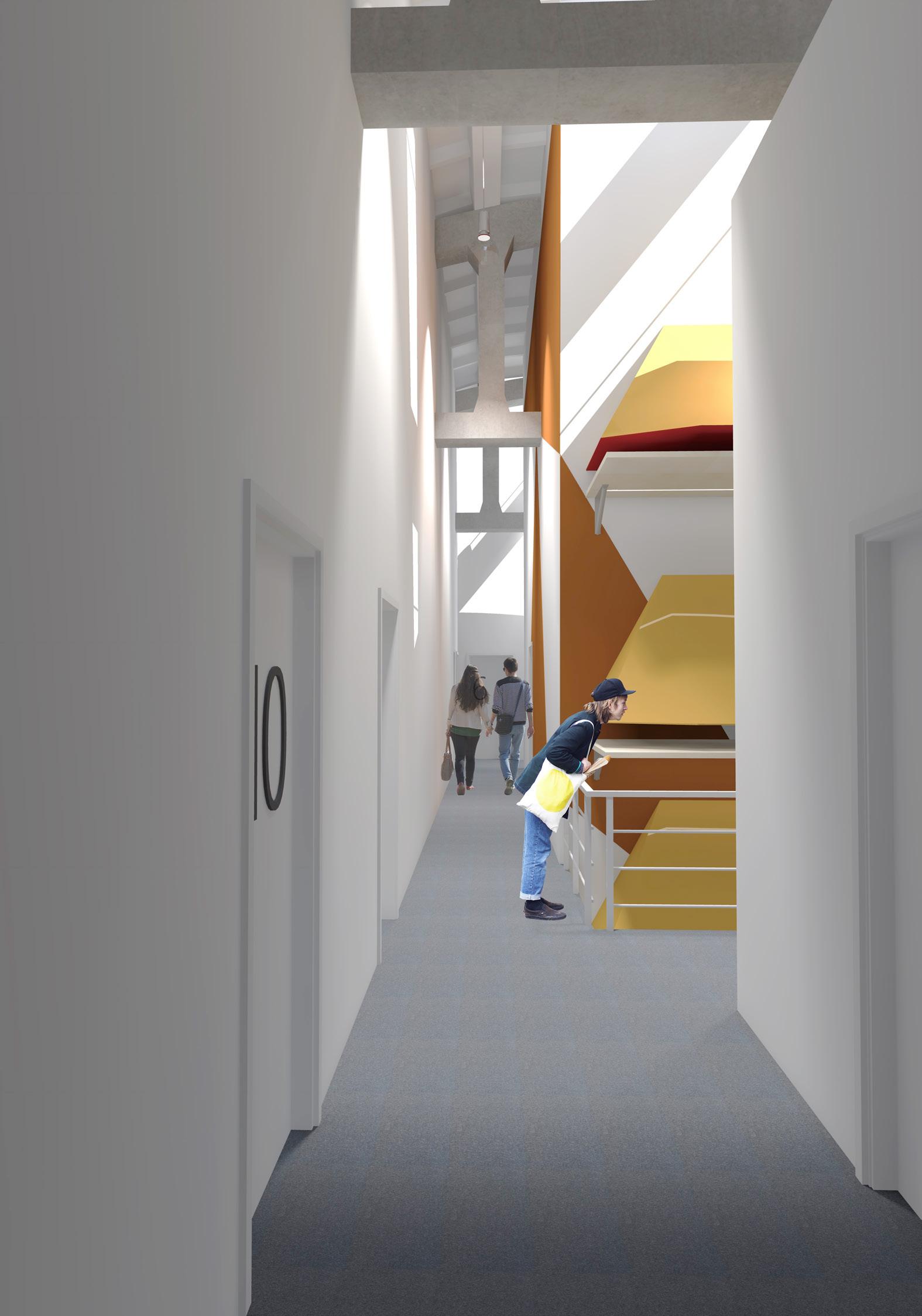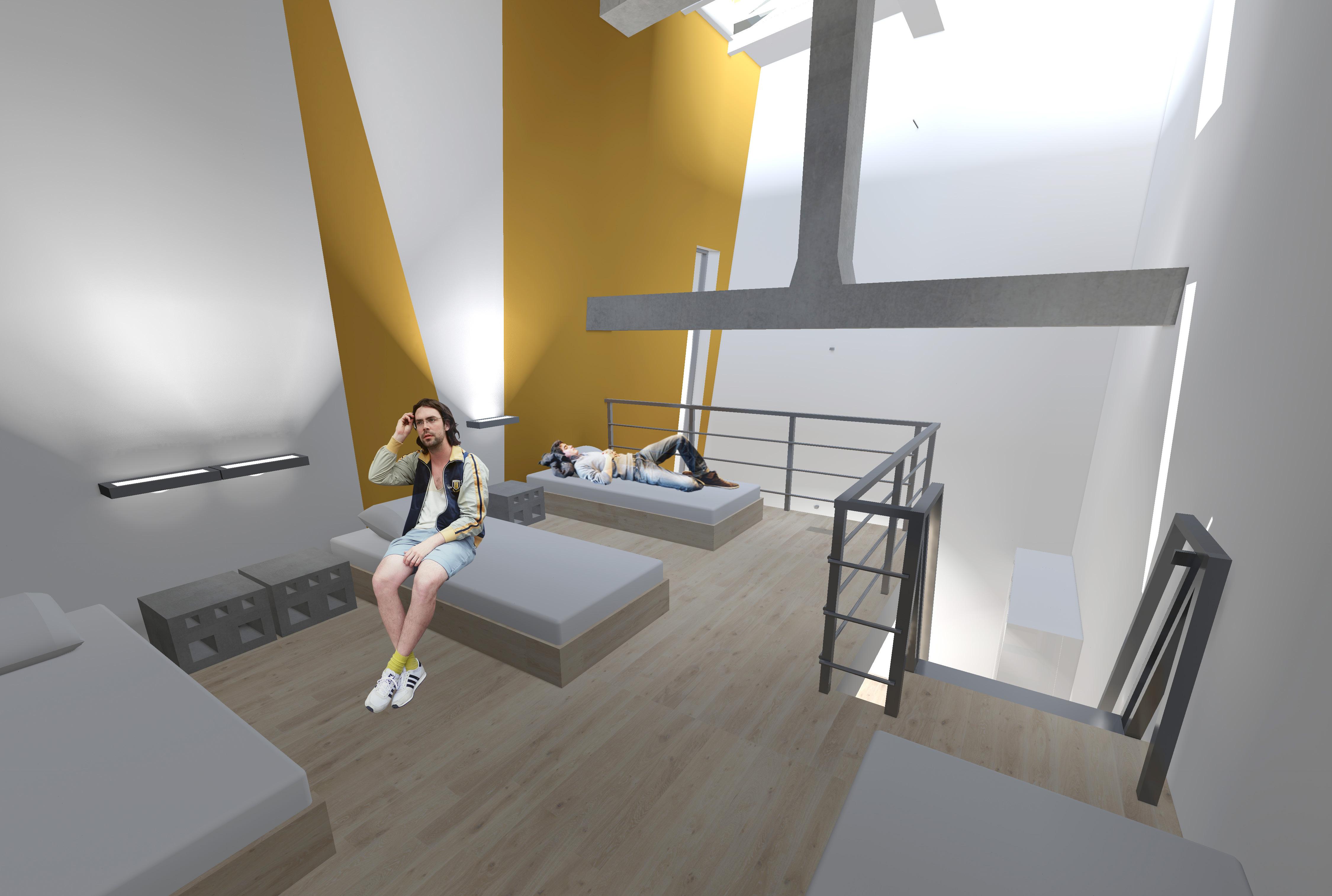 Hostelyje atspindima alpinizmo centro, bendrųjų erdvių, stilistika. Apgyvendinimas varžybų dalyviams, kitų miestų sportininkas. Stilistiškai išlaikyti industrinės erdvės, angaro, pojūti.