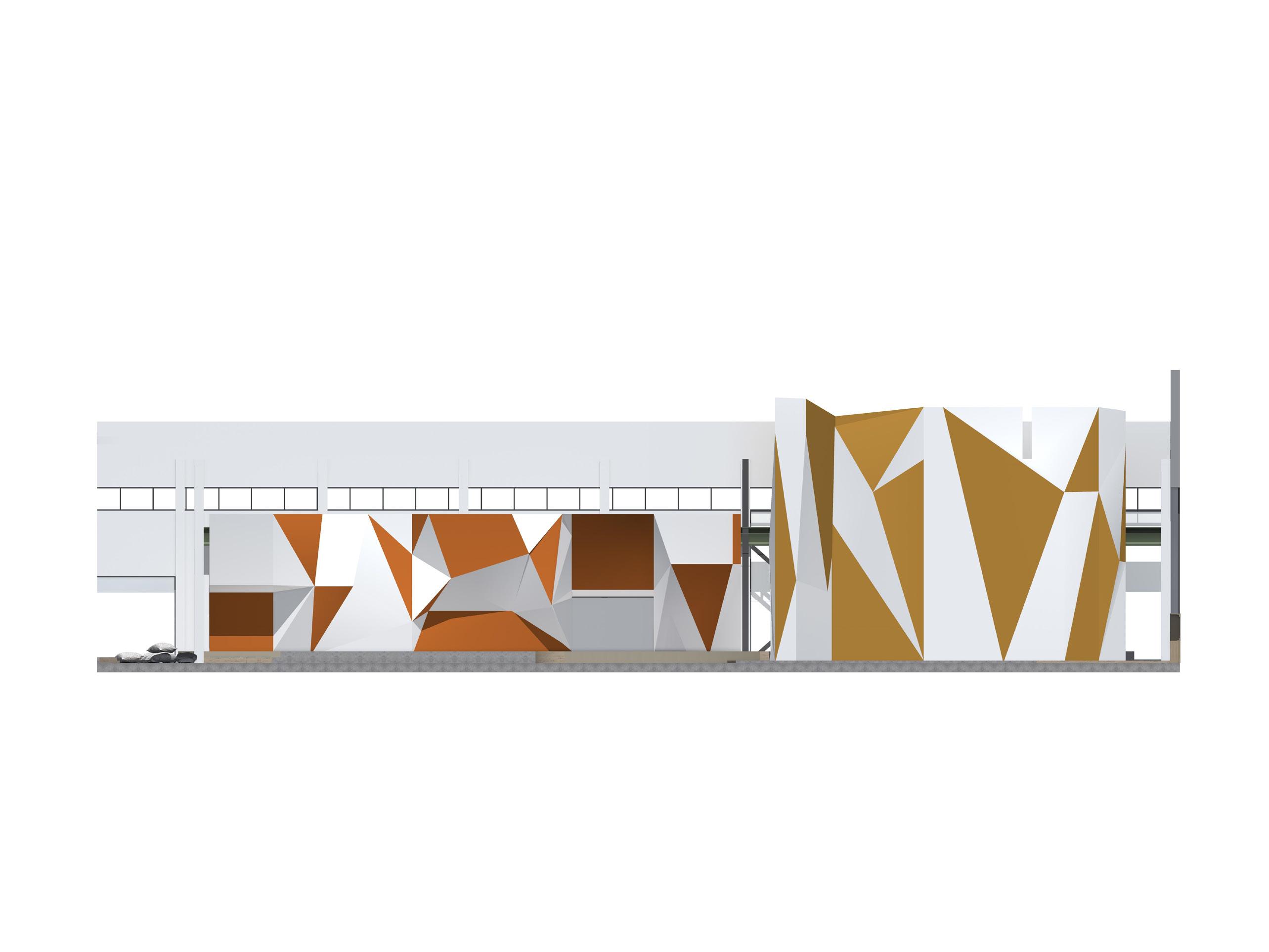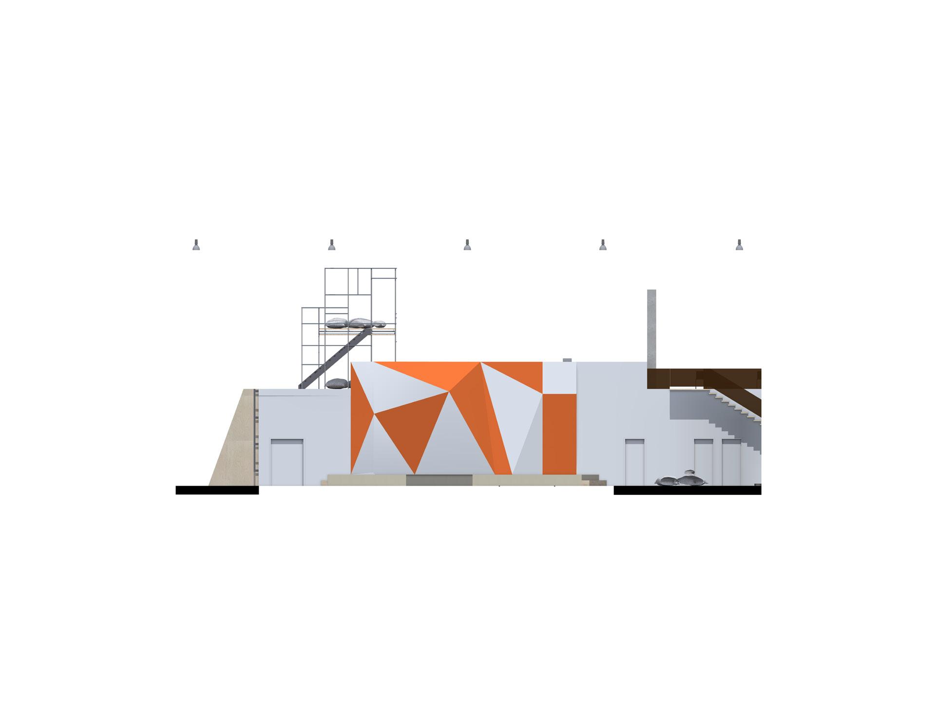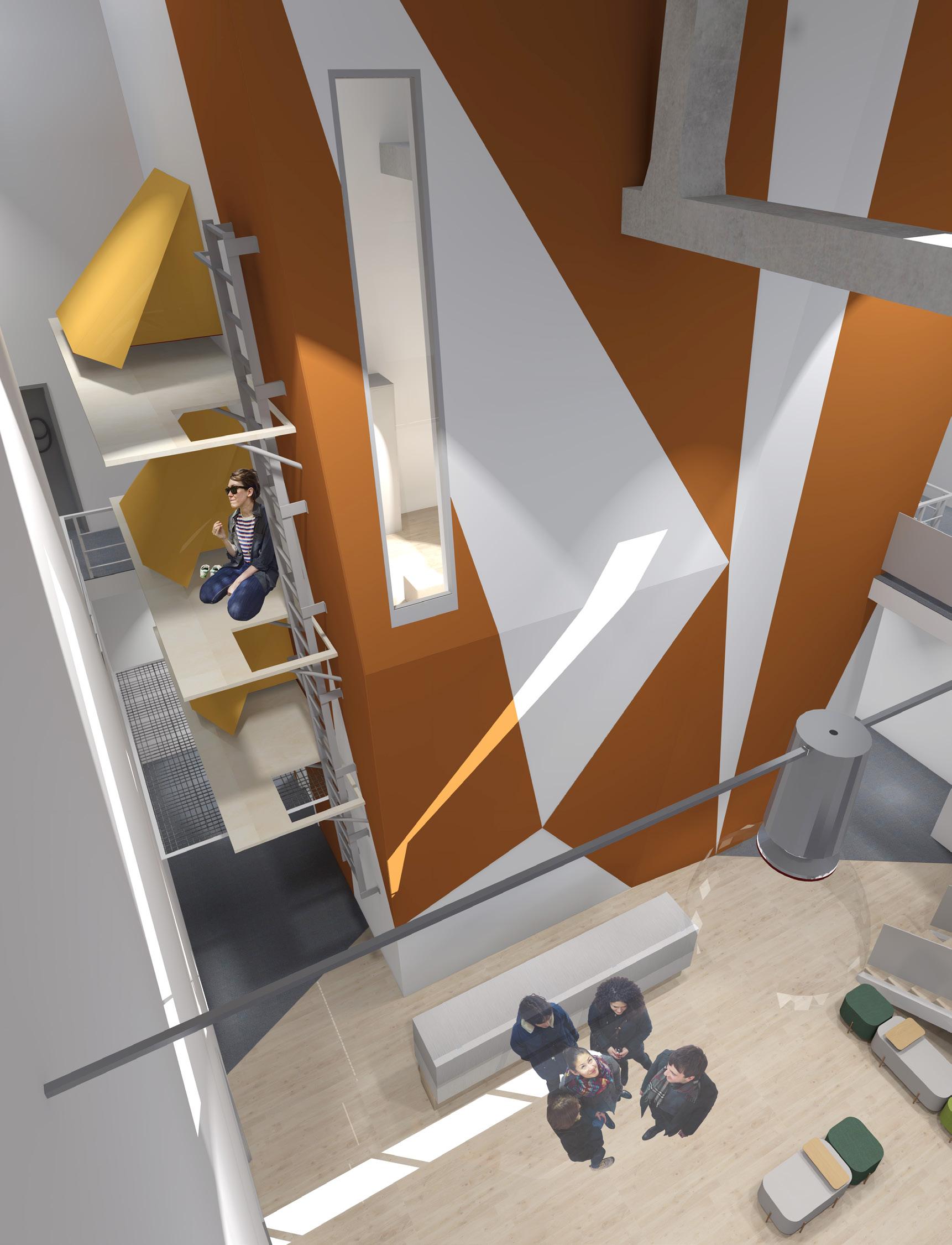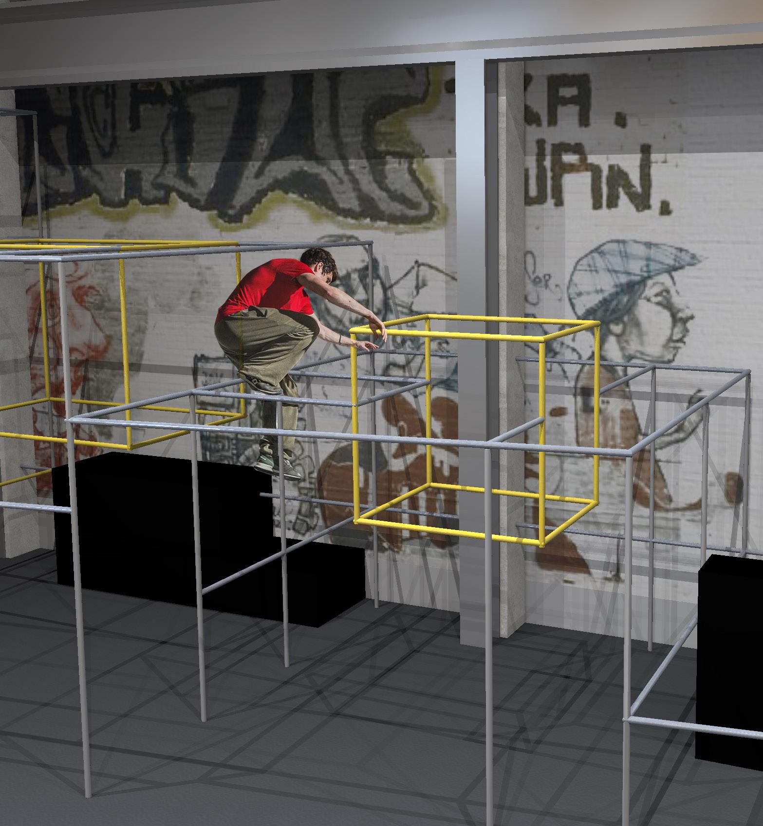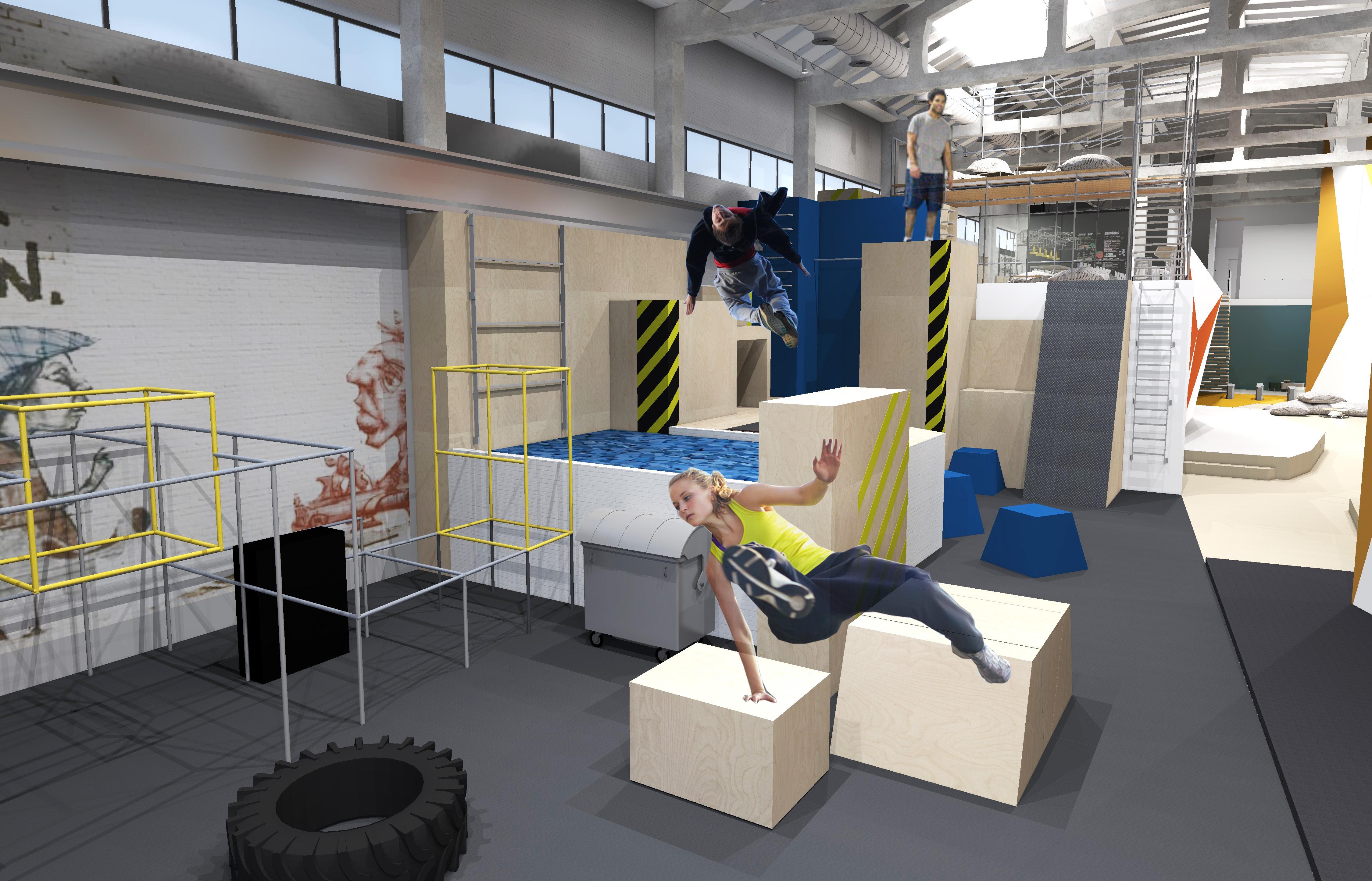 Siekiant komunikacijos ir bendravimo tarp skirtingų sporto šakų, erdvė nėra atskiriama ar uždaroma nuo laipiojimo zonos. Parkūrui skirtos kliūtys pakyla iki antrojo aukšto, kuriame yra poilsio zonos kostrukcija.