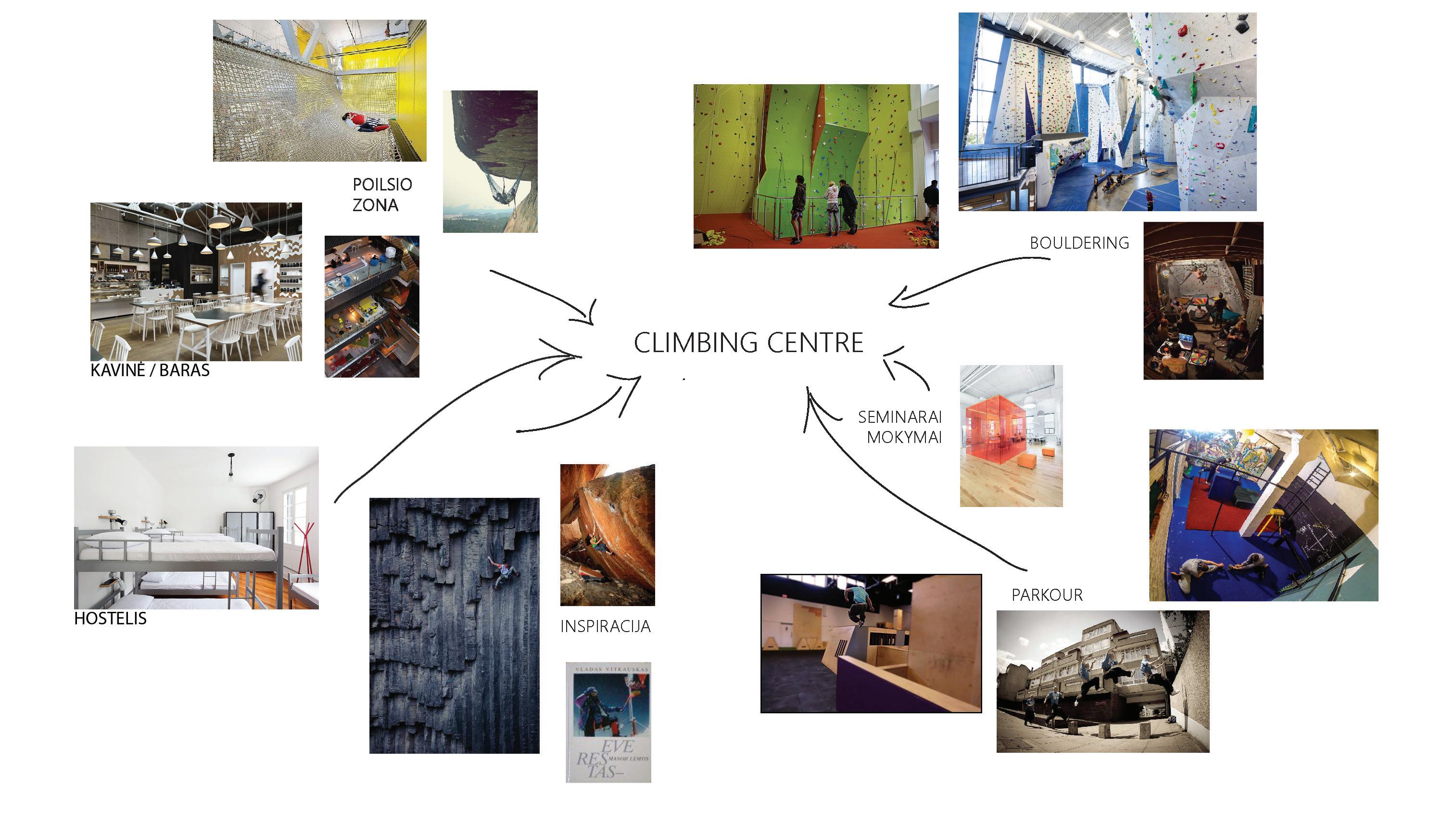 Laipiojimo salėje išnaudojamas maksimalus lubų aukštis, todėl galima suprojektuoti kelių rūšių sienas - 5 m, 6 m ir 10m. Poilsio zons išsidėsčiusi aplink čiūžinius. Jos atlieka netik poilsio funkciją, bet ir pakilimo ant laipiojimo čiūžinio.