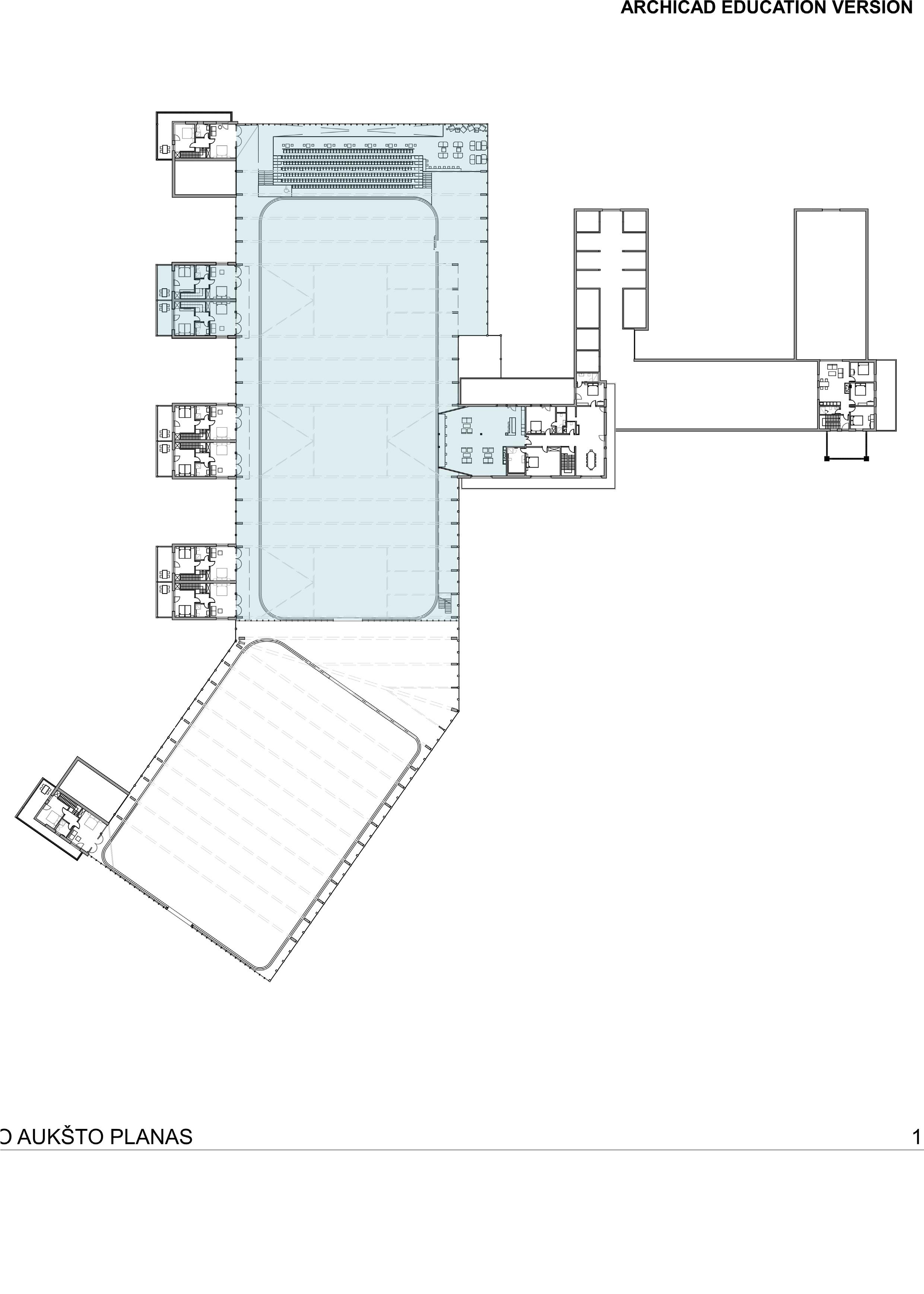 Projektuojamas naujadaras - tribūnų erdvė, kuri įtraukia į projekto siužetą dar vieną veikėją - žiūrovą. Pirmame aukšte įrengiama rūbinė, san. mazgas ir kavinė - mini baras skirtas aprūpinti žiūrovą gėrimais ir užkandžiais. Norint kavinės zonai suteikti lengvumo ir skaidrumo įspūdį, vienoje pusėje montuojama vitrina, kitoje - iškertama anga sudarydama galimybę žiūrovoj prieiti prie baro ne tik iš vidinės bet ir iš išorinės pusės.