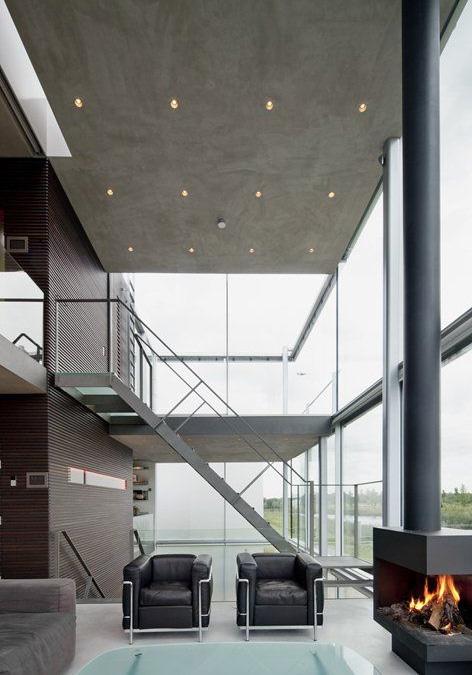 Lokacija, kurioje pastatas įsikūręs, apsuptas gamta pabrėžia - natūralumą. Interjero projekte naudojamos natūraliomis medžiagos - betonas, natūralus akmuo, medis, akmuo, oda.