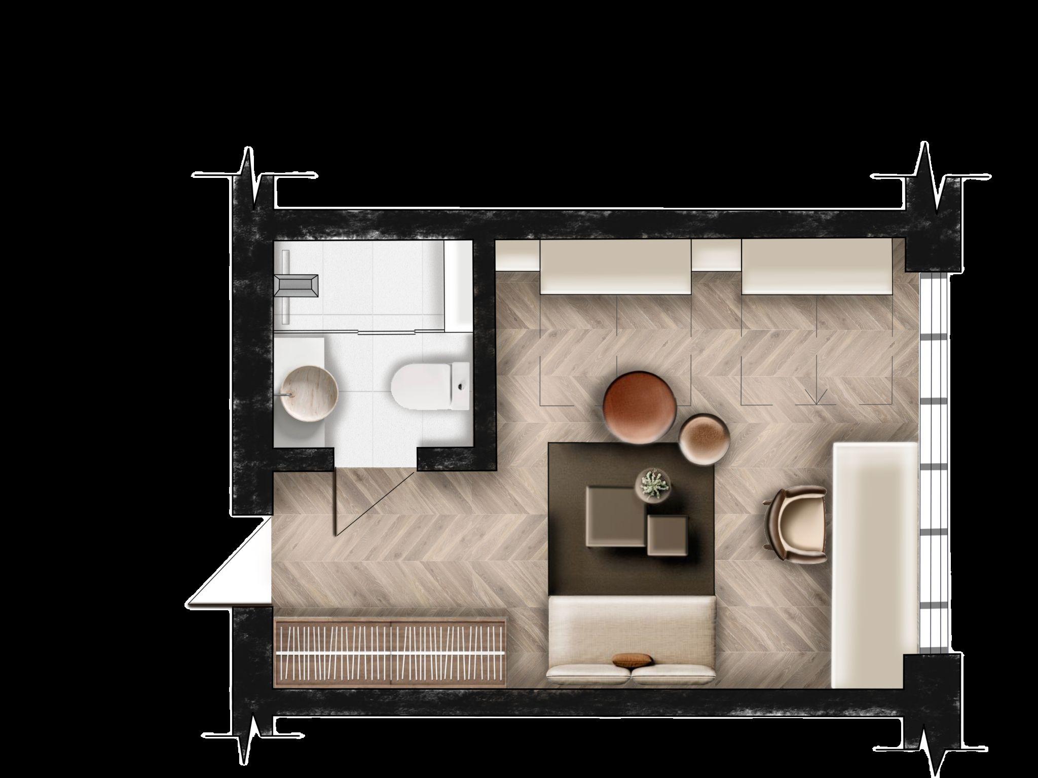 29. IIa. Planas. Šeimos kambaris, tėvai + vaikai.. Medžiagos išdėstimas (autorės iliustracija, suproektuota SketchUp ir iArtbook programėlyje, 2024)
