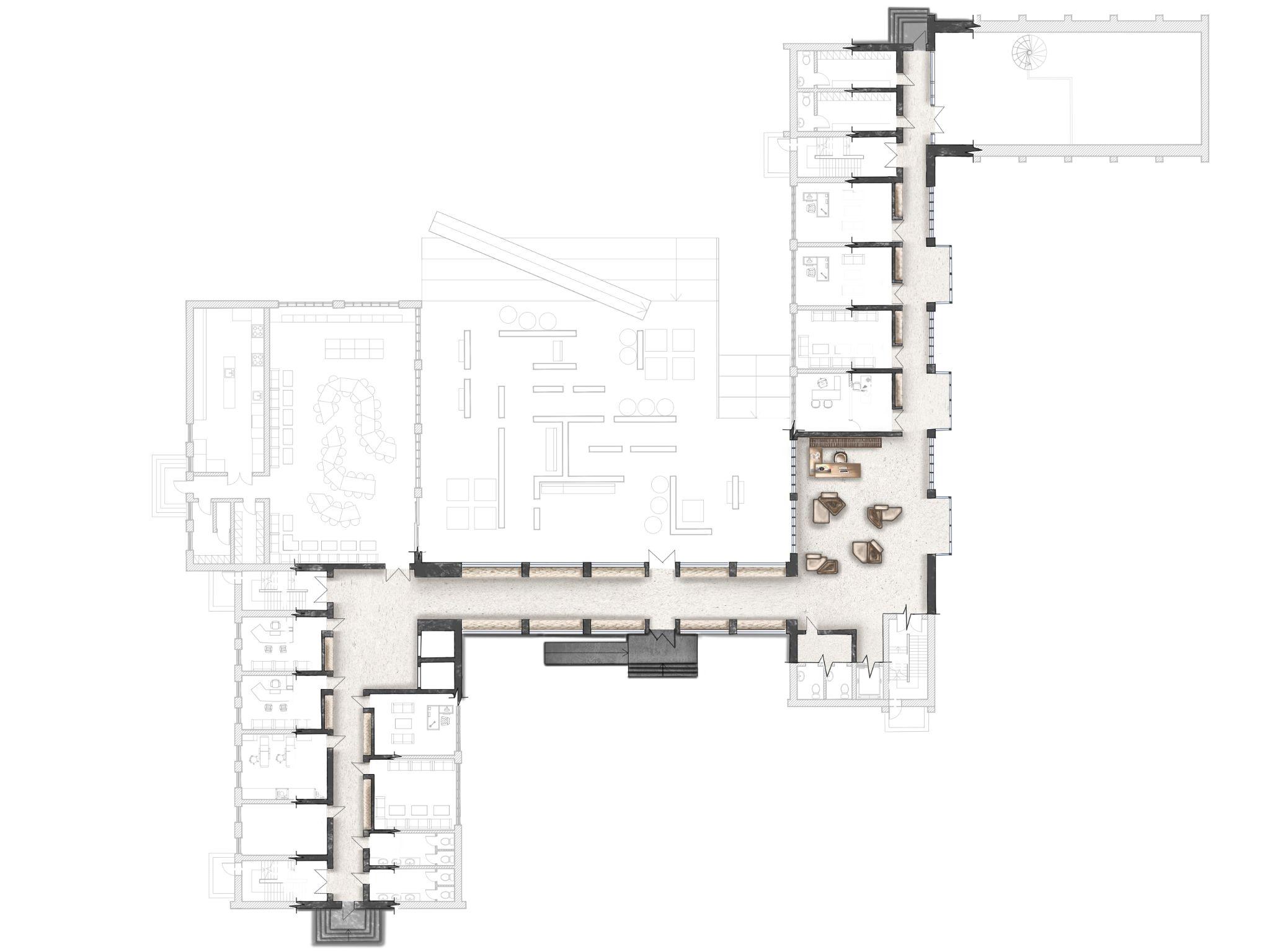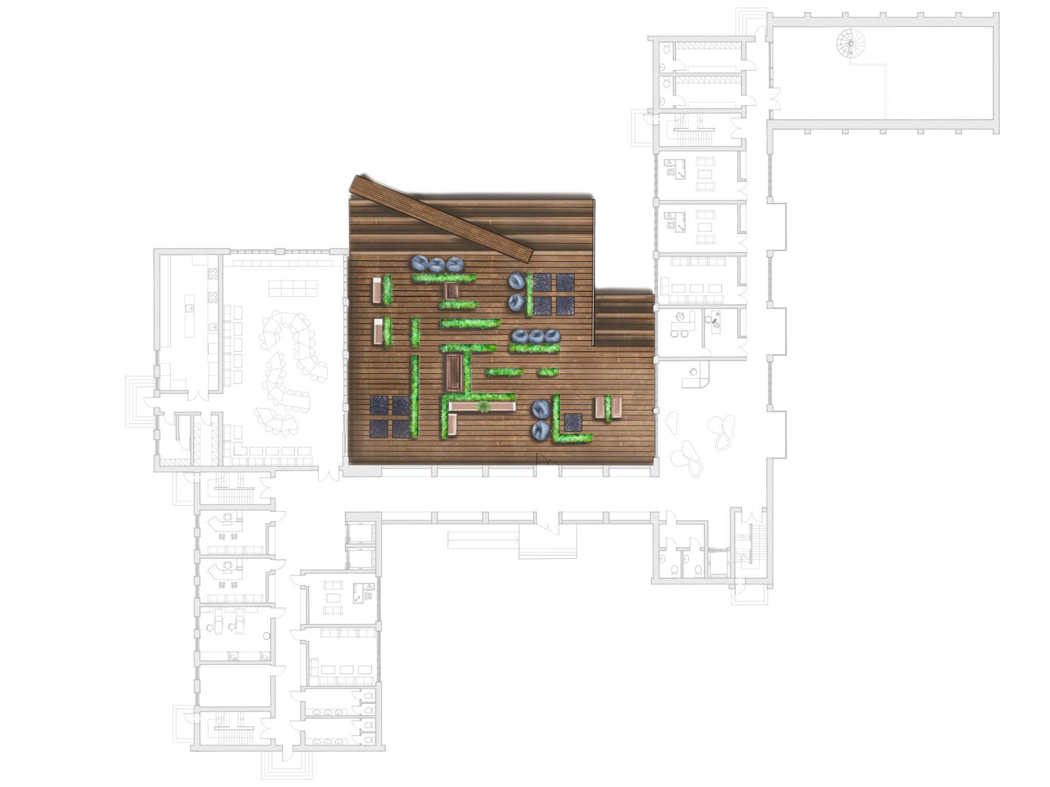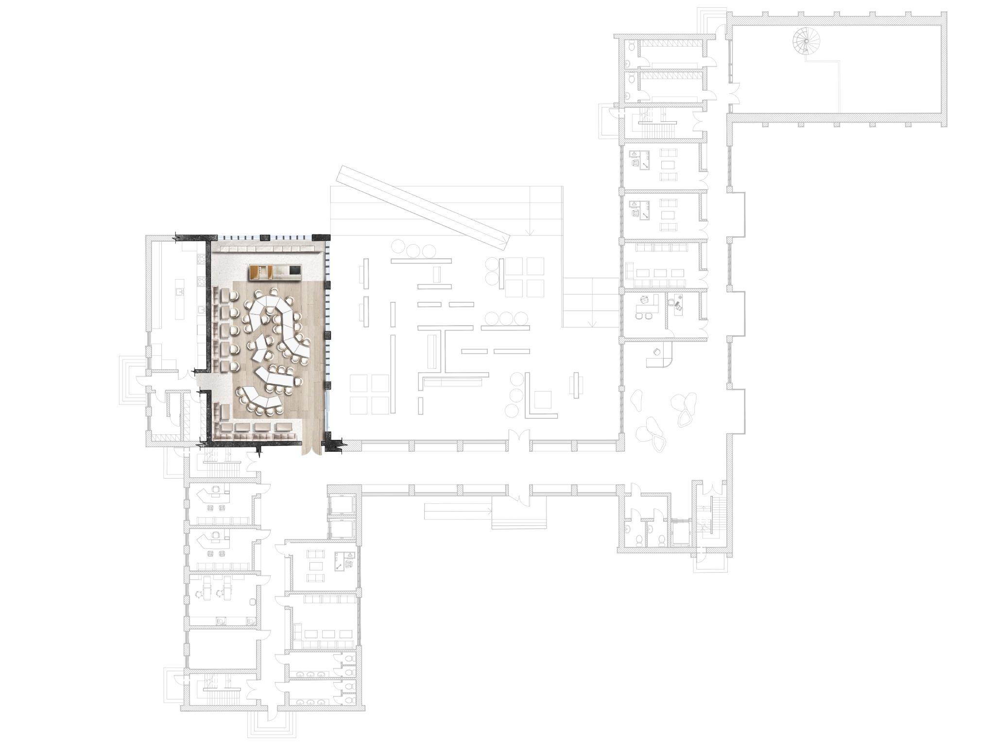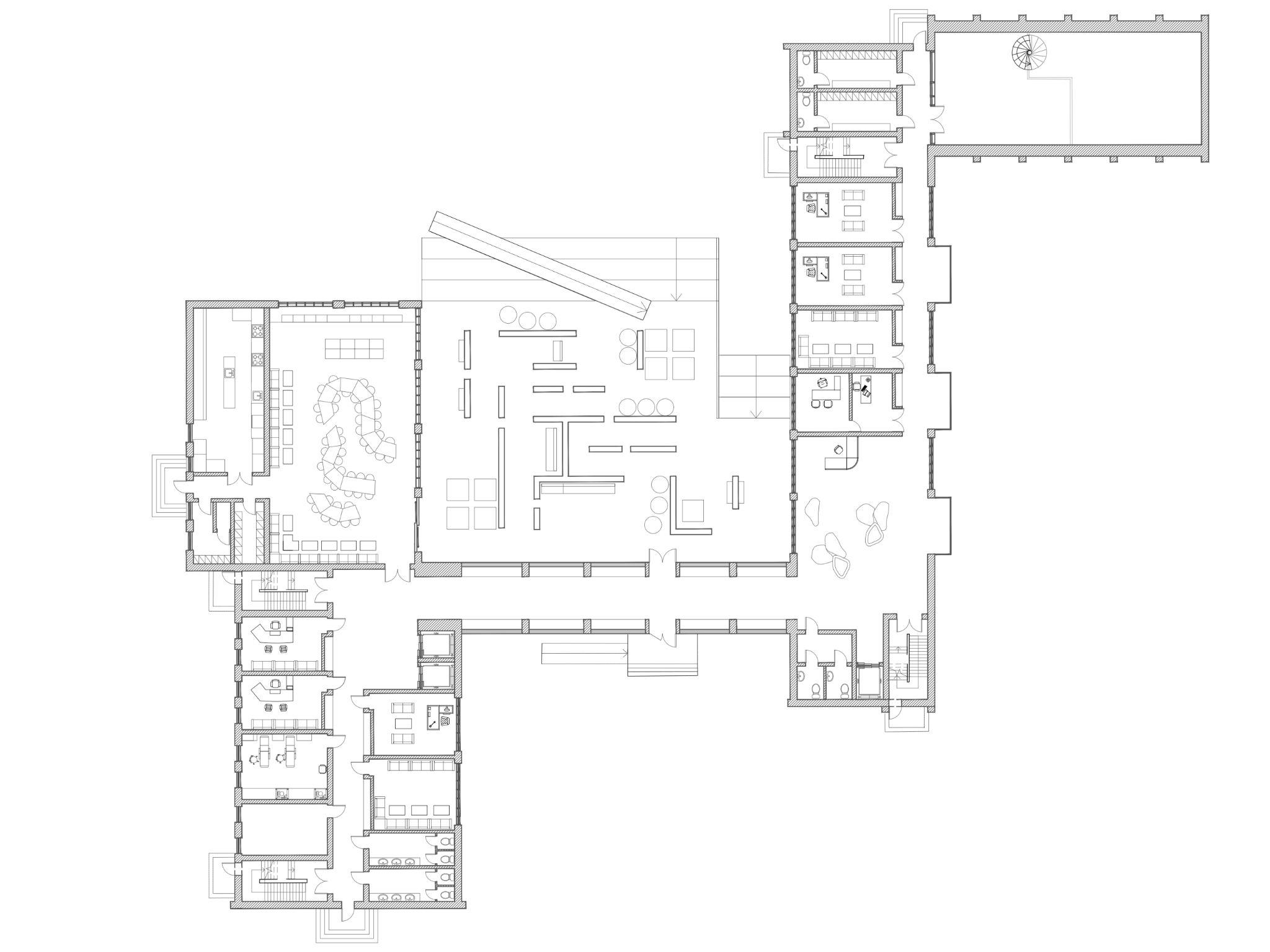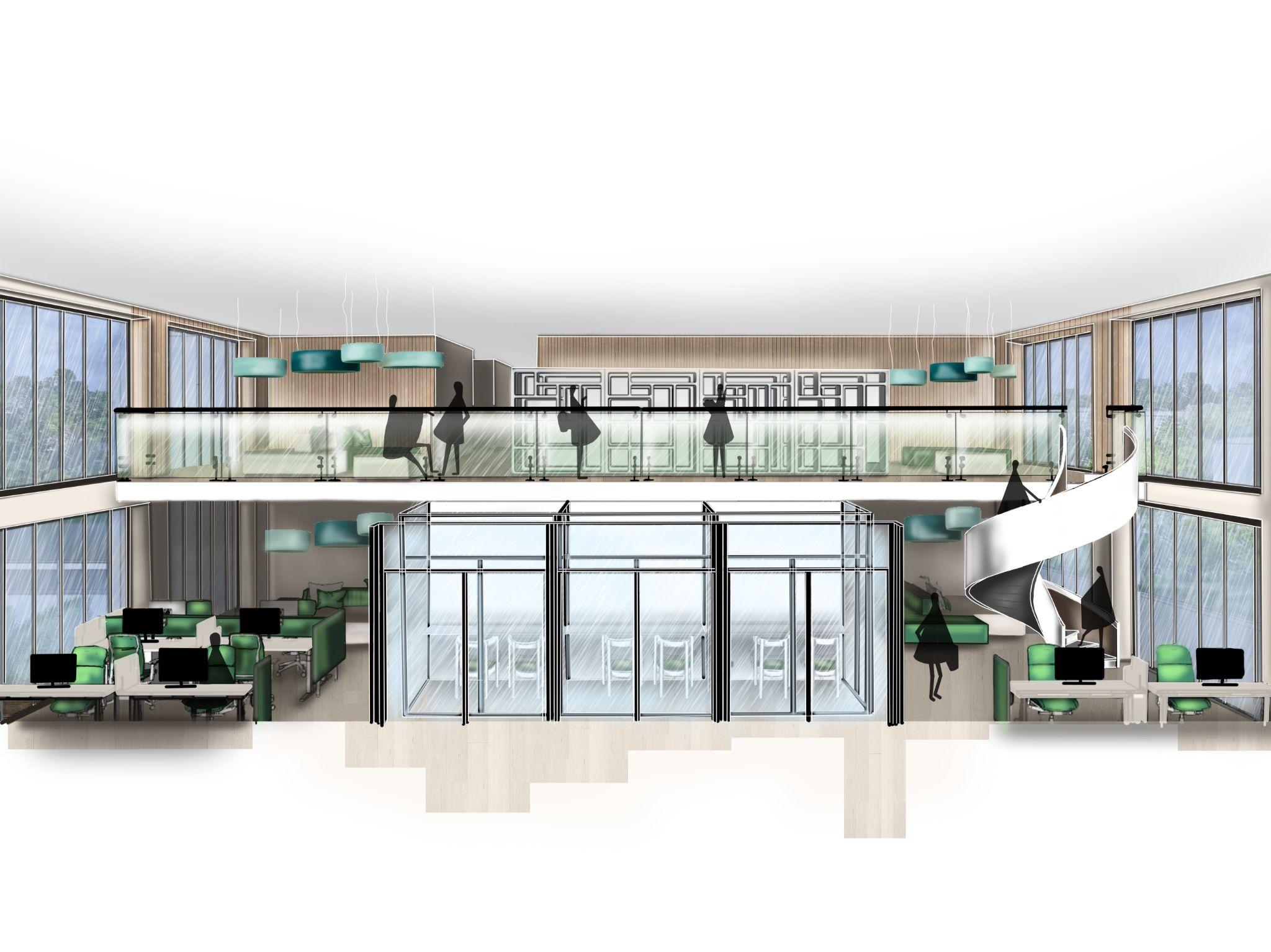 Modernaus dizaino ir ryškių spalvų baldai, pvz. žalios spalvos kėdės ir turkio spalvos akcenta suteikia gyvybės ir energijos. Aptakios formos knygų lentynos ir stalaiužtikrina,erdvėsjausmairtarpjųlengvaorientuotis.Lentynomsirskydams panaudota mediena suteikia aplinkai šilumos ir taip subalansuoja stiklo ir metalo konstrukcijųderinį.