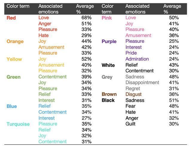 1 lentelė. Dažniausios spalvų ir emocijų asociacijos 30 šalių. Procentai rodo, kiek žmonių pasirinko kiekvieną asociaciją. Šaltinis: Domicelė Jonauskaitė ir Christine Mohr (2019)