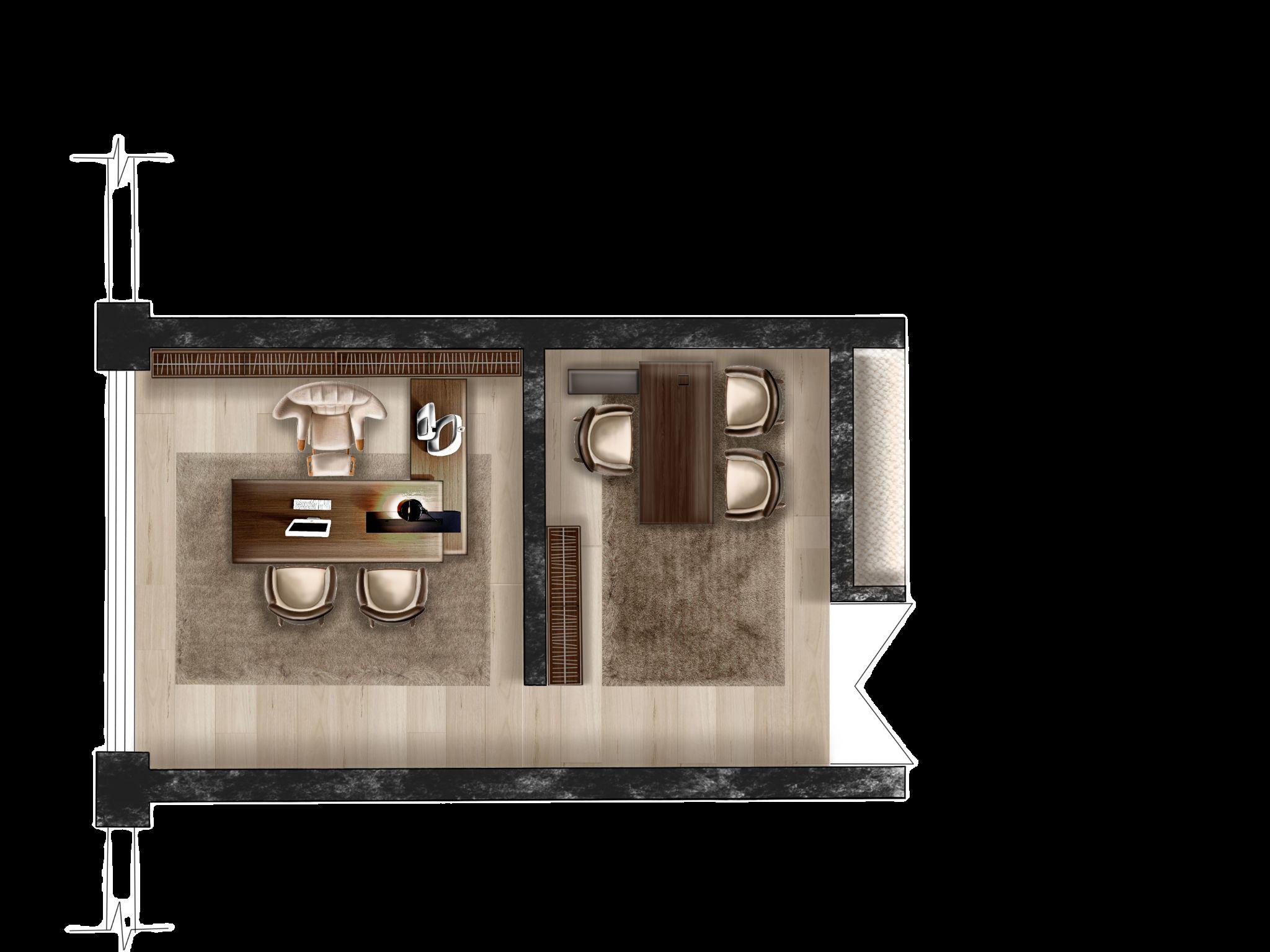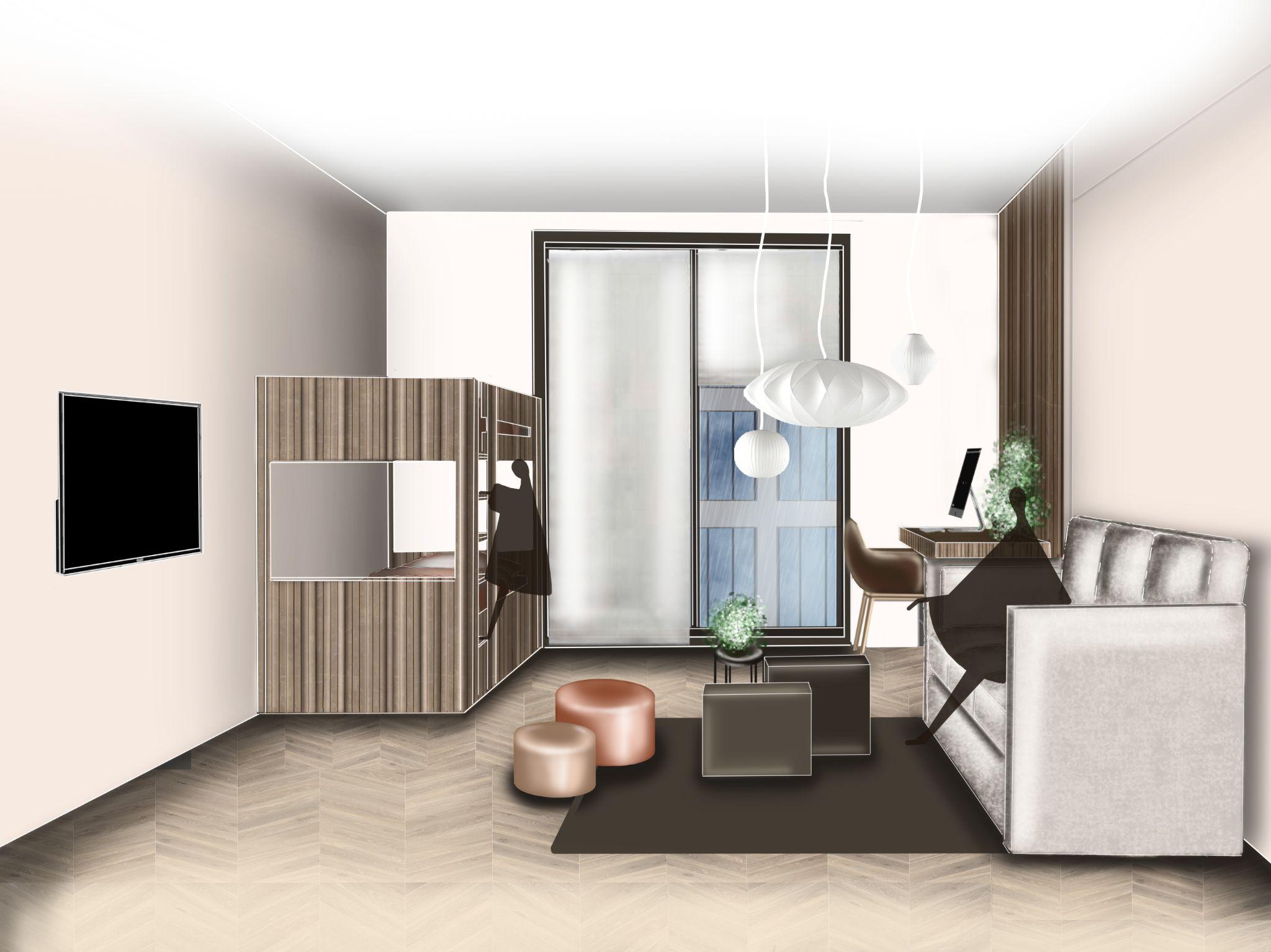 Antro tipo kambarys pritaikytas vaikams, gyvenantiems su tėvais reabilitacijos centre. Daugiausia dėmesio skirta daugiafunkcinei erdvei, kurioje būtų galima gyventi su šeima, ta iau būtų išlaikytas šiuolaikinio stiliaus ir komforto jausmas. Šiame kambaryje integruotos lanks ios miegamojo vietos su tėvams skirtomis spintelėmis ir (arba) sulankstomomis lovomis ir specialiai vaikams skirtomis dviaukštėmis lovomis, užtikrinant, kad kambarys galėtų būti prisitaikytas prie šeimos poreikių, nesumažinant erdvės dienos metu. Estetika yra lakoniška ir moderni, neutrali spalvų gama suteikia ramybės ir komforto jausmą. Įrengta daiktu laikymo sistemą, kurį tarnauja kaip kambario pertvarą, užtikrinanti privatumą ir erdvės zonavimą. Šiame bloke integruotos vietos stalui ir lentynoms, padedantisužsiimtiįvairiaveikla-nuomokymosiikilaisvalaikio.