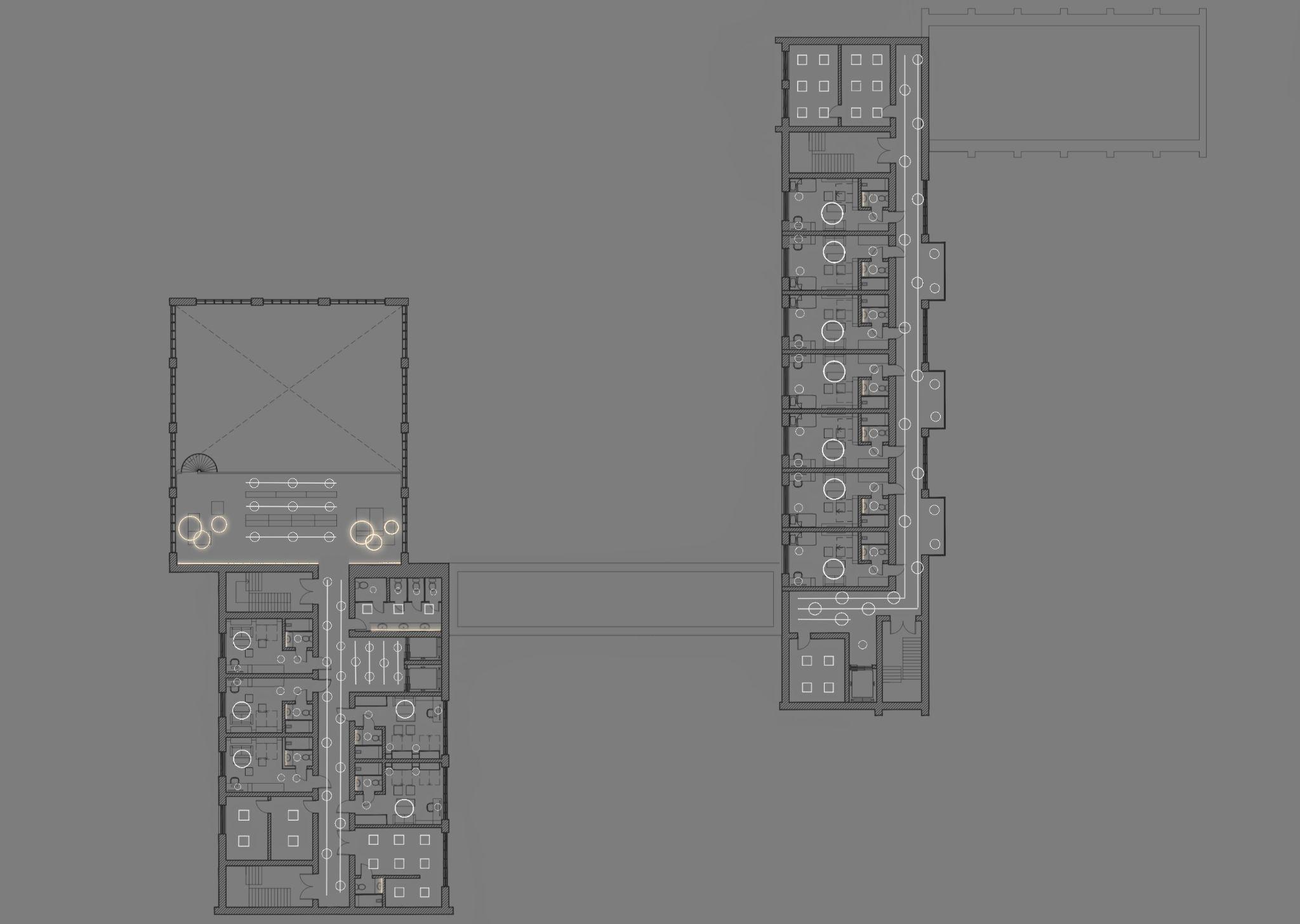 31 pav. „Vievio“ sanatorinė misko mokykla; Dvaro g. 1, Paneriai. IIIa. Planas naujo patalpų išdėstymas (autorės iliustracija, suproektuota SketchUp programėlyje, 2024)