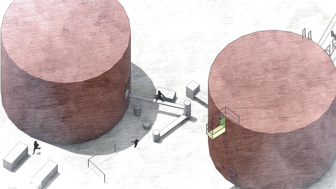Projektuojama stoginė, dengianti judėjimo plotą tarp laukiamosios, persirengimo/apšilimo ir sporto "bačkų". Struktūra apsaugo žmones nuo tiesioginių kritulių, neleidžia žemės dangai tapti slidžiai, atsirasti purvui. Stogą laikančios konstrukcijos išnaudojamos parkūro treniruotėms.