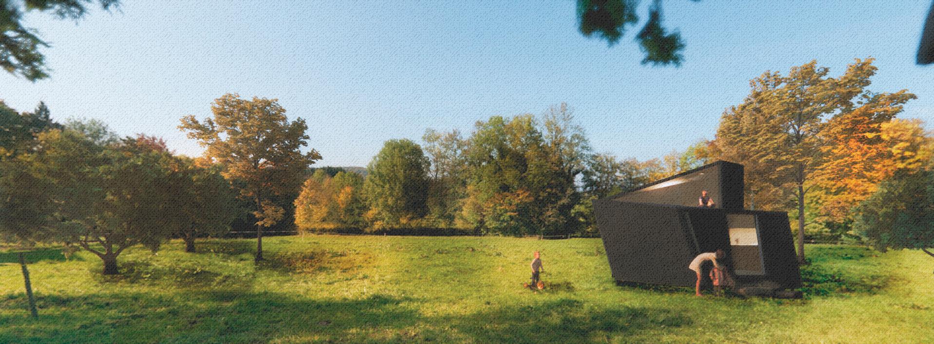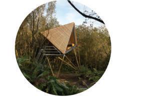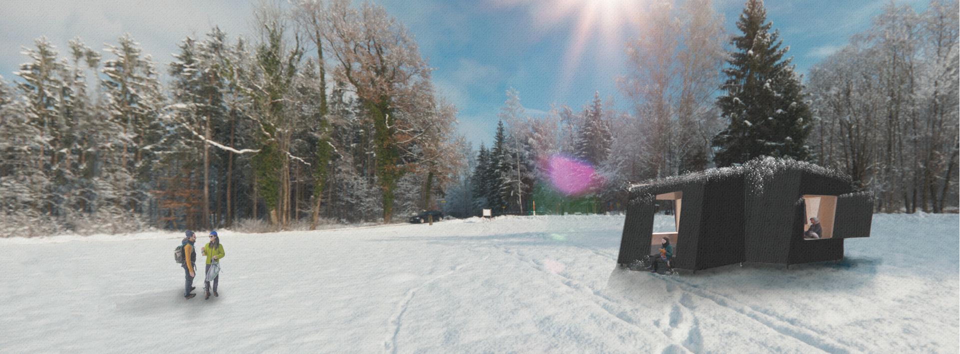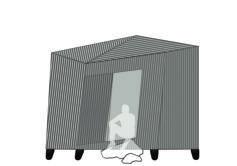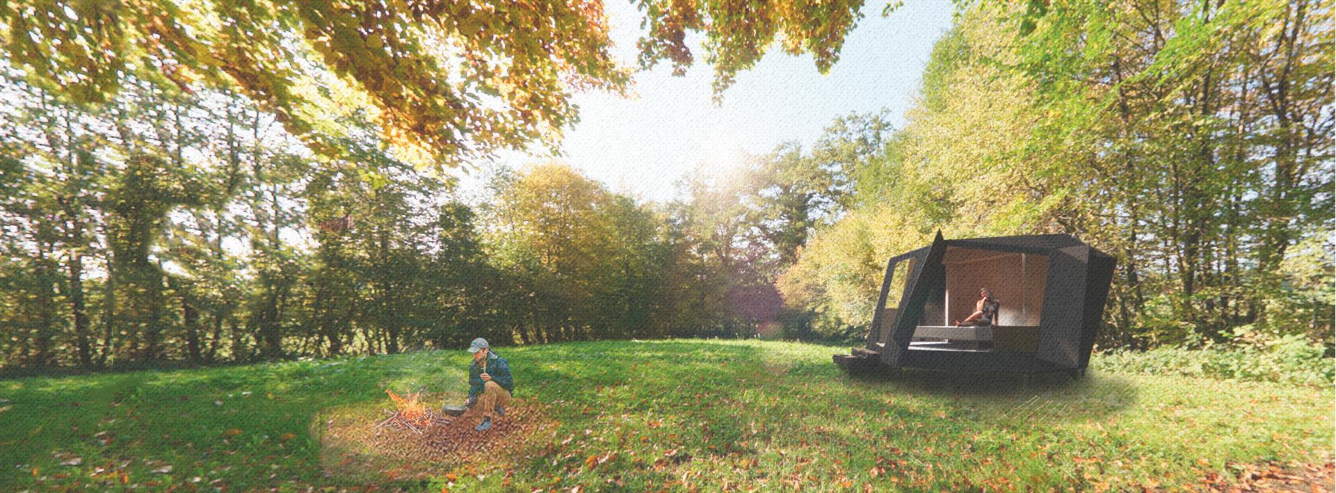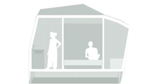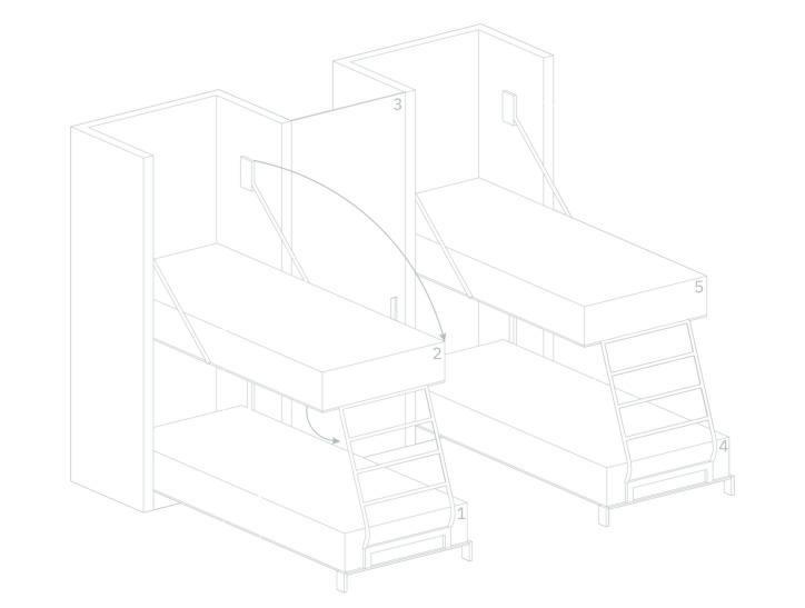 18m² namelis projektuojamas keturiems draugams, kuris veidrodiškai jungiasi su lygiai tokiu pat. Multifunkcinė erdvė apima atsilenkiančias dvi dviaukštes lovas ir stalą.