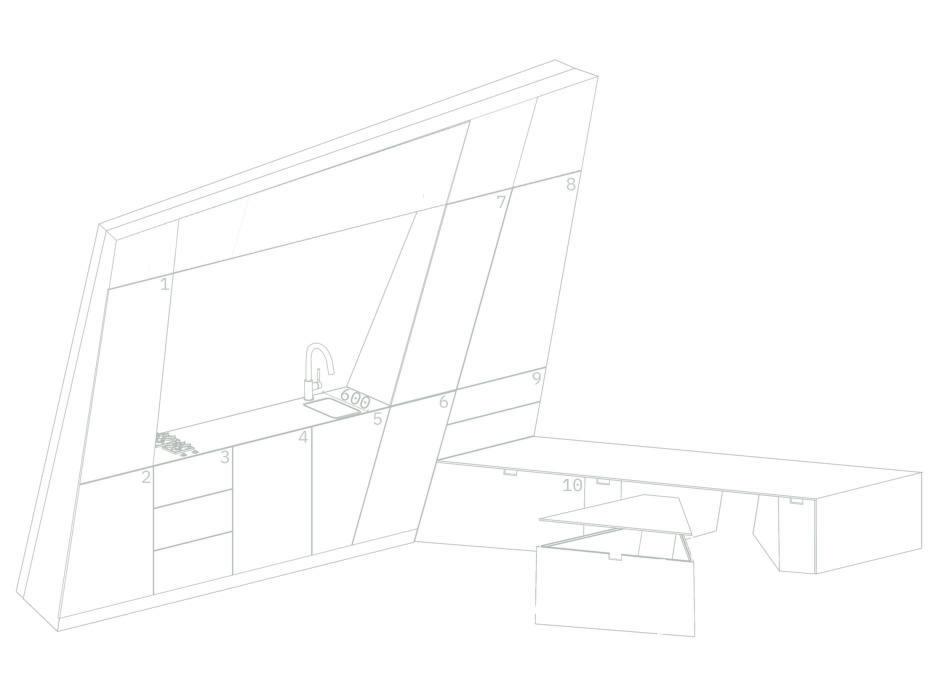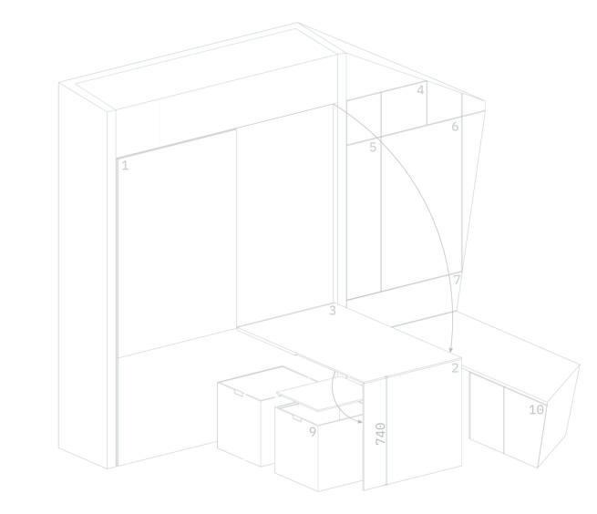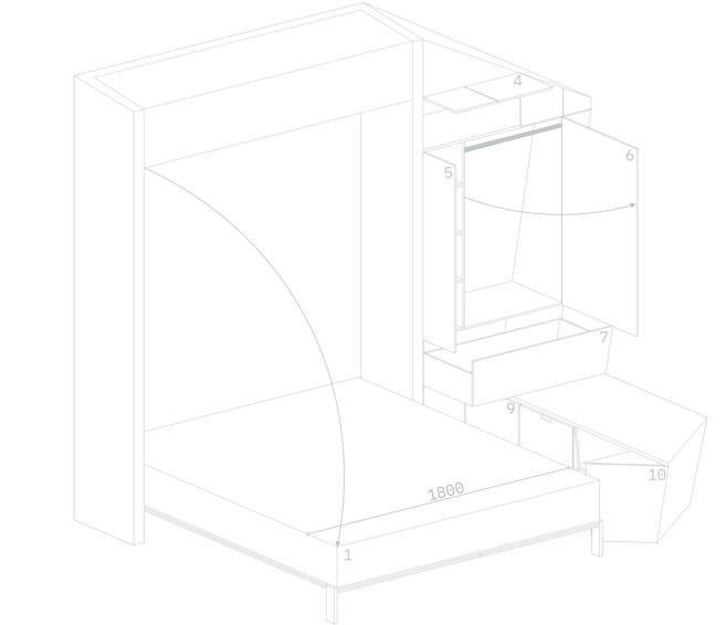 17 Multifunkcinio baldo detalizacija Atlenkiamo stalo, lovos, sandėliavimo bei poilsio vietos detalizacija 1 - Atlenkiama dvigulė 2000 x 1800 lova 2 - Atlenkiamo stalo koja 3 - Atlenkiamas stalas 4 - Spintelė su tip-on atidarymo technologija 5 - Spintelė su lentynomis ir tip-on atidarymo technologija 6 - Spinta su kabykla ir tip-on atidarymo technologija 7 - Stalčius su tip-on atidarymo technologija 8 - Spintelė su tip- on atidarymo technologija 9 - Pufai su sandėliavimu 10 - Spintelė su tip-on atidarymo technologija