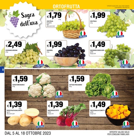 ORTOFRUTTA 8 OFFERTE VALIDE SOLO PER CONSUMI FAMILIARI *OFFERTE VALIDE PER I SOLI PUNTI VENDITA CON REPARTO ORTOFRUTTA DAL 5 AL 18 OTTOBRE 2023 €1,79 UVA ITALIA bauletto kg 2 alla conf. € 3,58 100% ITALIA al kg €1,99 UVA ITALIA al kg 100% ITALIA €2,49 UVA BIANCA REGINA al kg 100% ITALIA €1,99 UVA NERA al kg 100% ITALIA €1,49 UVA BIANCA SENZA SEMI g 500 al kg € 2,98 100% ITALIA €1,59 CAVOLFIORE BIANCO al kg 100% ITALIA €1,59 LATTUGA TROCADERO al kg 100% ITALIA €1,39 PATATE PASTA GIALLA RETE kg 1,5 alla conf. € 2,09 100% ITALIA al kg €1,39 RAPE ROSSE COTTE g 500 al kg € 2,78 100% ITALIA €1,49 ZUCCA GIALLA A CUBETTI g 400 al kg € 3,63 100% ITALIA