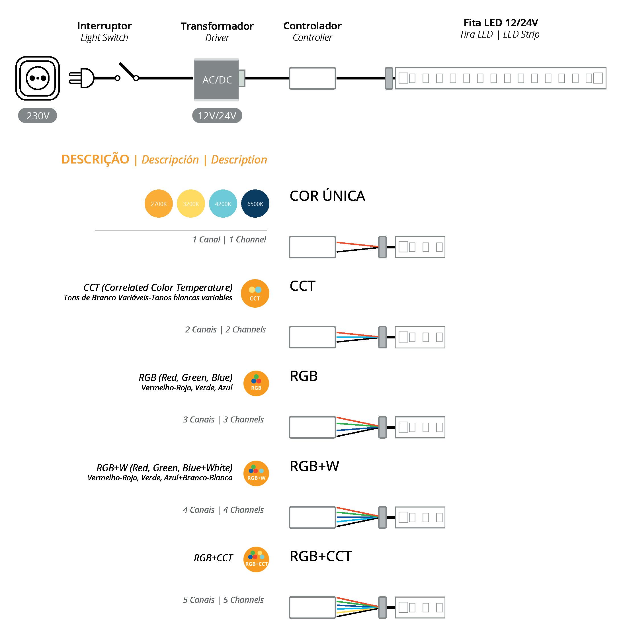 Para fitas de tensão reduzida (12-24VDC) é necessário escolher um transformador. Multiplique a potência (W) da fita escolhida pelos metros pretendidos, e obtenha a potência do transformador adequado.