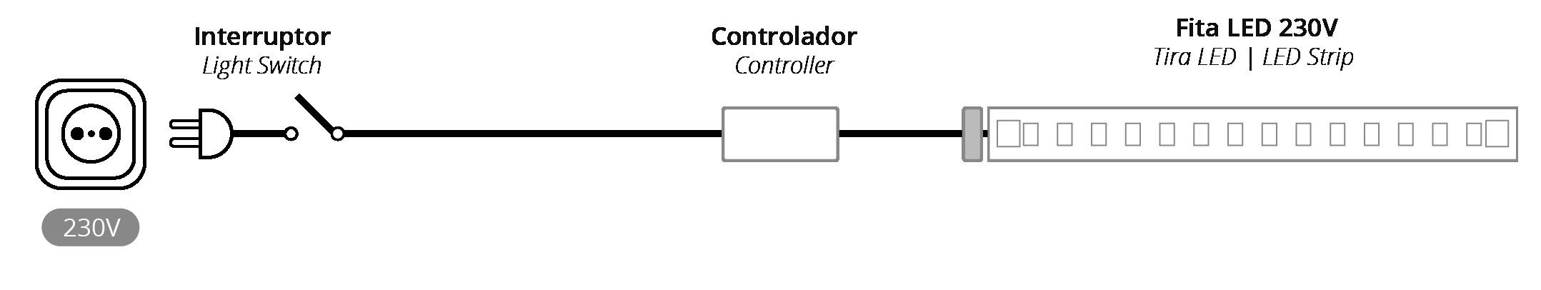 • A montagem e isolamento das fitas 230VAC devem ser executadas por um proficional qualificado. Declinamos qualquer responsabilidade em caso de dano.