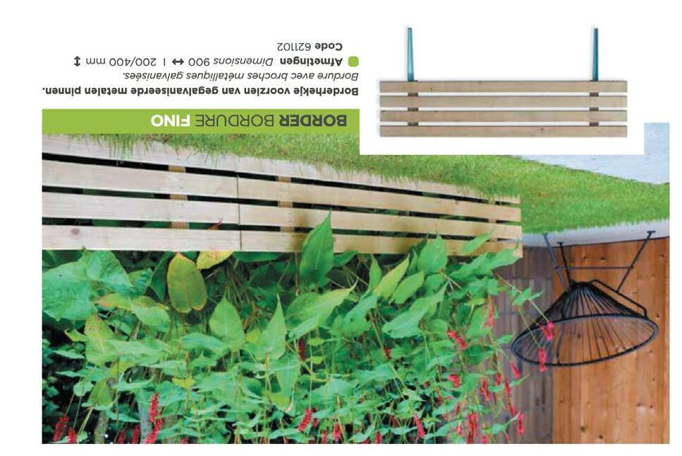 www.dipenda.be &dipda &huistuin Turnhoutsebaan 170 - 2400 Mol - www.hobbyland.be ook open op zondag Graanmengeling met een 3mm legkorrel 8 1099 Hekwerk Nicolette 800x1800mm 9914 Border Fino borderhek voorzien van gegalvaniseerde metalen pinnen. 900 x 200/400mm Paris – 280 x 1150 mm Decoratief borderhekje in grenen Makkelijk in de grond te plaatsen of te verzetten Impregnatieklasse 3 voor een lange levensduur Orba – 225 x 900 mm 996 995 9910 994 Rondhout - gefreesd en gepunt Ø60 x1000mm : 1,99 Ø60 x1200mm : 2,99 Ø60 x1400mm : 3,49 Ø60 x1600mm : 3,99 Ø60 x1800mm : 4,49 Ø60 x 2000mm: 4,99 991 Blokhutplank in geïmpregneerd grenen 21 x 120 x 1800 mm : 3,99 3 Geschaafd hout geïmpregneerd grenen planken 15x140x1800mm 992 POWXG6150 Elektrische grasmaaier