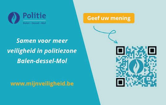 Wat jij denkt, telt. De politiezone Balen-Dessel-Mol wil weten hoe jij veiligheid ervaart in je buurt, op weg naar school of werk, of tijdens je vrije tijd. Met jouw input maken ze werk van een doordacht en effectief veiligheidsbeleid. Vul de enquête in via www. mijnveiligheid.be en maak mee het verschil!