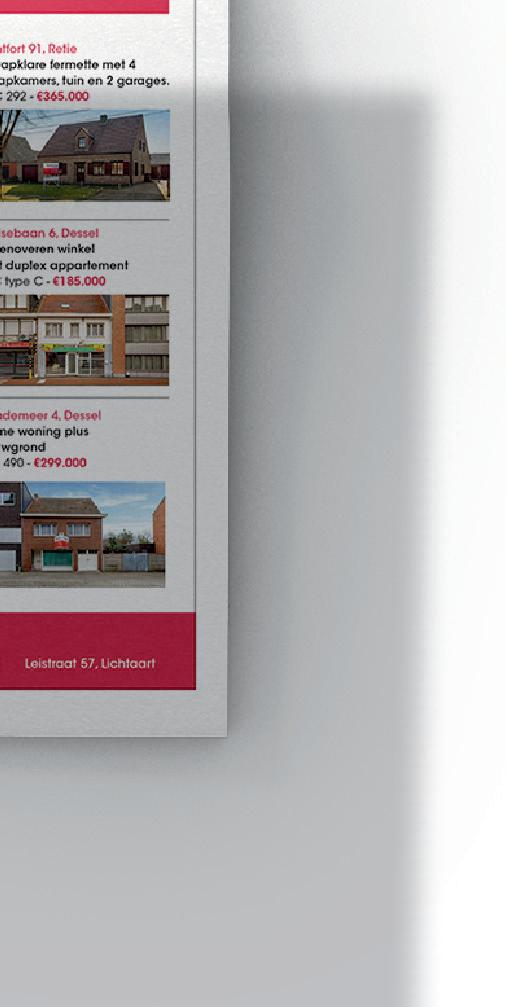 3SHOP veilig KANTOOR ZUID EIKENLEI 2 2960 ST.-JOB-IN-’T-GOOR KANTOOR NOORD GEMEENTEPLAATS 17 2960 BRECHTPERSOONLIJK • DESKUNDIG • GEDREVEN GRATIS WAARDEBEPALING T. 03 636 47 47 www.coga.be Verzorgde villa op 2.725m², rust. gel., Liv., kk, 4 slk, 2 badk, polyv. rmte (50m²), dubb. inpand. gar., mooie parktuin. € 695.000,00 T. van der Vekenlaan 10: EPC: 288 kWh/m² Sted. inlichtingen in aanvraag Renovatieproject HOB op 823m² centr. gel. Liv., bureel, open kk, 5 slk, 2 badk zold., kelder (60m²), tuin mt terr.,... € 725.000,00 Bredabaan 110: EPC: 622 kWh/m Gvg-Wp-Gmo-Gvkr-Gvv Ruime villa op 2.058m2, rustig gel. Liv., eetkk + bijkk, 4 slk, 3 badk, zolderkamer, gar., tuin met terr., zwemb, tuinhuis,... € 795.000,00 Riemstraat 83: EPC: 258 kWh/m Sted. inlichtingen in aanvraag Handelspand met appartement op 2.325m². App. 174m²: 4 slk dakterr. 30m², tuin, gar. 90m², handelsrmte 204m². € 845.000,00 Stationsstraat 184: EPC: 202 kWh/m² Vg-Wg-Gmo-Gvkr-Vv Gelijkvloerse woning op 1.081m2, centr. gel. Liv., kk, badk, 2 slk (uitbreid. mog.), zold., omh. tuin, garagebox,... € 469.000,00 Bergsebaan 92: EPC: 304 kWh/m2 Vg-Wg-Gmo-Gvkr-Gvv Nieuwbouwwoning op 805m², groene omg. Liv., kk, 4 slk, badk, dressing, bergzolder, ZW-tuin. Energiezuinig! € 509.000,00 Mieksebaan 107: EPC: Max. E20 Sted. inlichtingen in aanvraag Gelijkvloers landhuis op 1.164m² landelijke omg. Liv., kk, badk, 3 slk, zolder, kelder, garage, tuin met terr.,... € 515.000,00 Eyndovensteenweg 113: EPC: 439 kWh/m2 Vg-WgLk-Gmo-Gvkr-Vv Landhuis 665m² op een toplocatie. Liv., kk, badk, 4 slk, zold., keld., inpand. gar., tuin met terr., zwemb., poolhouse. € 635.000,00 Kleine-Beekstraat 8: EPC: 171 kWh/m2 Sted. inlichtingen in aanvraag Excl. luxe duplex dakapp 240m², in centr, 4 slk, 3 badk, 2 grote terrassen, 3 gar. + 2 stnplts.,… € 695.000,00 Schooldries 13: EPC: 106,92 kWh/m² Vg-Wg-Gmo-Gvkr-Gvv Gerenov. bel-etage op 169m², rustig gel., Leefrmte, nwe kk, nwe badk, 4 slk, keld., zold., tuin mt terr.,... € 425.000,00 Kruisboogstraat 17: EPC: 328 kWh/m2 Vg-Wg-Gmo-Gvkr-Gvv EKEREN Ruime woning (HOB) op 427m², in centrum. Liv., kk, bureelrmte, vernwde badk, 4 slk, gar., keld., tuin mt terr.,... € 425.000,00 Brugstraat 145: EPC: 226 kWh/m2 Vg-Wg-Gmo-Gvkr-Vv SINT-JOB Gezellig landhuis op 910m², rustig gel., Liv., kk, badk, 2 slk, bureel, dubb. gar., tuin met overdekt terr., zwembad,... € 445.000,00 Albatrosdreef 45: EPC: 209 kWh/m2 Sted. inlichtingen in aanvraag BRECHT-ZUID Charmante woning op 592m², rustig gel. Leefrmte, nwe keuken, bureel, nwe badk, 3 rme slk, ZW-tuin,... € 445.000,00 Wilgenlaan 12: EPC: 237 kWh/m2 Vg-Wg-Gmo-Gvkr-Vv SINT-JOB Gelijkvloerse woning op 1.005m², groene omg. Liv., open keuken, badk, 2 slk, tuin, overdekt terr., carport, serre,... € 448.500,00 Vestlaan 5: EPC: 191 kWh/m2 Vg-Wg-Gmo-Gvkr-Gvv