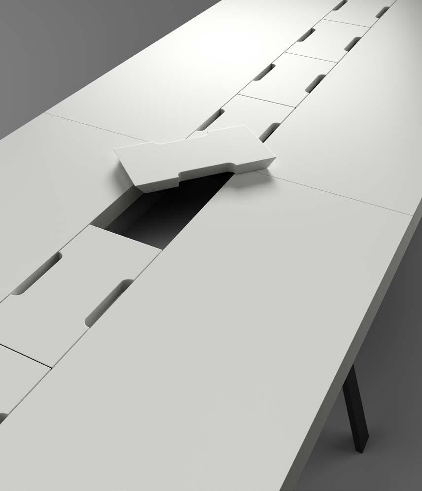 The tops are made of E1 class, extra light, melamine chipboard panels with 50 mm thickness, compliant with the EN 312 rules, with rounded edges made of 2 mm ABS. The standard finishes are, in the monochrome version, matt white and texture cord. The bicoloured version instead, presents the white or cord finish matched with the matt black that characterizes the front of the top longitudinally where a wide cable door is located. The structures are made of steel, with an horizontal element of 30 x 30 mm drawn pipe and legs of 70 x 20 mm rectangular pipe with a black matt epoxy powder varnish finish. The legs, distinctive feature of the collection, are available in the asymmetric X or vertical bridge version. The structures are fitted with an undercounter cabling tray made of varnished bent metal sheet, whose dimensions allow the effortless housing of multi socket plugs. The desks can be fitted with a series of modesty panels and screens made of opal satin PMMA with a smoked grey finish and 10 mm polished edges.