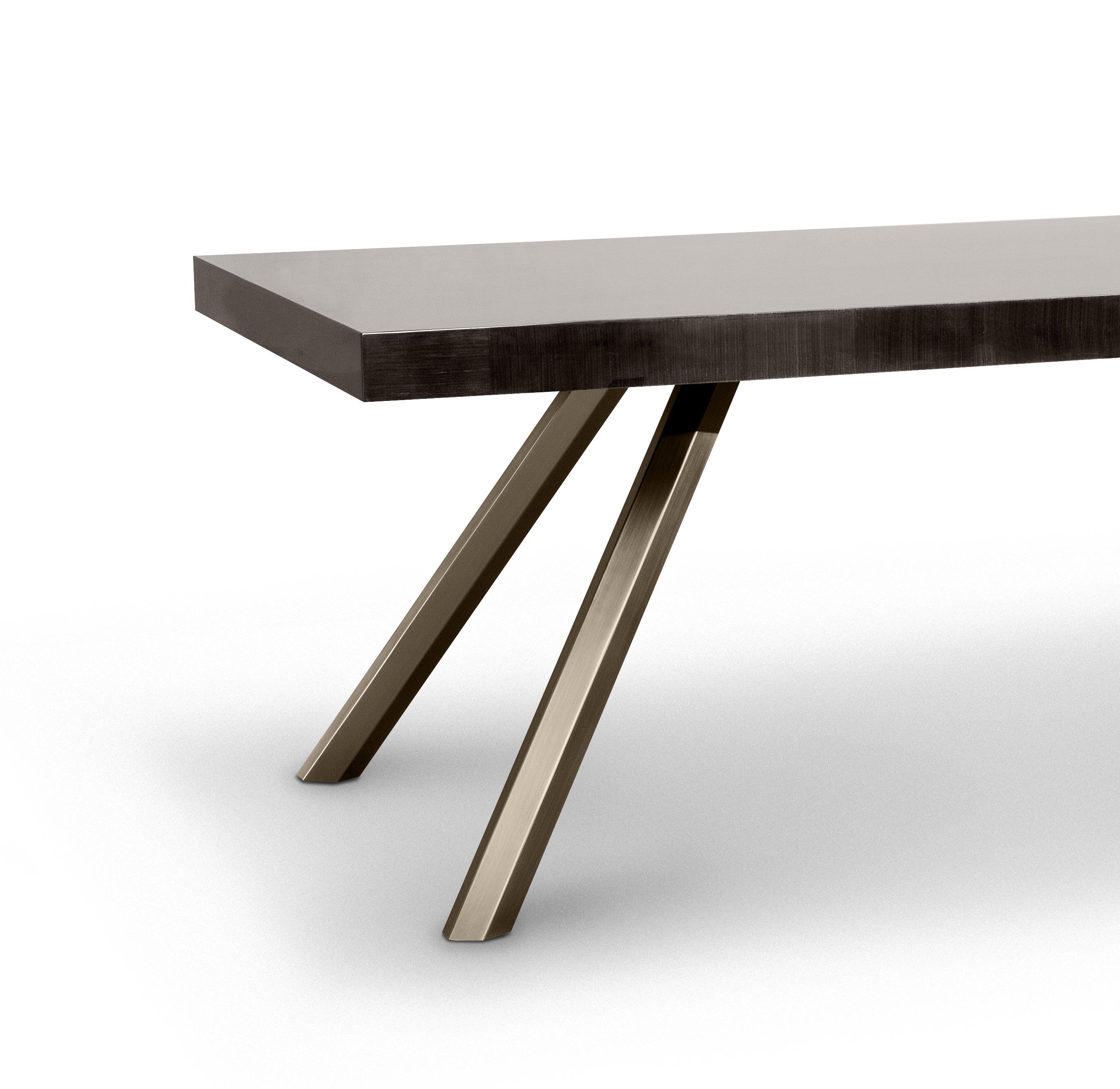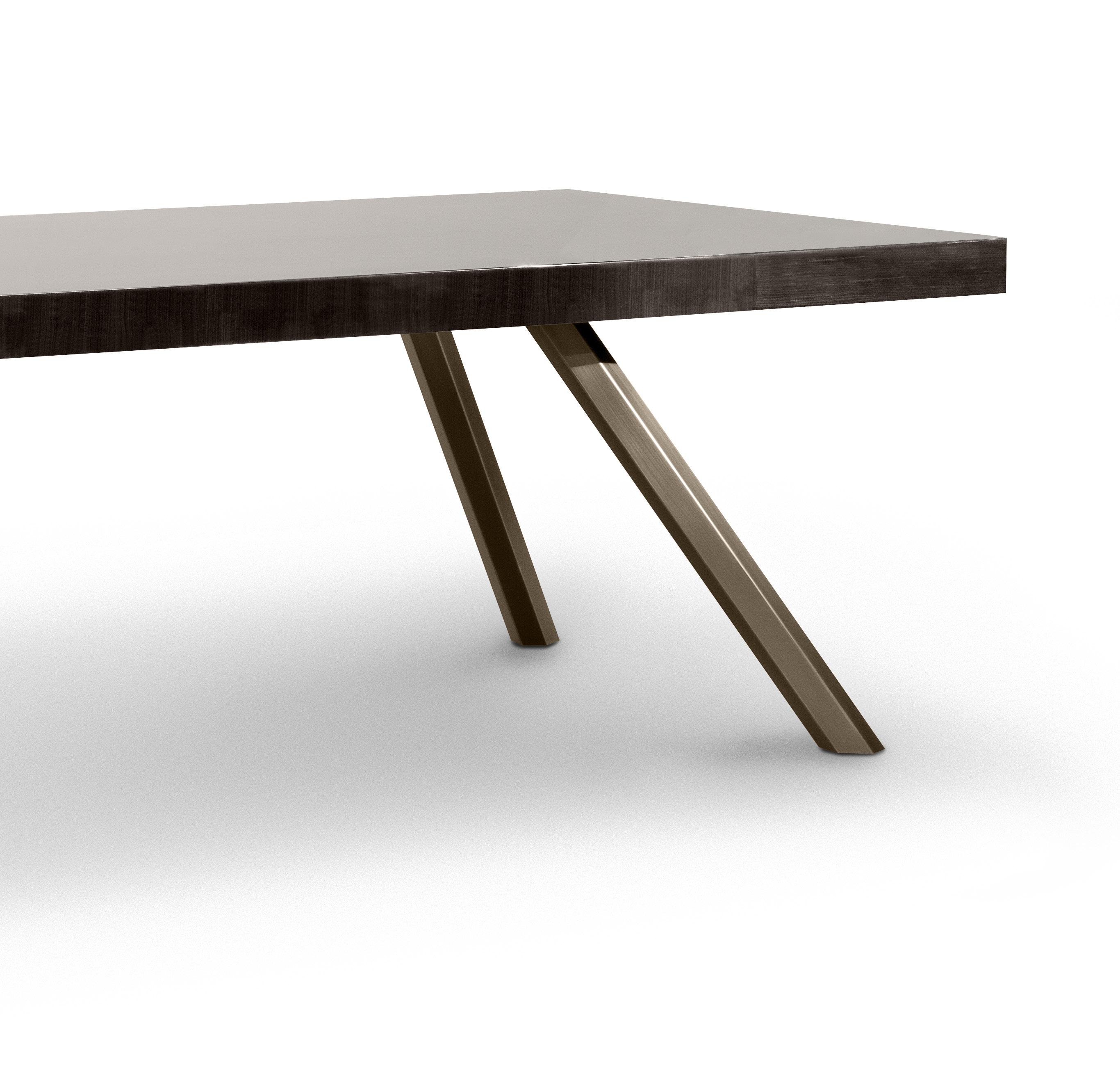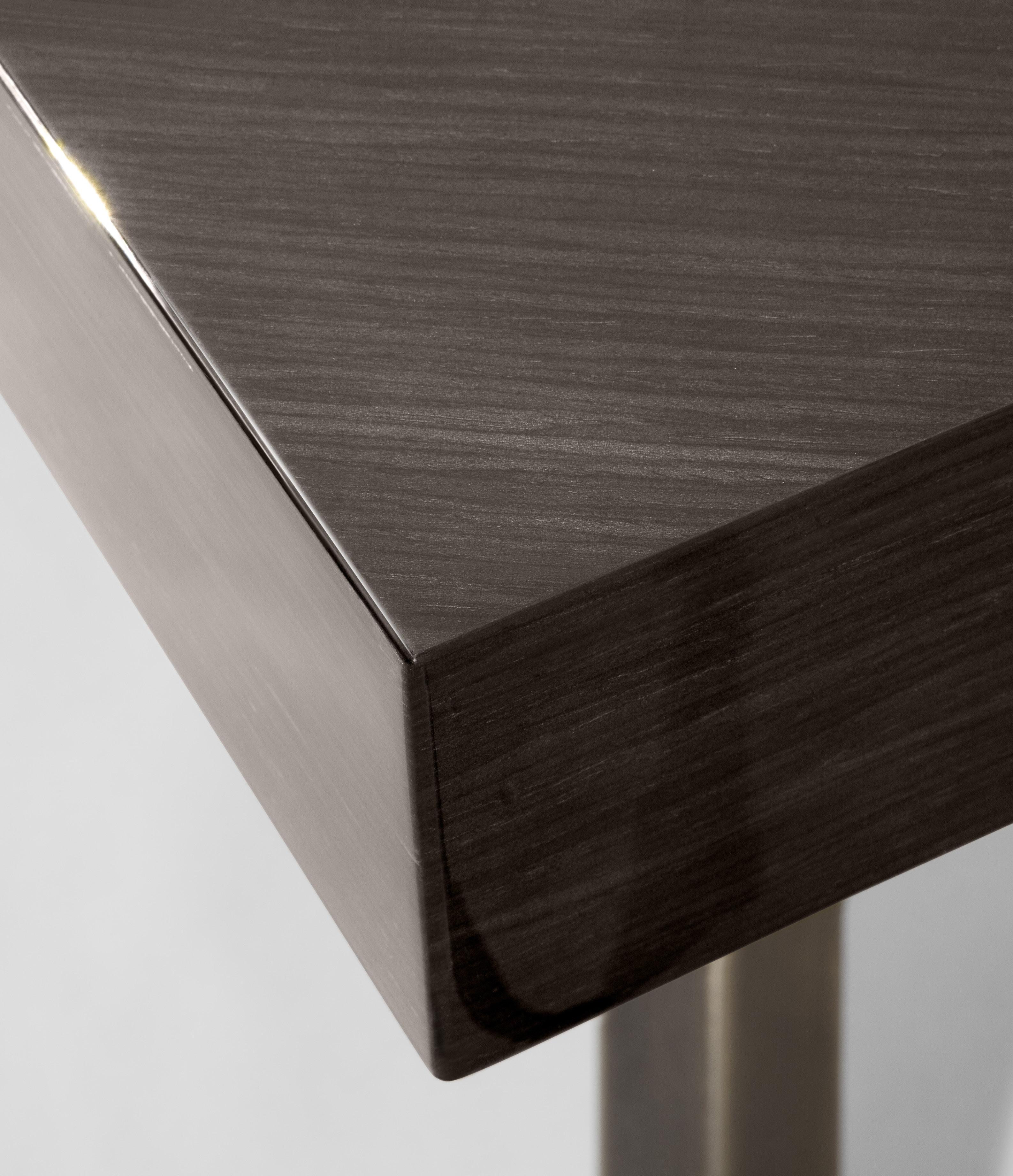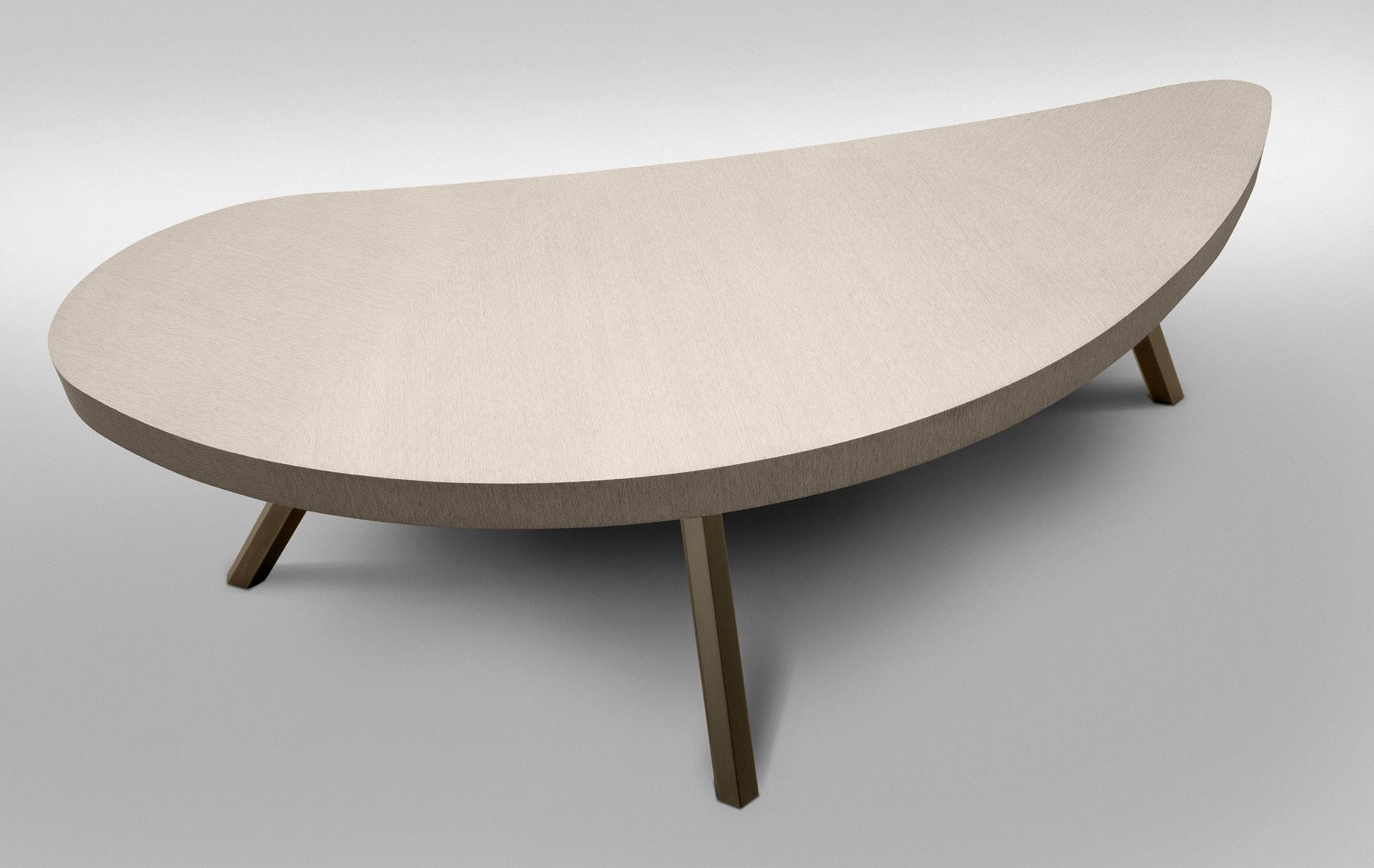 Any design requirement can be satisfied by choosing customized materials, finishes and dimensions. Series of rectangular and bean shaped tables with veneered fibreboard top and steel base. The tops are made of honeycomb boards with a millerays veneer with irregular vein. The two veneers and finishes available are: light grey bleached oakwood with a mat transparent coat and dark grey oakwood with a 100 gloss finish. The drawer, with leather bottom, is mounted on metal full extension slides with dampers or on revolving ball bearing ones. The base is made of galvanized hexagonal tube with a brushed bronze finish; the legs have adjustable feet.