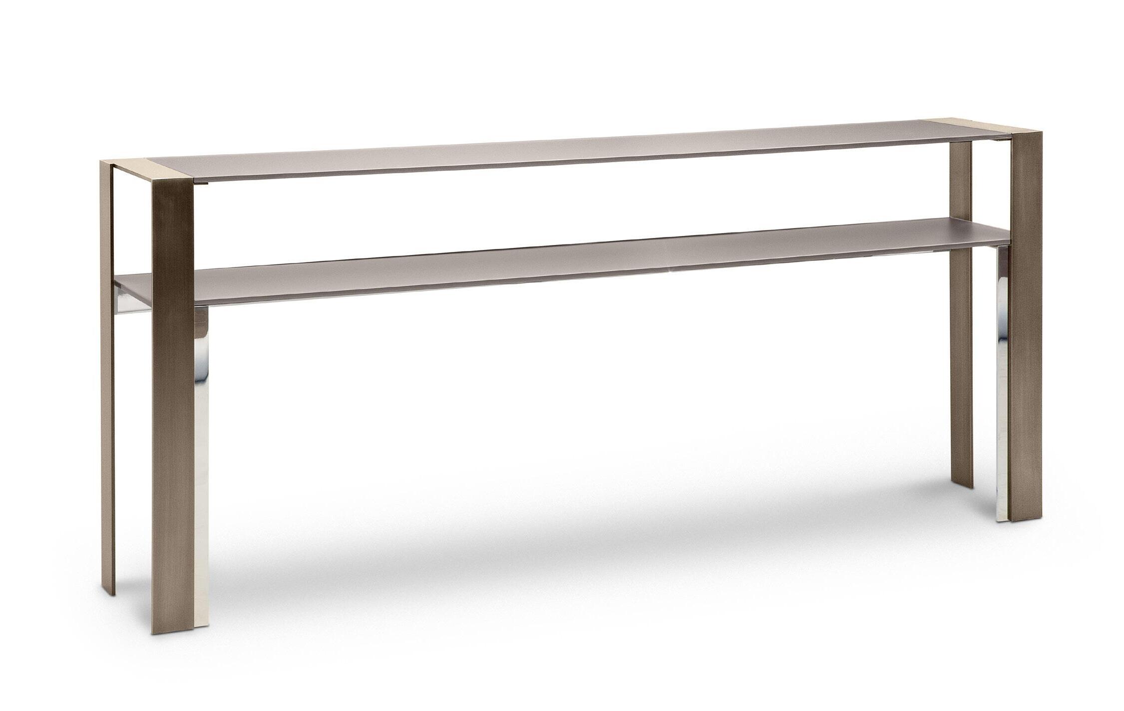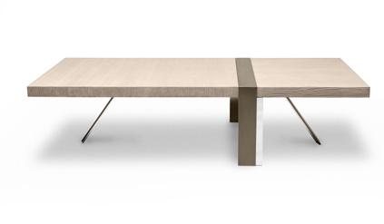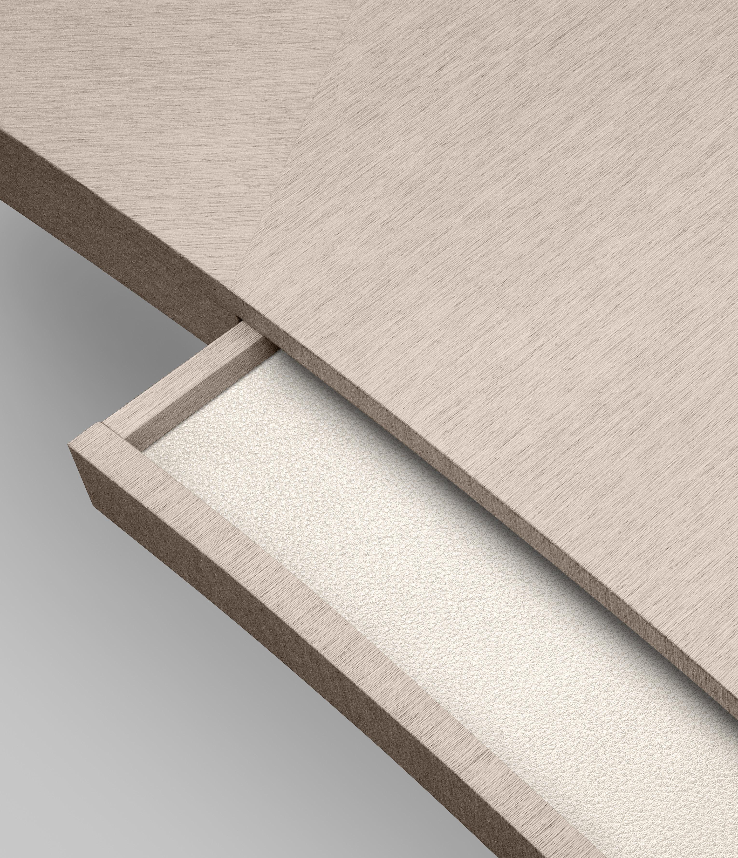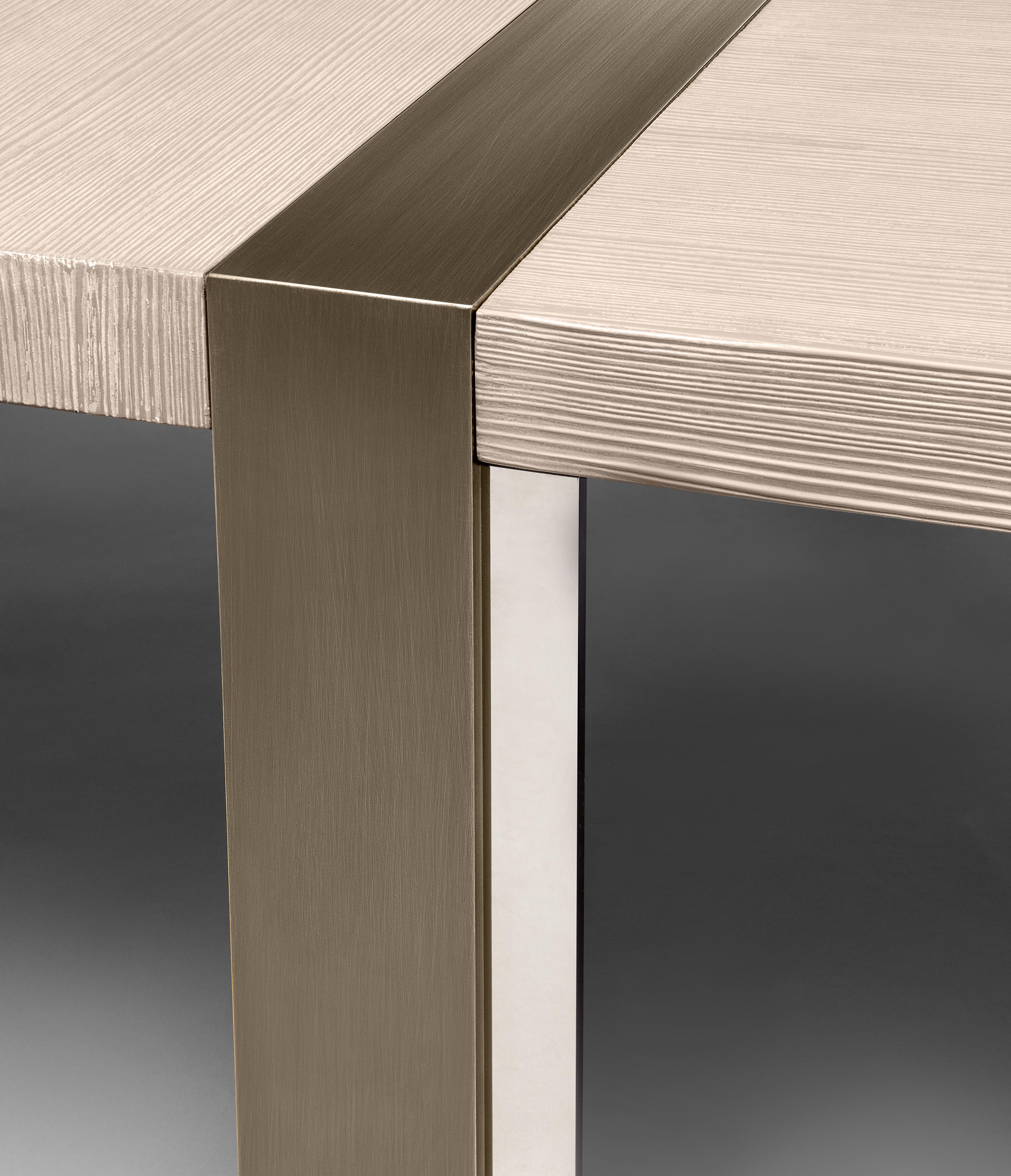 Any design requirement can be satisfied by choosing customized materials, finishes and dimensions. Series of rectangular and bean shaped tables with veneered fibreboard top and steel base. The tops are made of honeycomb boards with a millerays veneer with irregular vein. The two veneers and finishes available are: light grey bleached oakwood with a mat transparent coat and dark grey oakwood with a 100 gloss finish. The drawer, with leather bottom, is mounted on metal full extension slides with dampers or on revolving ball bearing ones. The base is made of galvanized hexagonal tube with a brushed bronze finish; the legs have adjustable feet.
