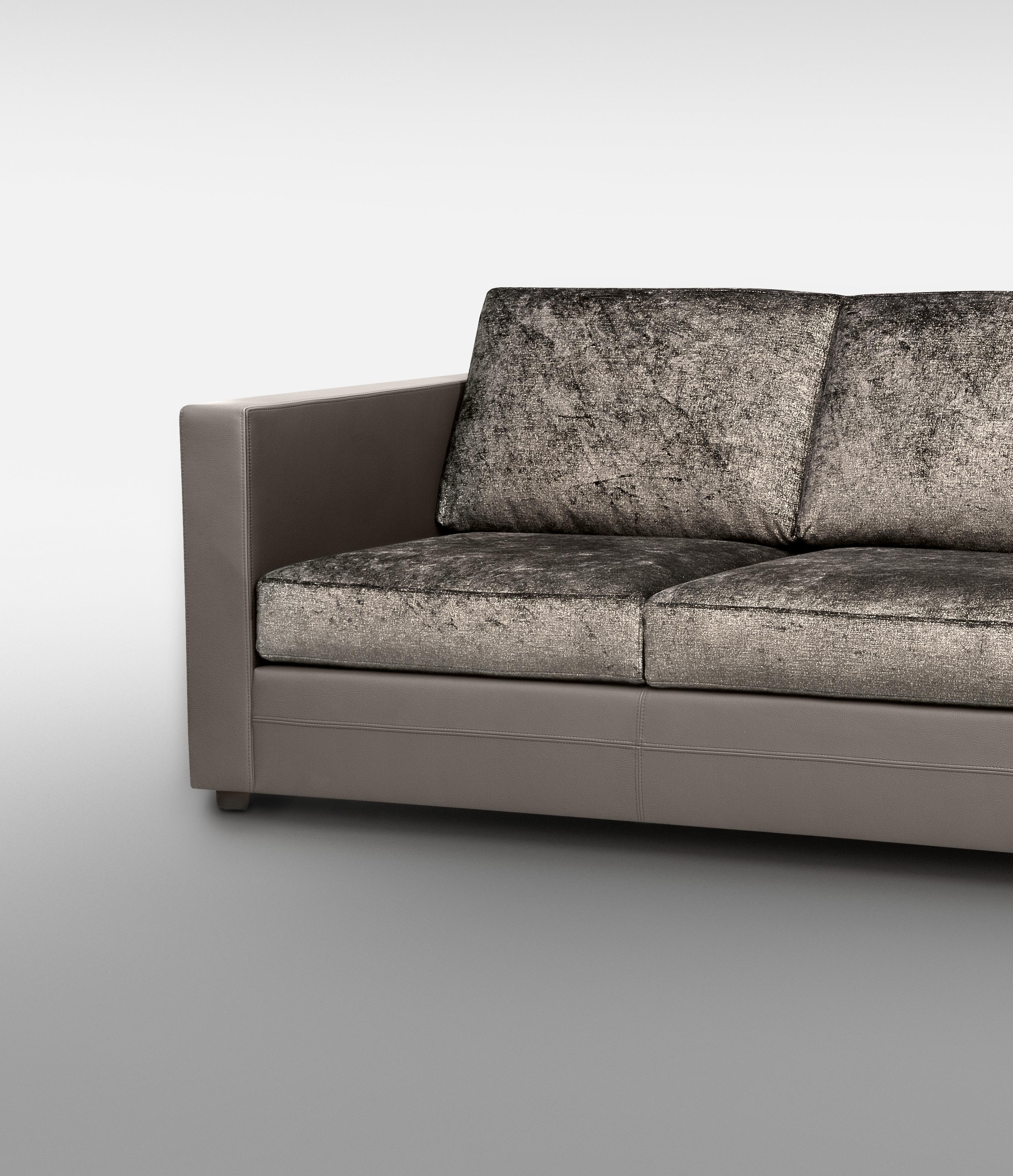 Series of sofas with two lengths, made of plywood panels covered with polyurethane expanded foam. The seat is padded with flexible foam with a special top level made of a viscous-elastic foam. The back cushions are made of flexible foam and goose feathers. The feet have a varnished bronze finish.