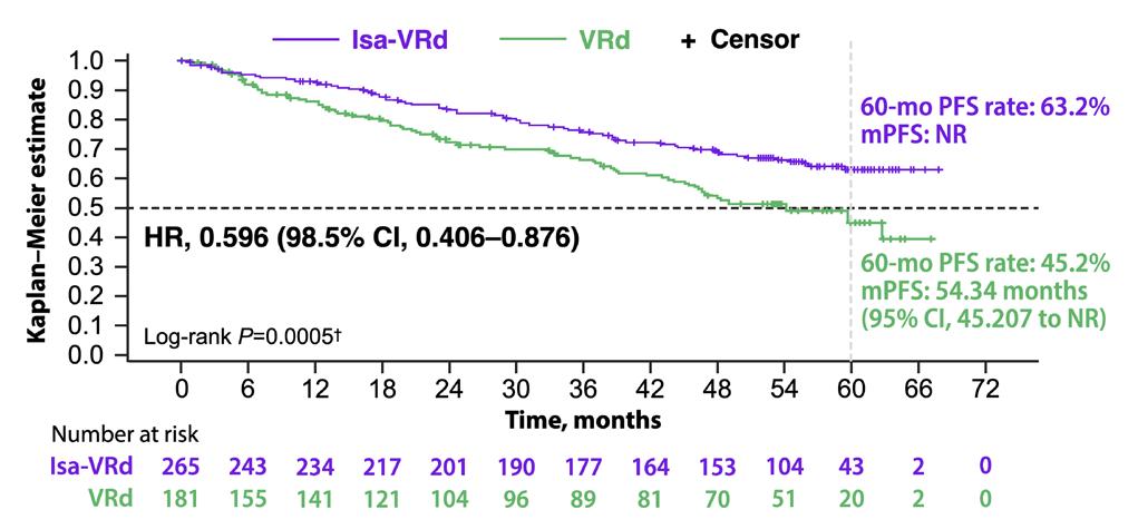 IMROZ clinical trial at a median follow-up (5 years or 59.7 months): Isa-VRd followed by Isa-Rd led to a statistically significant reduction in the risk of progression or death by 40.4%