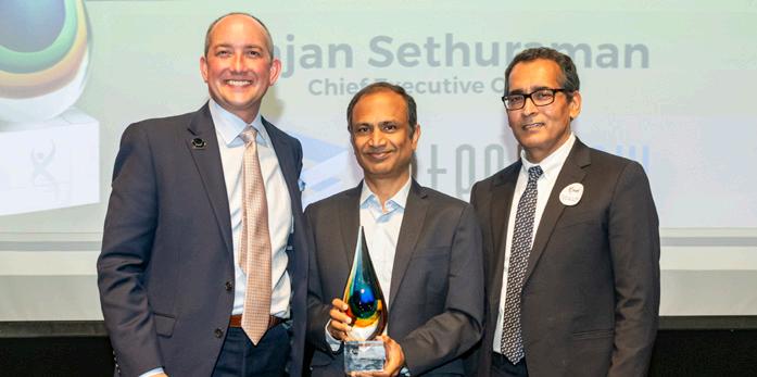 Rajan Sethuraman of LatentView Analytics accepts the 2024 Partner of the Year Award from myeloma patient Kent Oliver and Sanjay Singh