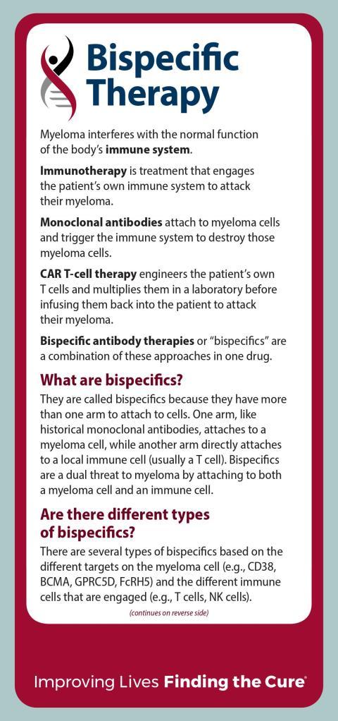 Bispecific antibodies act as a bridge between T cells and myeloma cells to use a patient’s immune system to target myeloma. Teclistamab is the first approved. Elranatamab and talquetamab approvals expected.