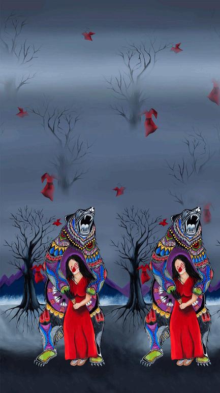 Karen Erickson, a Cree artist from Prince George, BC. She has been painting for over 35 years, since high school. She is inspired by nature, animals, and people. Karen paints stories through her art, meticulously translating them onto her canvas. Karen enjoys challenging herself with a variety of different mediums and projects. Her art can be seen throughout her local community and beyond.