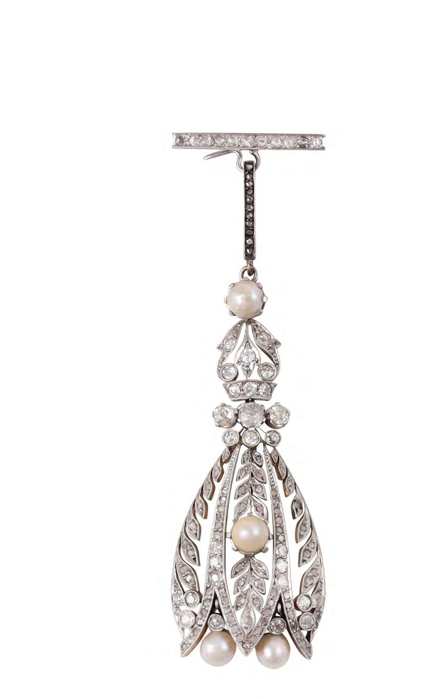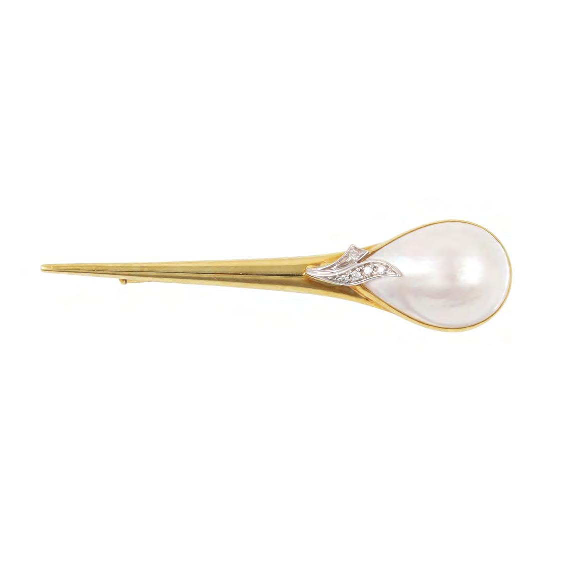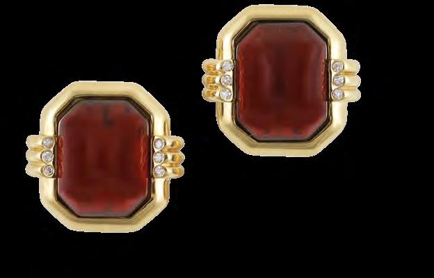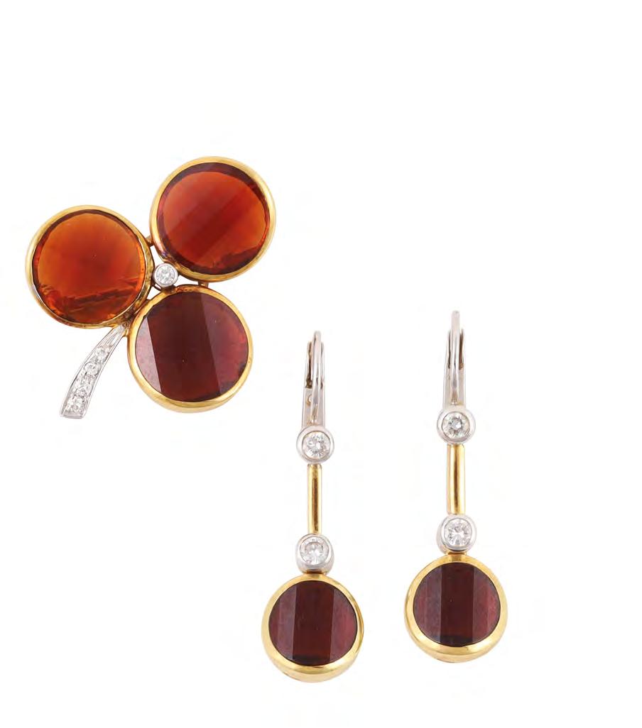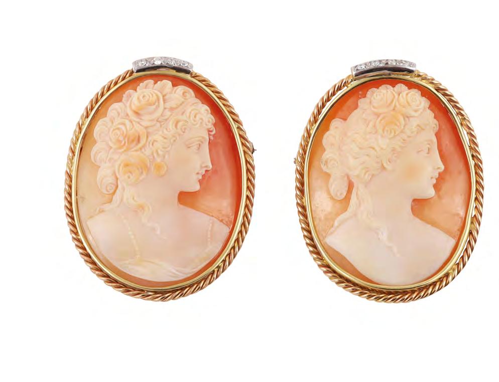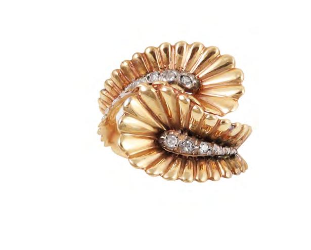 a clip in oro giallo e bianco a guisa di cupola fogliata, ciascuno con al centro un brillante, gr. 17,6. Diametro 2,7 cm ca.