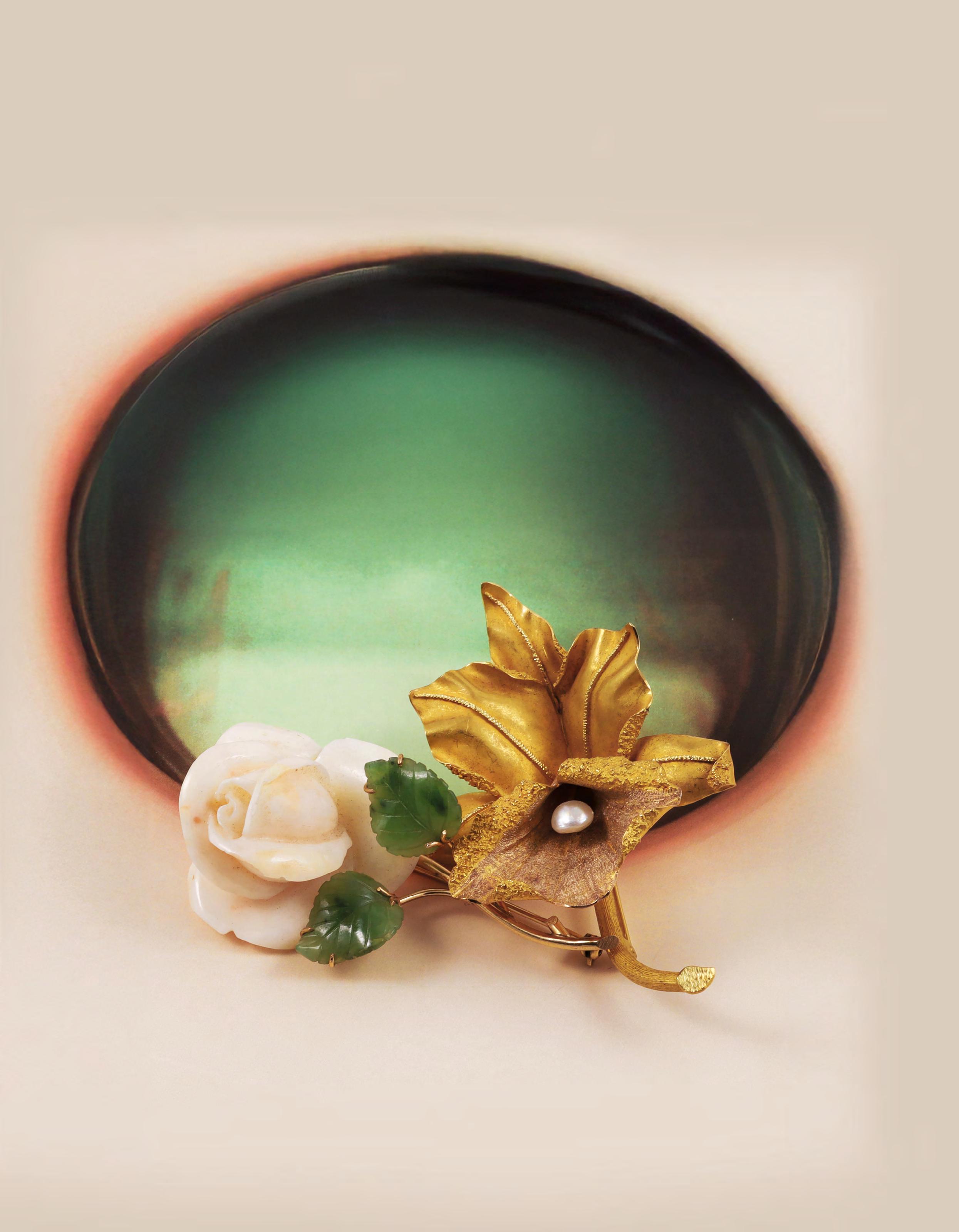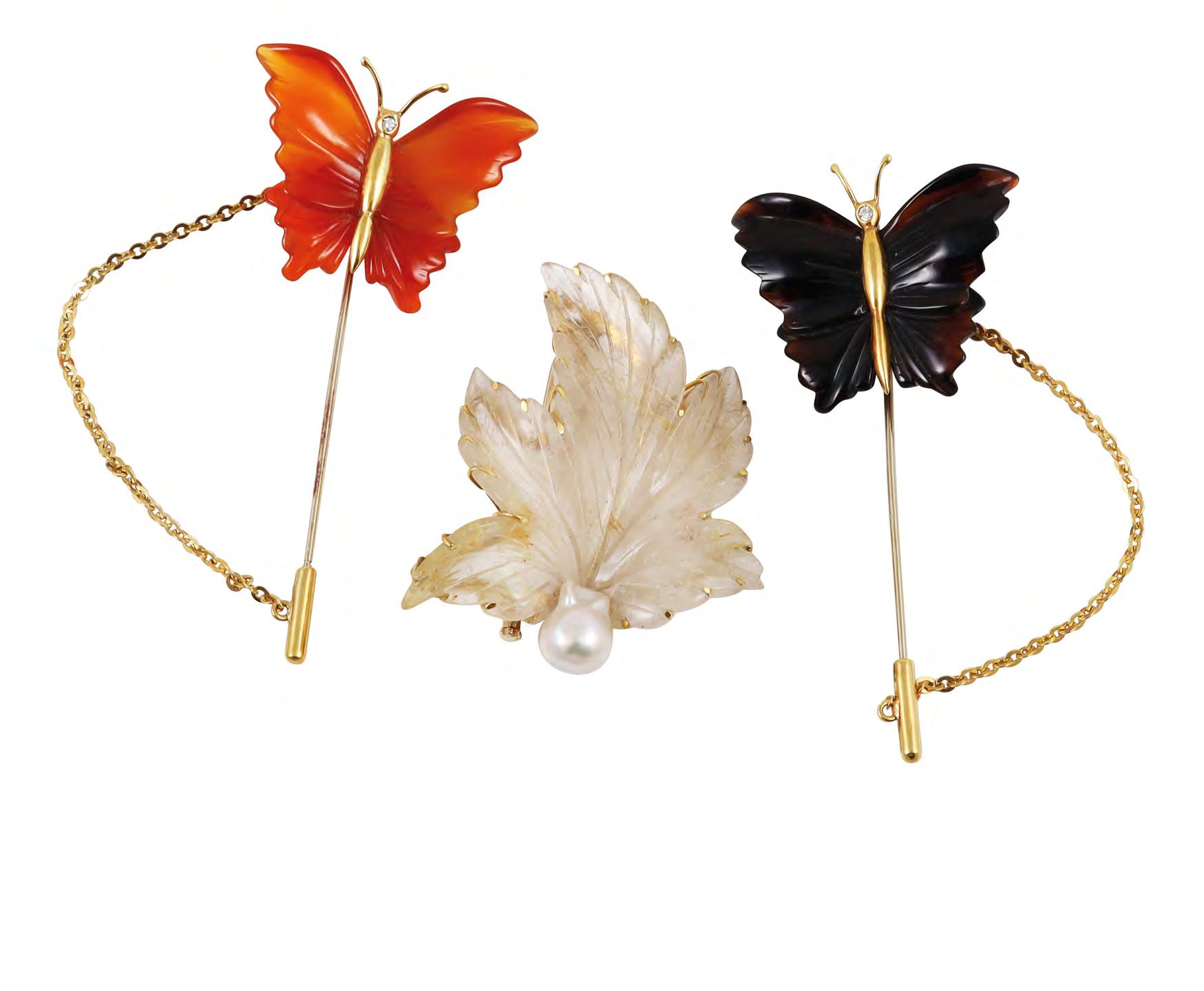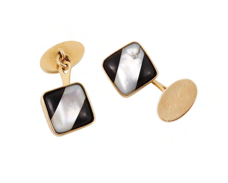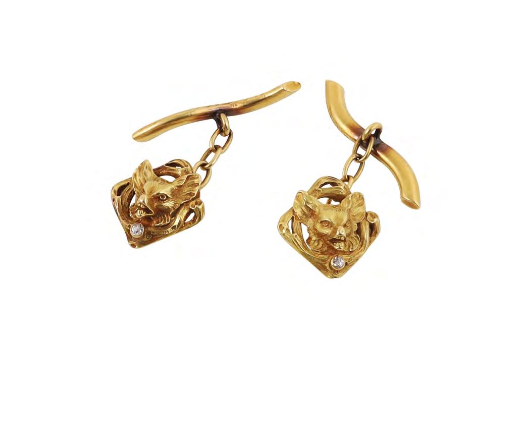 a clip in oro giallo e bianco a guisa di cupola fogliata, ciascuno con al centro un brillante, gr. 17,6. Diametro 2,7 cm ca.