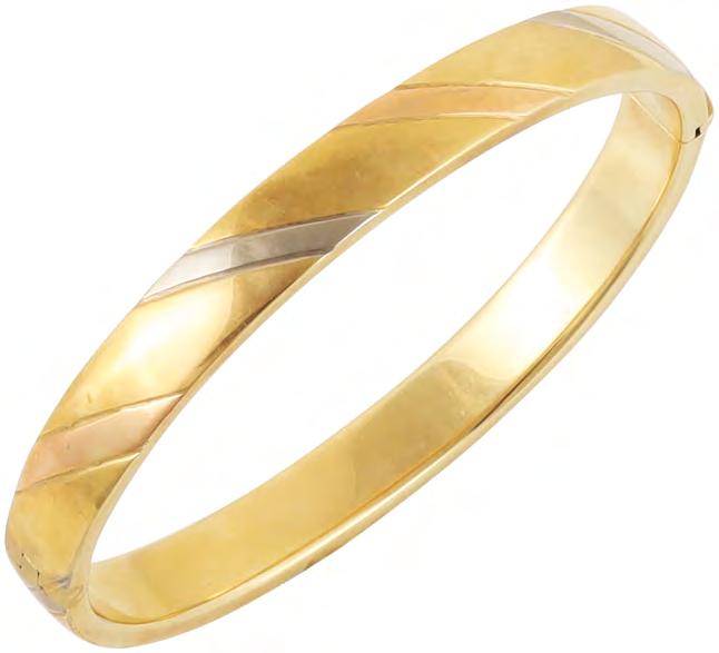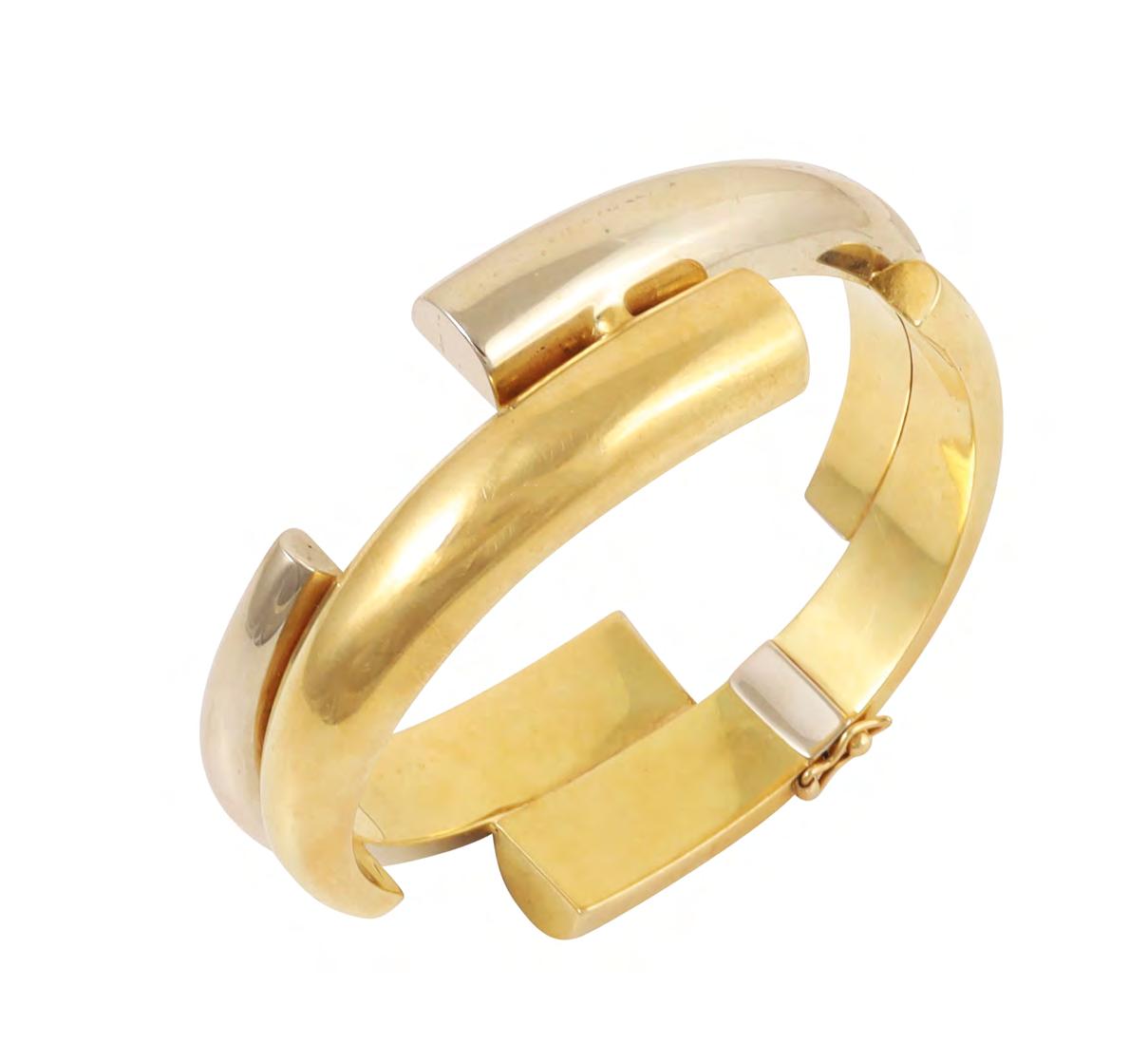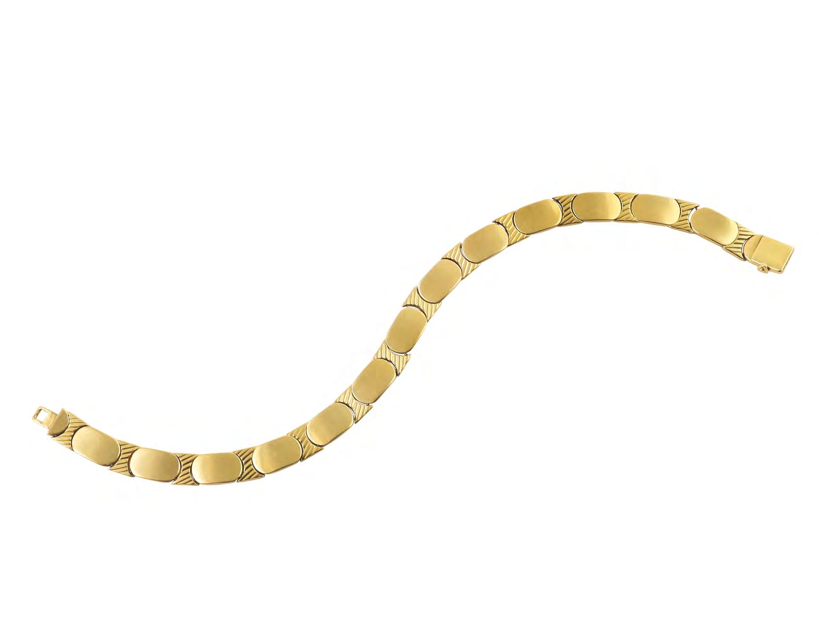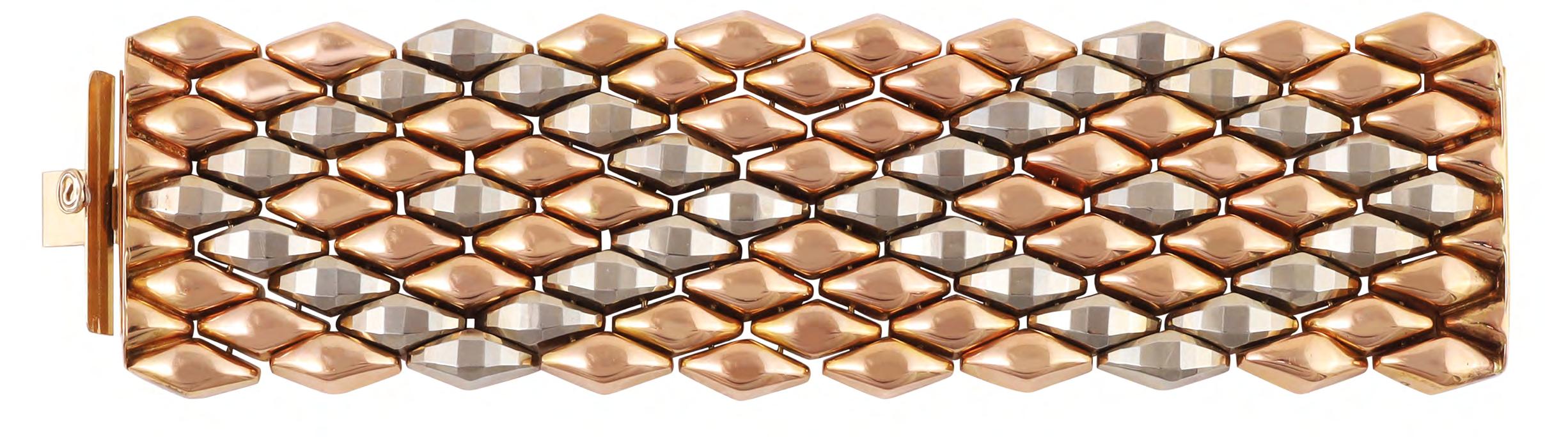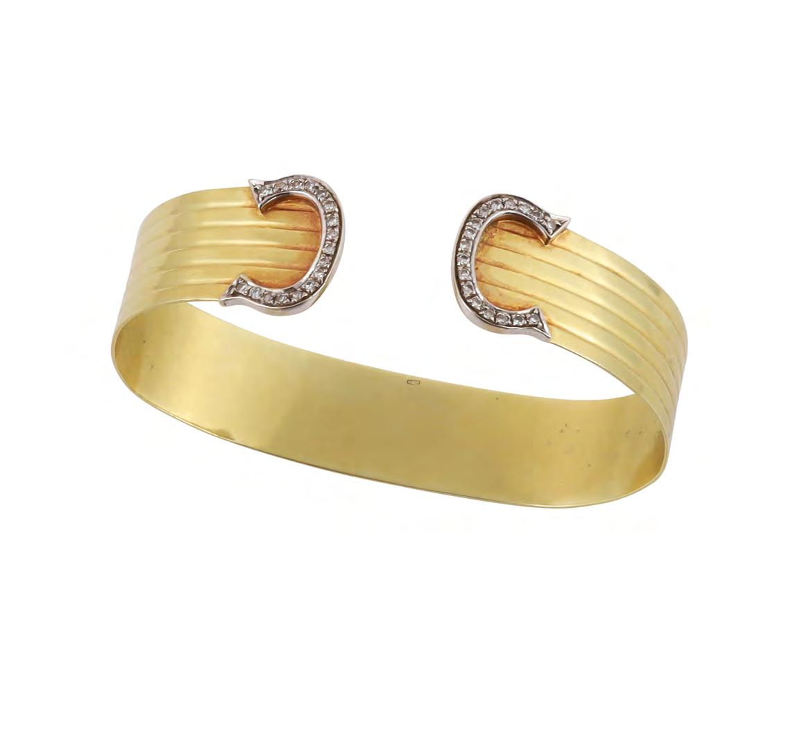 a nastro semirigido in oro giallo con al centro due motivi contrapposti a forma di “C” in oro bianco con diamanti, 27,7.