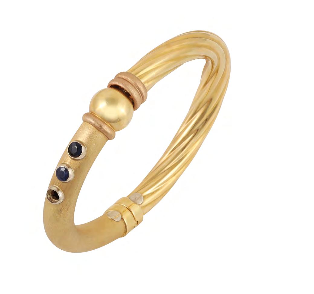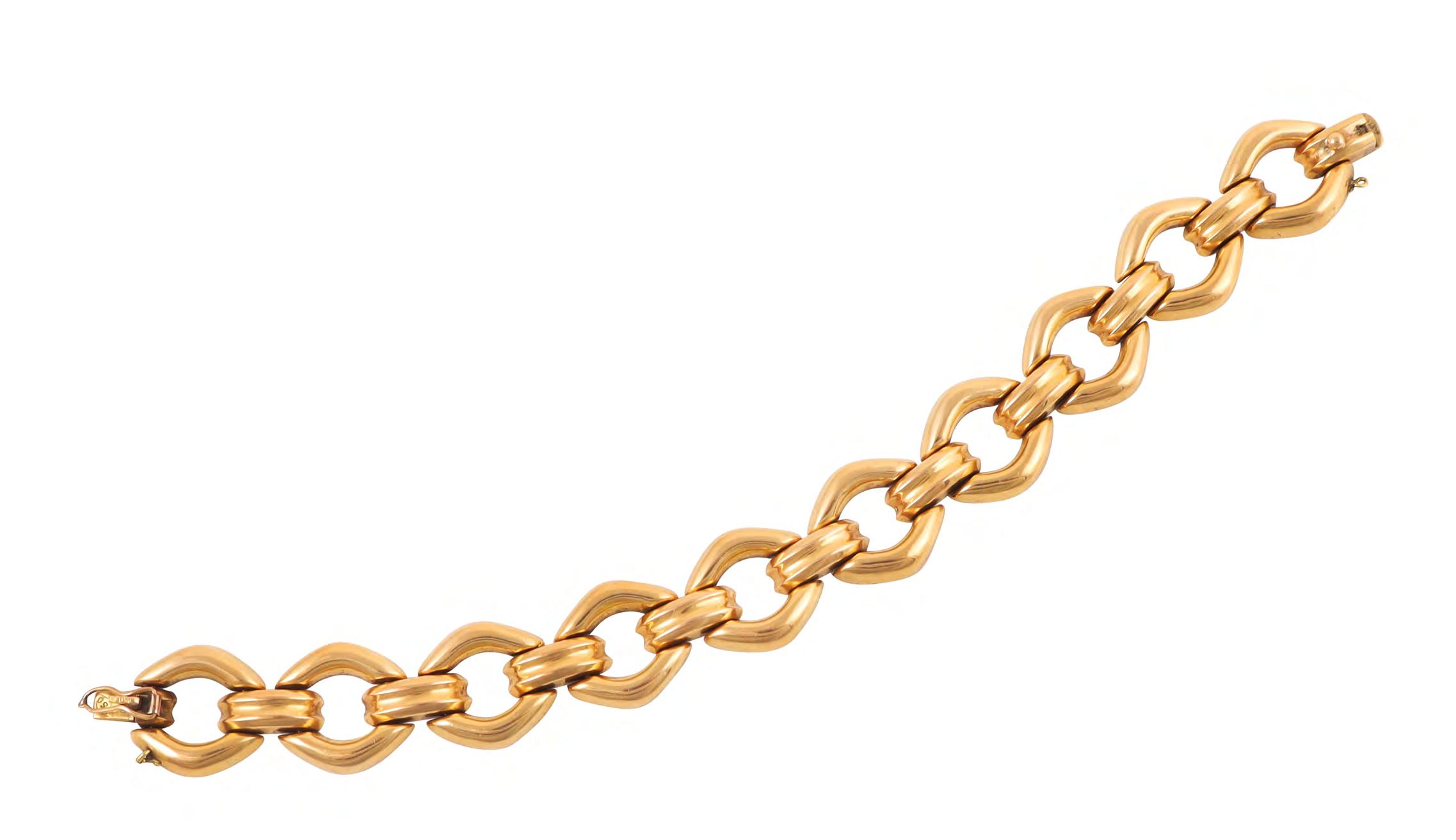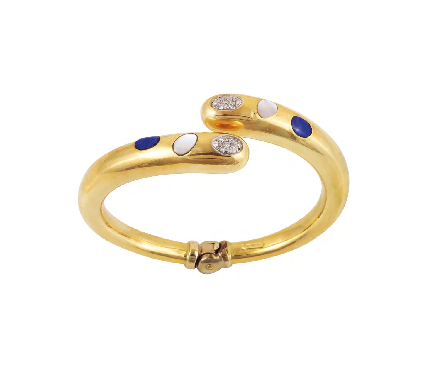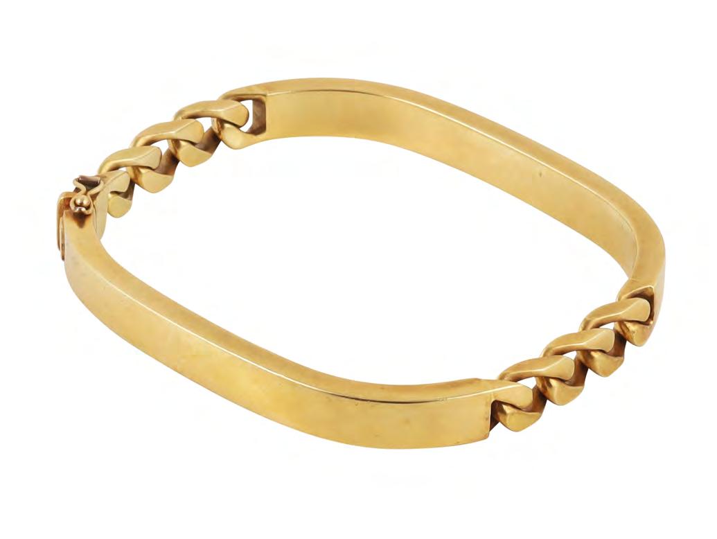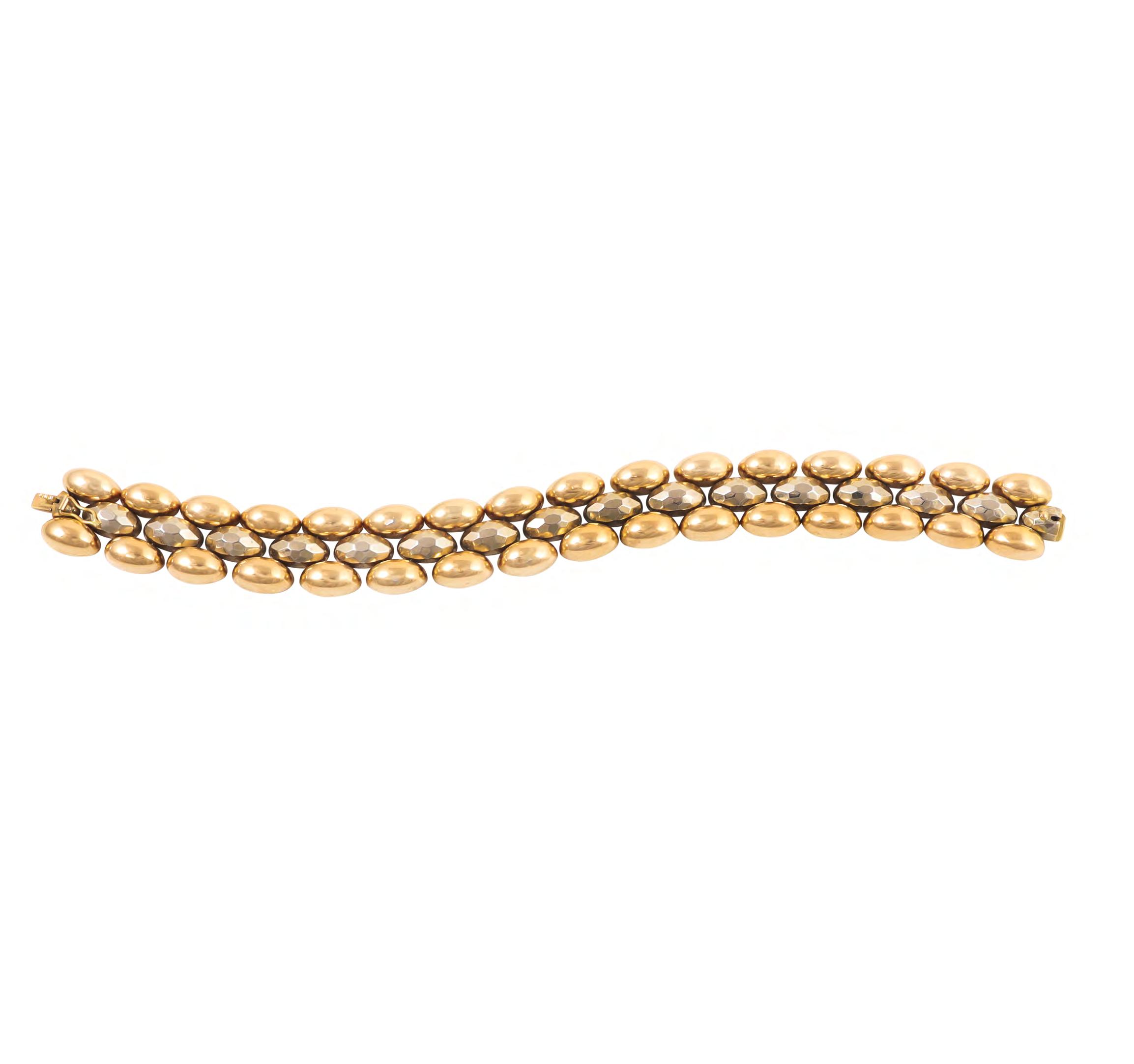 a nastro semirigido in oro giallo con al centro due motivi contrapposti a forma di “C” in oro bianco con diamanti, 27,7.