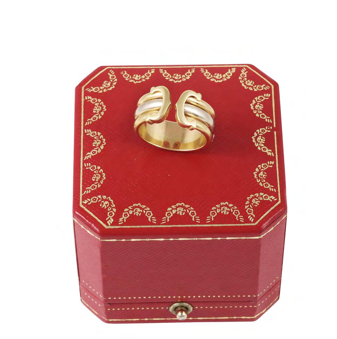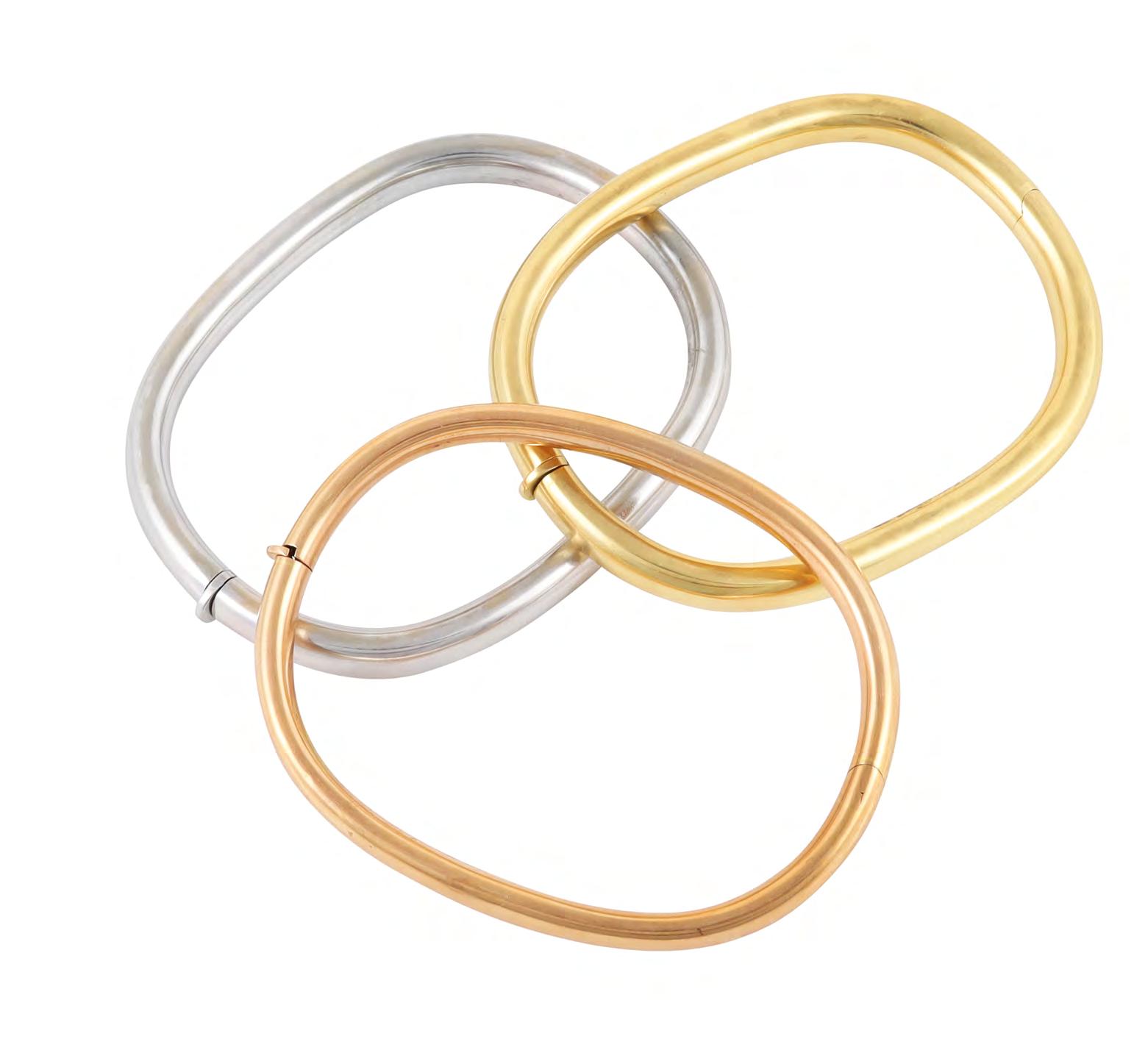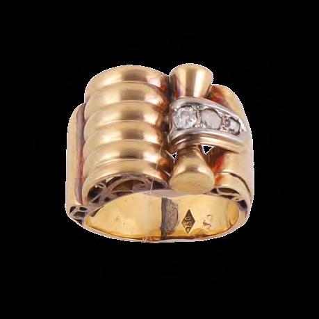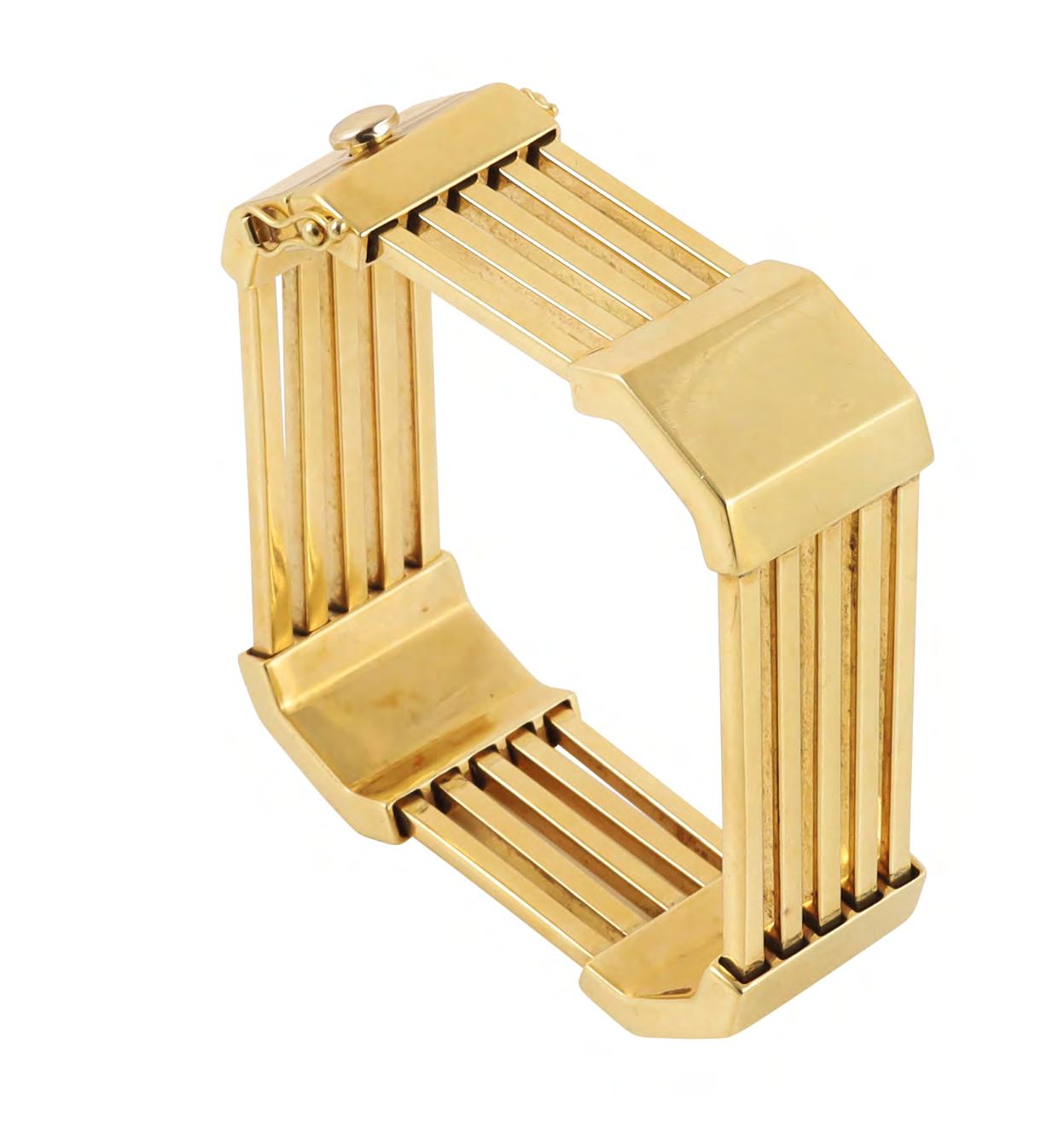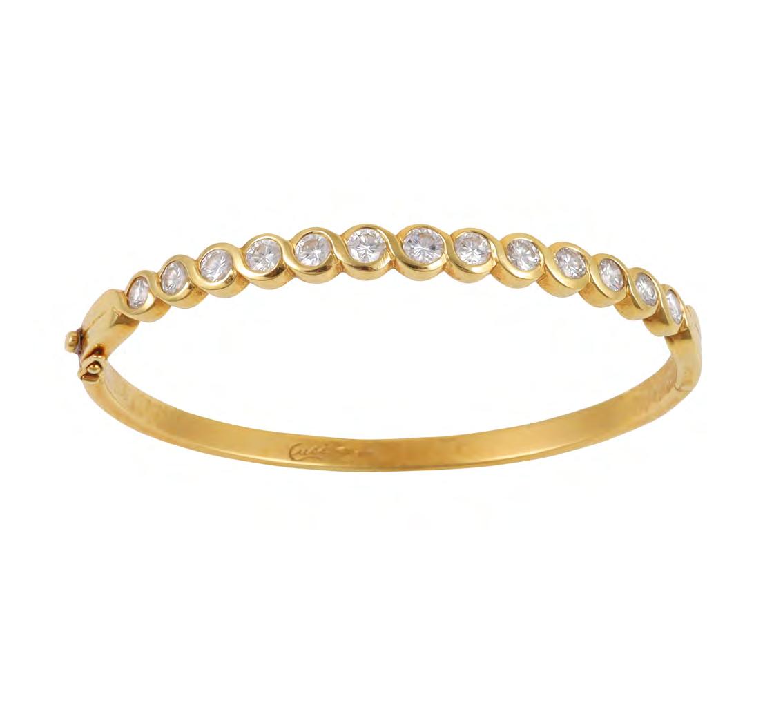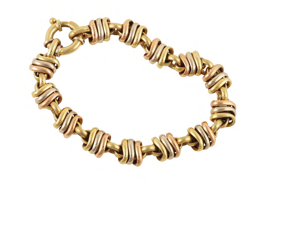 a nastro semirigido in oro giallo con al centro due motivi contrapposti a forma di “C” in oro bianco con diamanti, 27,7.
