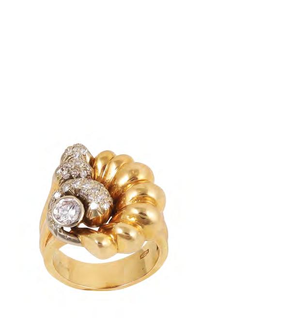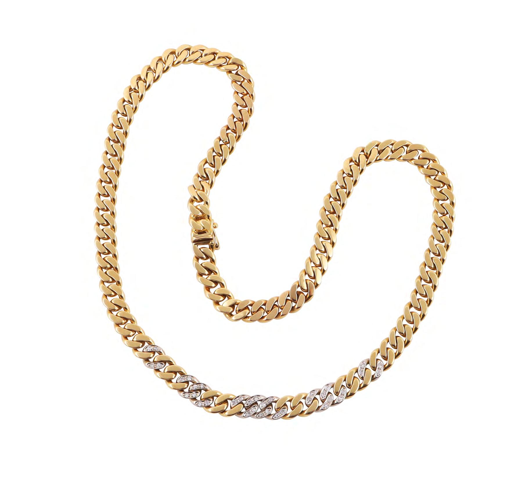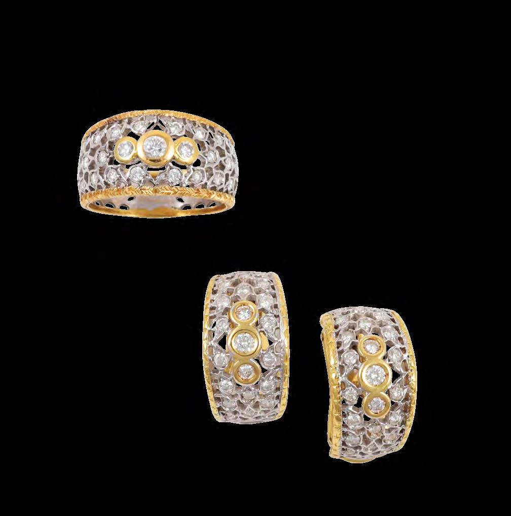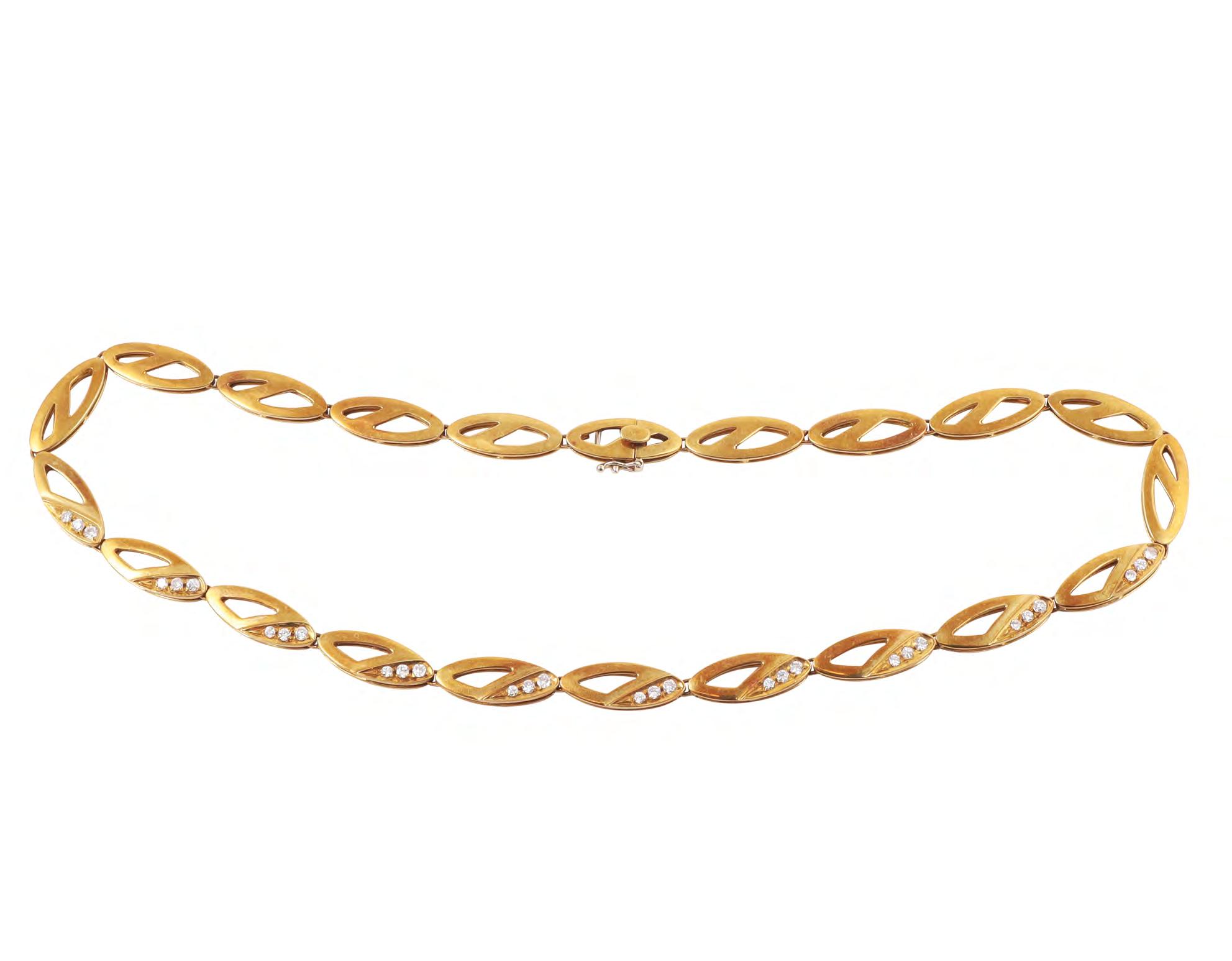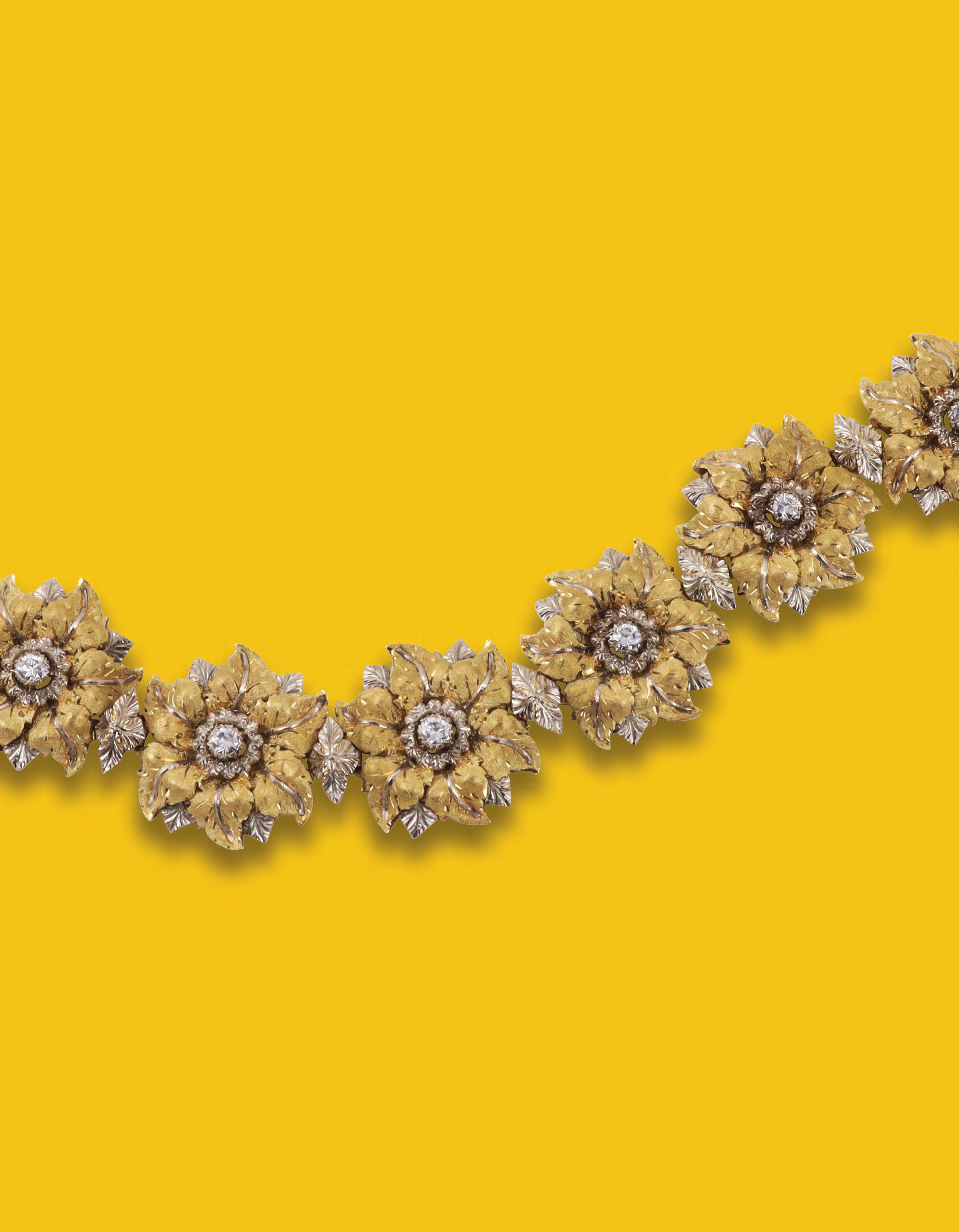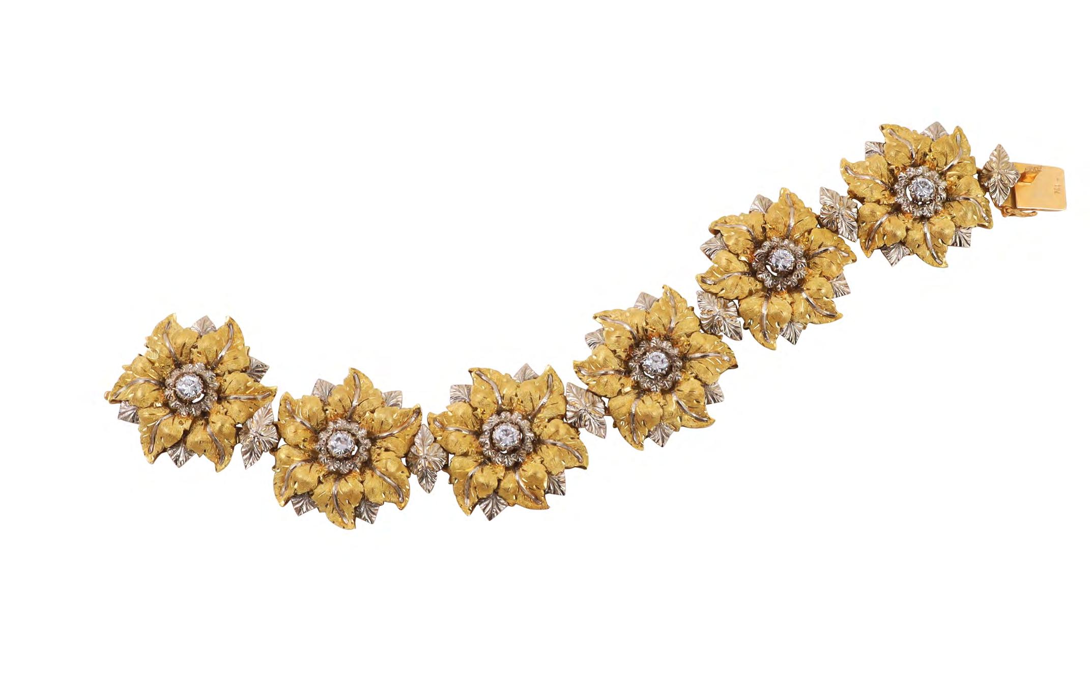 in oro giallo e bianco composto da sei motivi fogliati finemente cesellati con brillanti del peso complessivo di 1,50 ct ca., gr. 65,1.