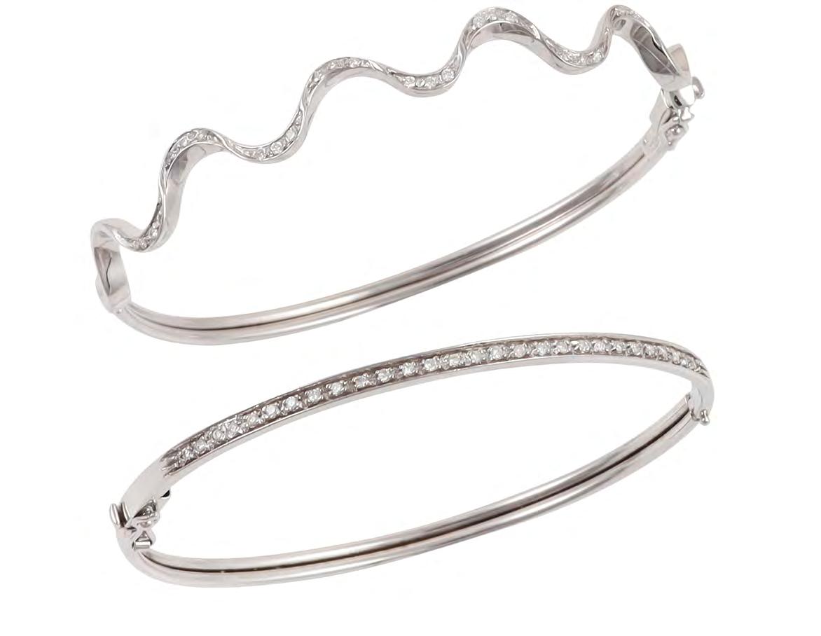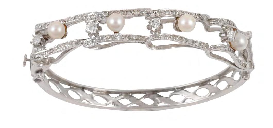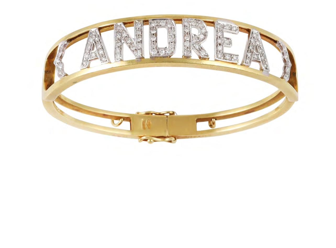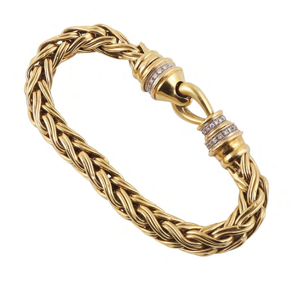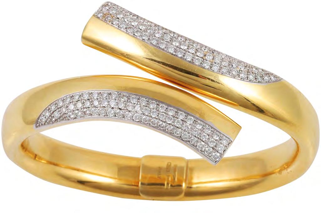rigido a motivo intrecciato in oro giallo e bianco ornato anteriormente da brillanti, gr. 36,8. Misura 18 cm ca.