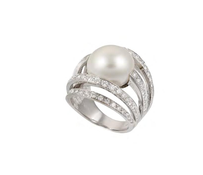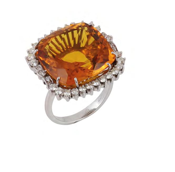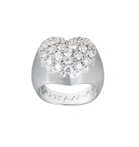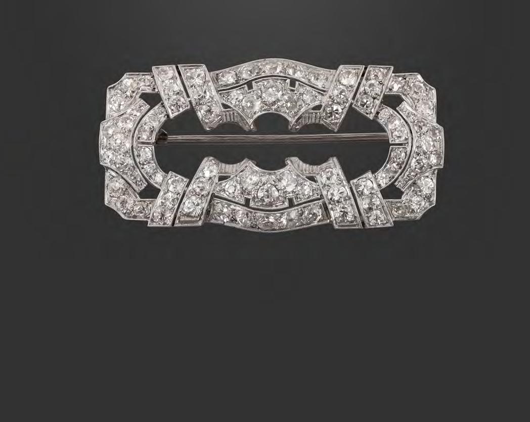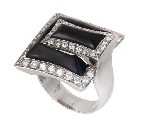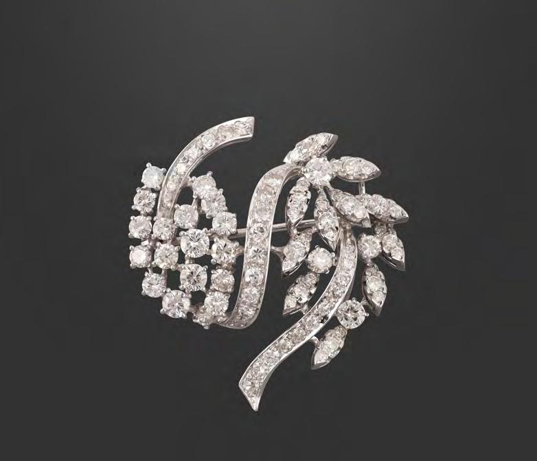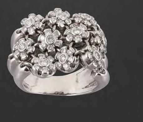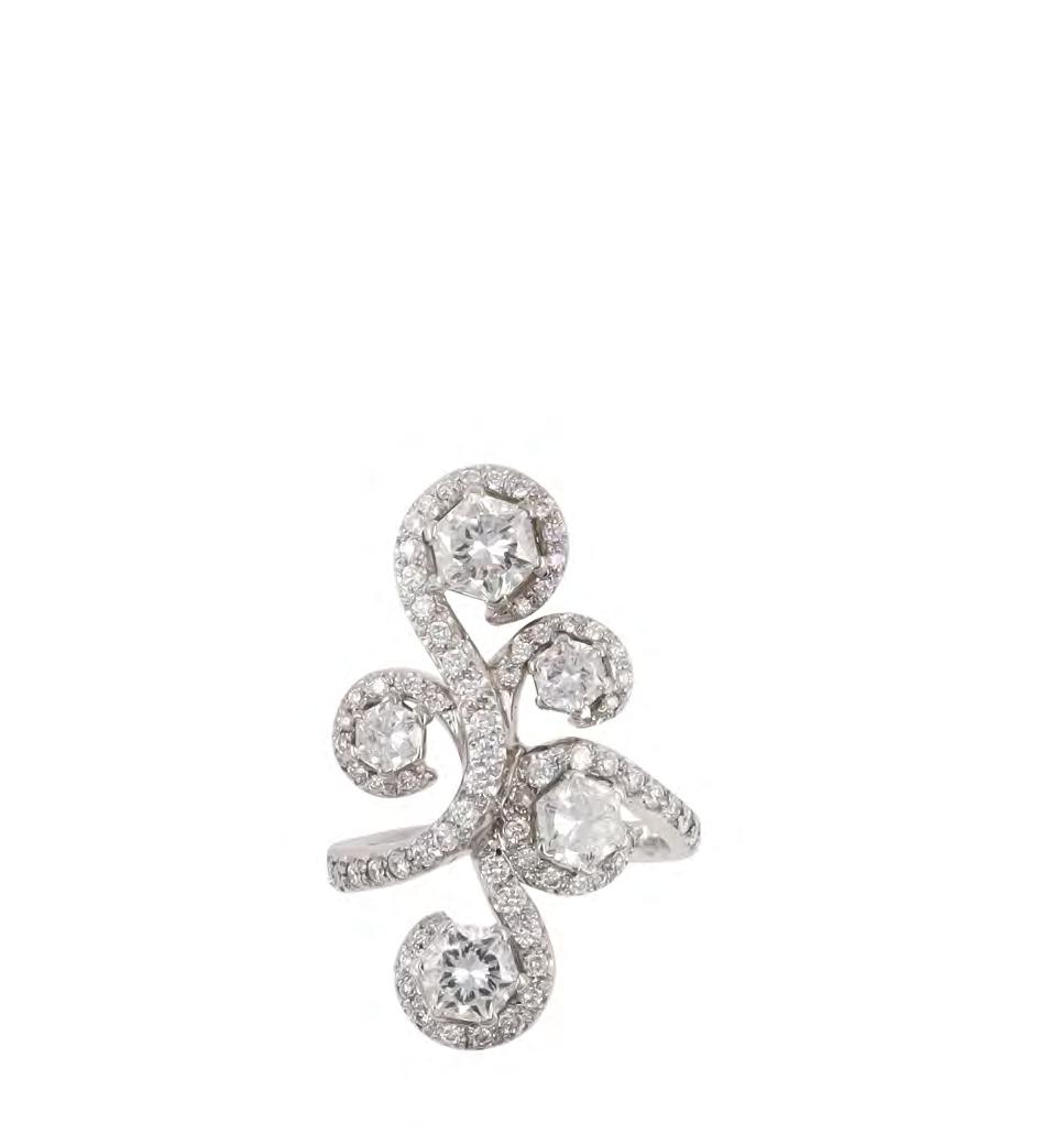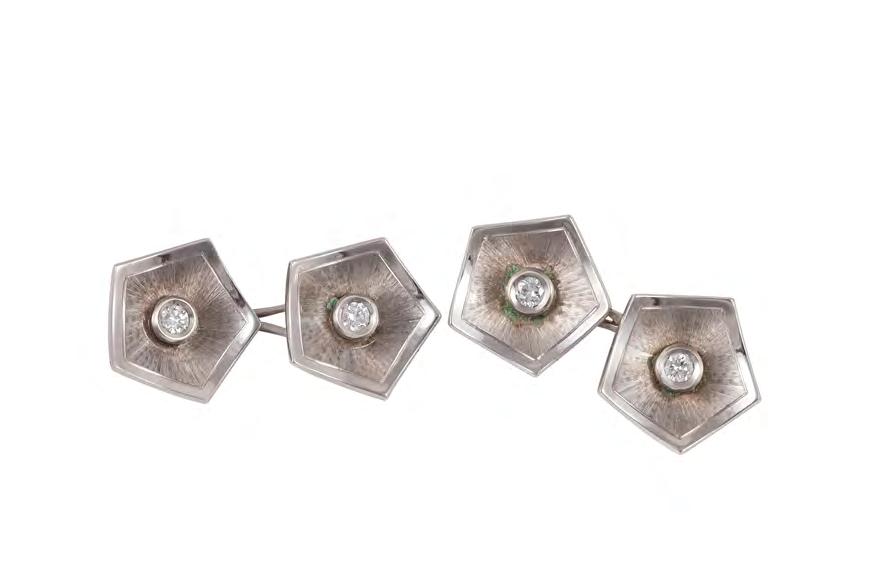 in oro bianco con motivo anteriore a volute ornato da diamanti a forma esagonale del peso complessivo di 2,40 ct ca. e brillanti, riproposti anche su parte del gambo, gr. 13,8.