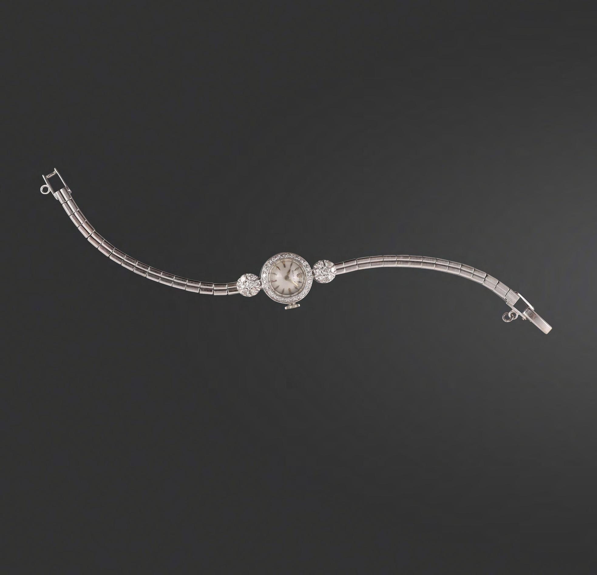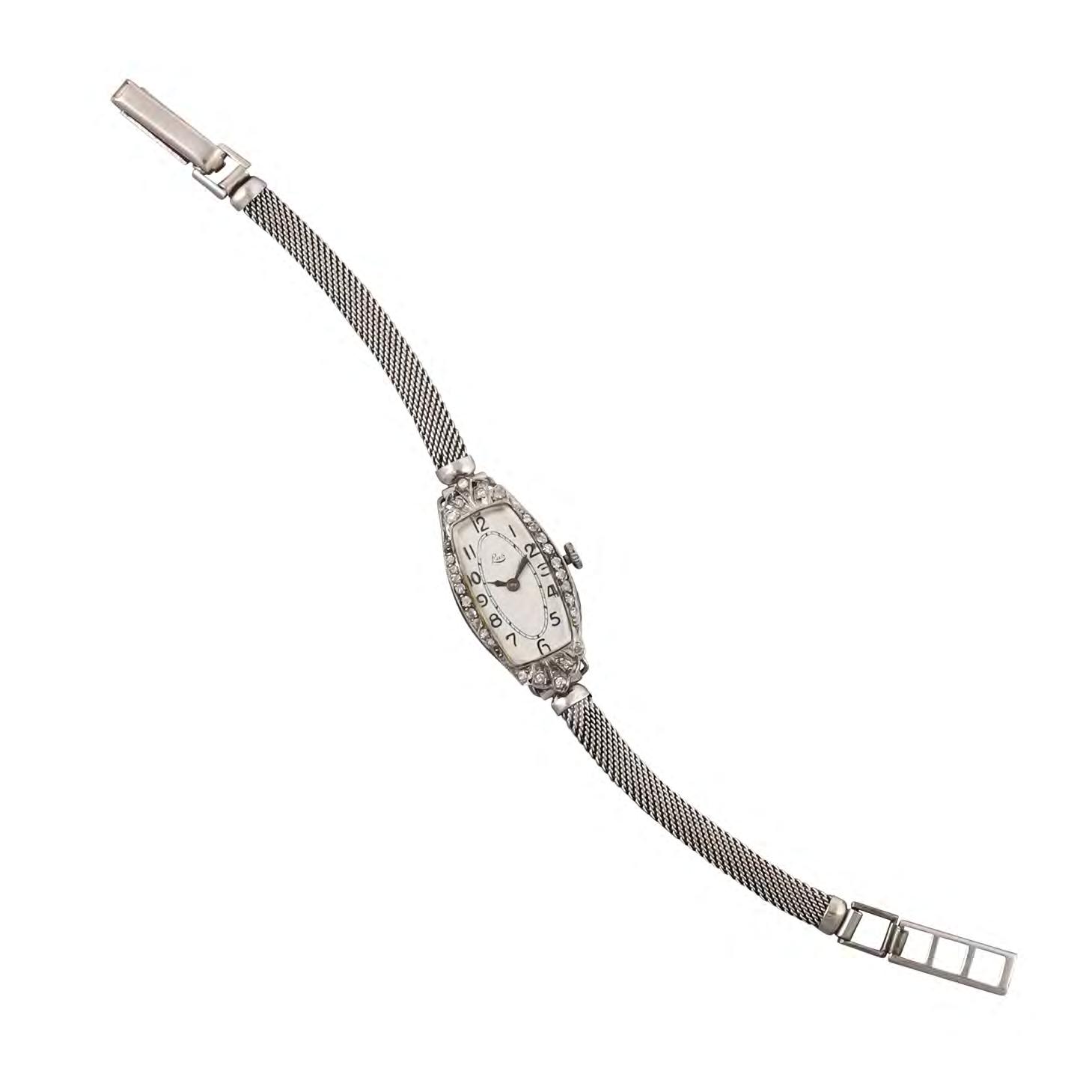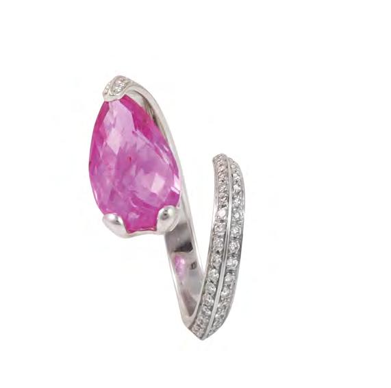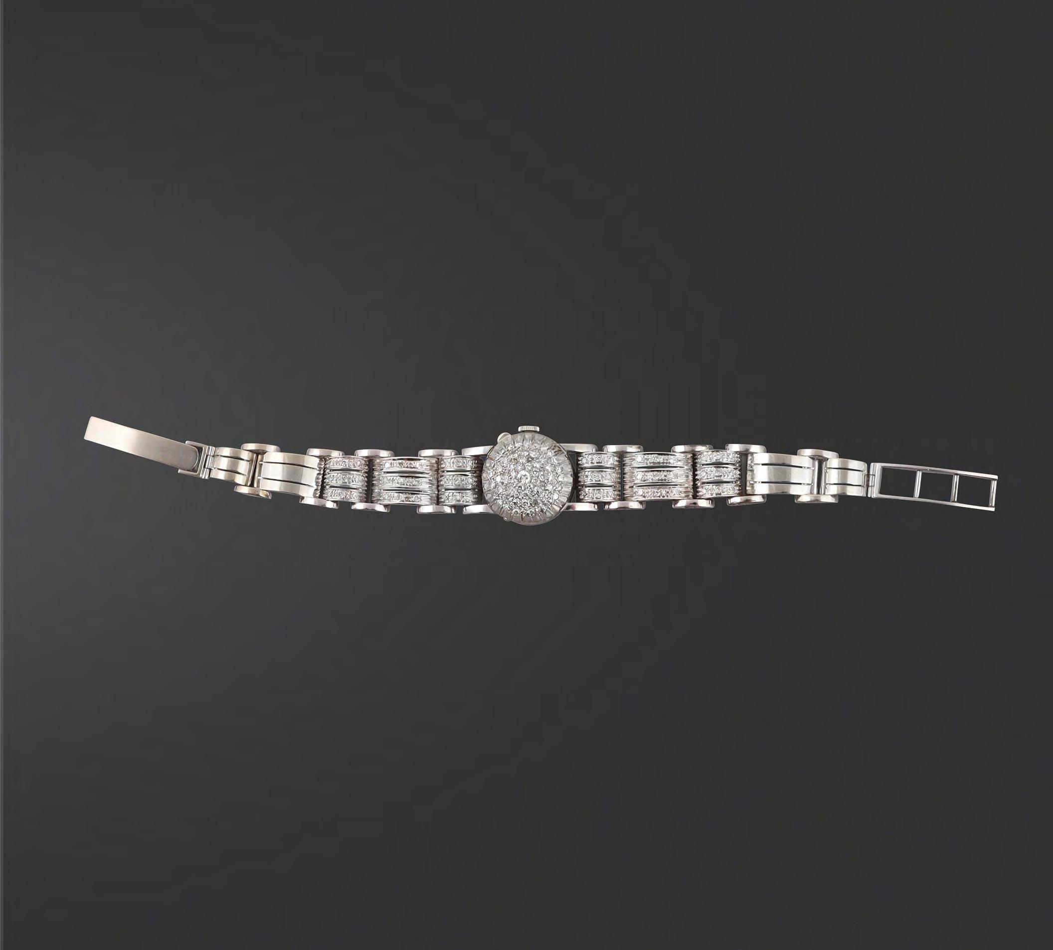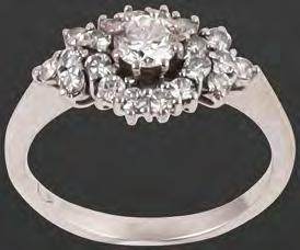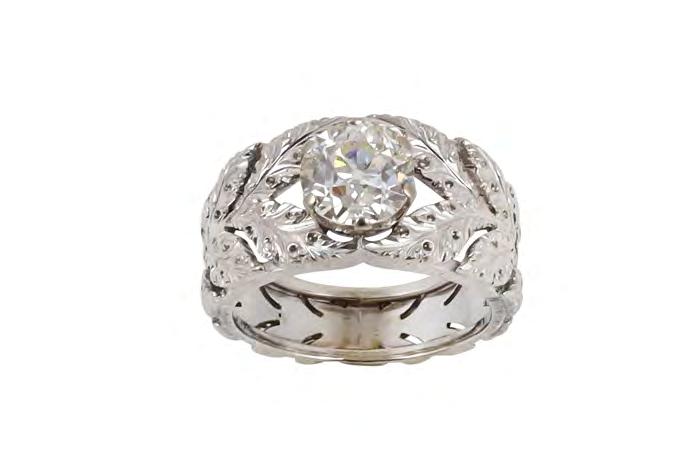in oro bianco con motivo anteriore a volute ornato da diamanti a forma esagonale del peso complessivo di 2,40 ct ca. e brillanti, riproposti anche su parte del gambo, gr. 13,8.