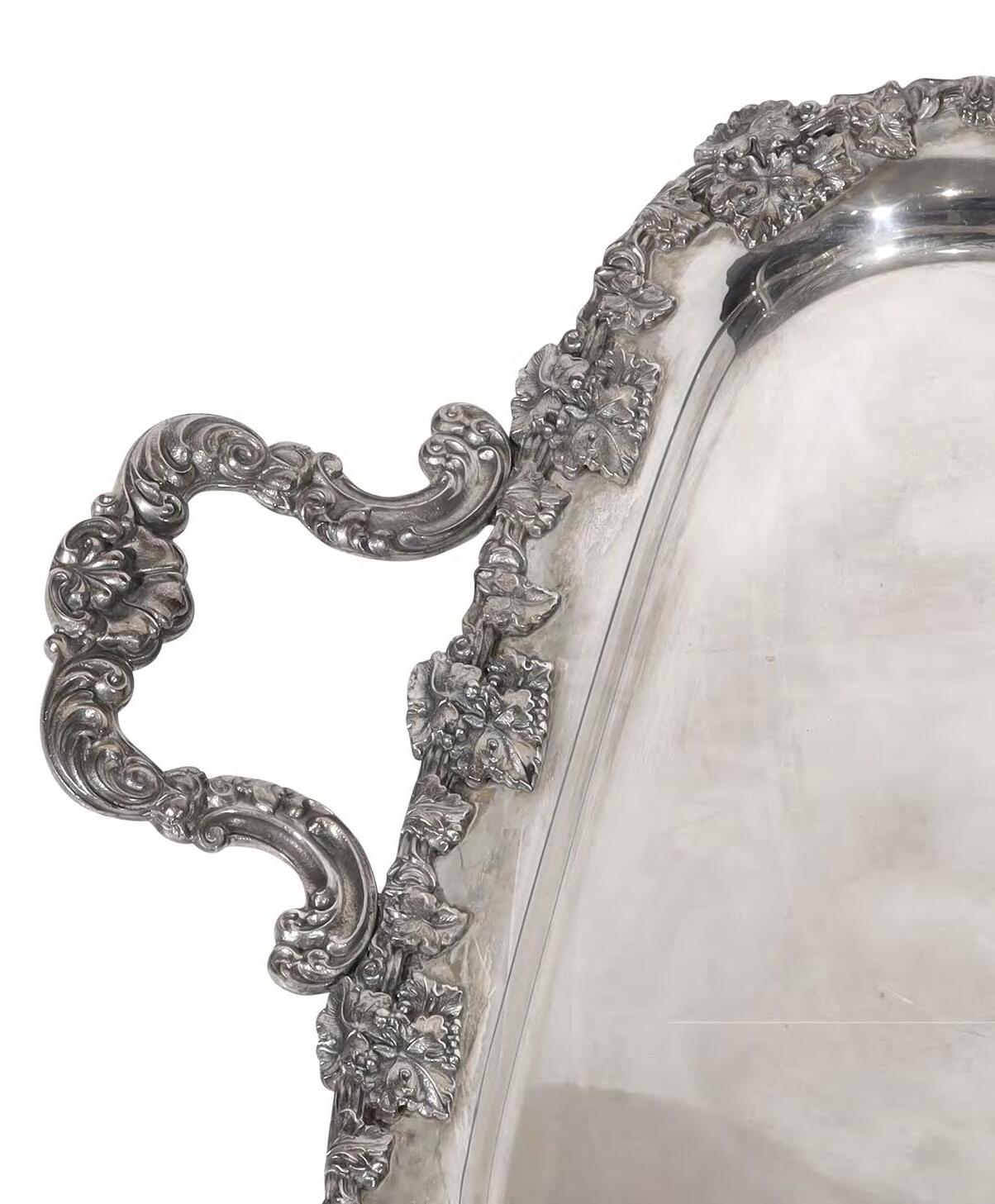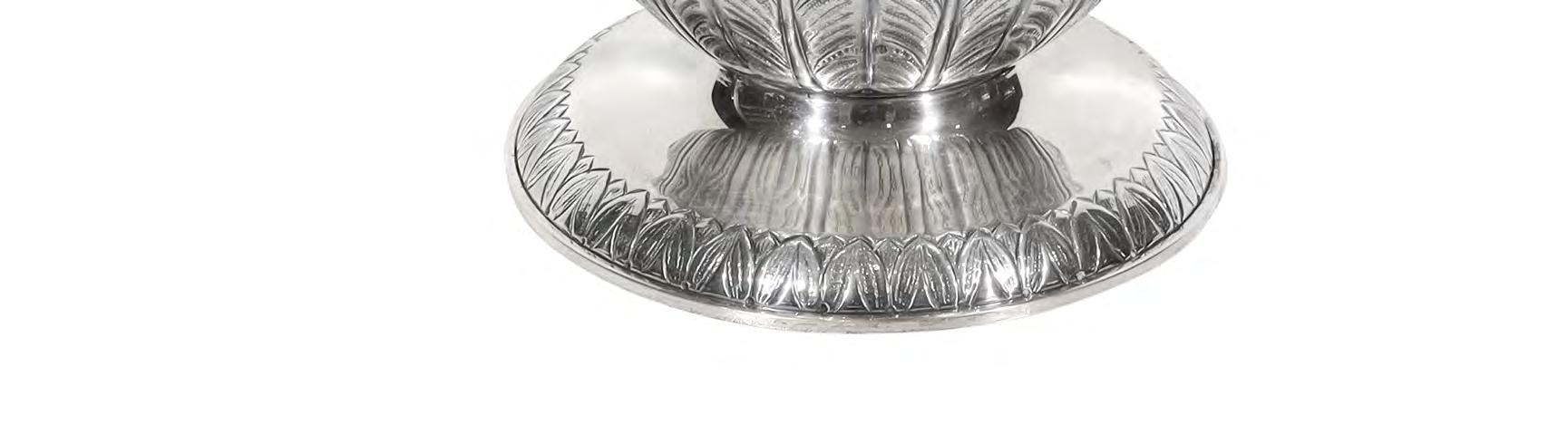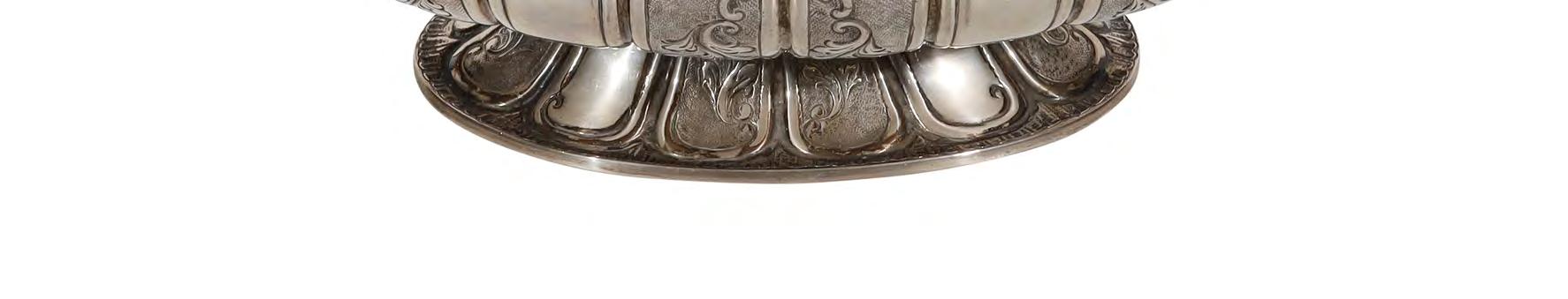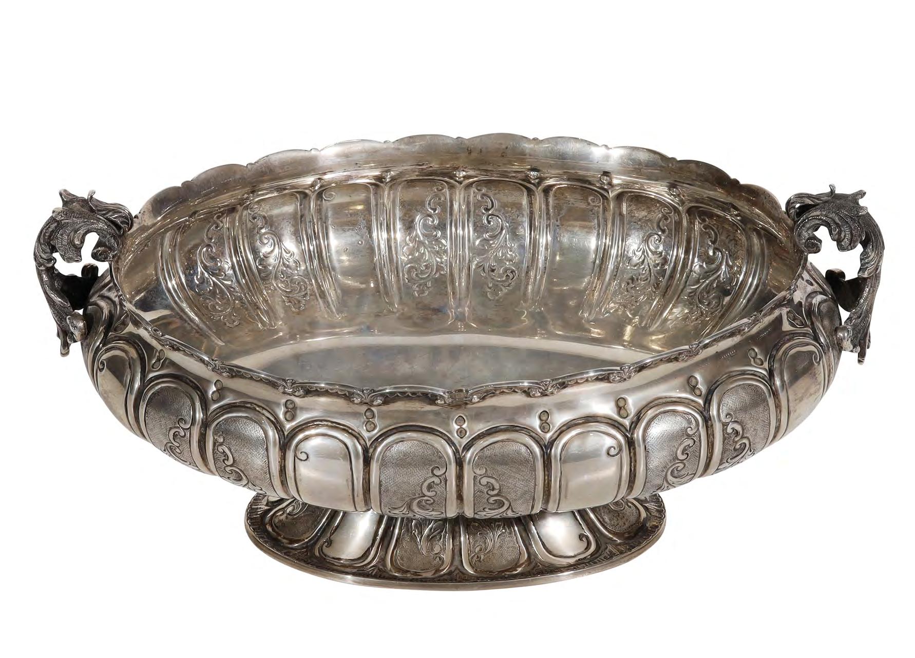 in argento a corpo liscio, alla base ornati a foglie piumate. Prese laterali ad anello sostenute da teste d’aquila, gr. 1.130 ca.
