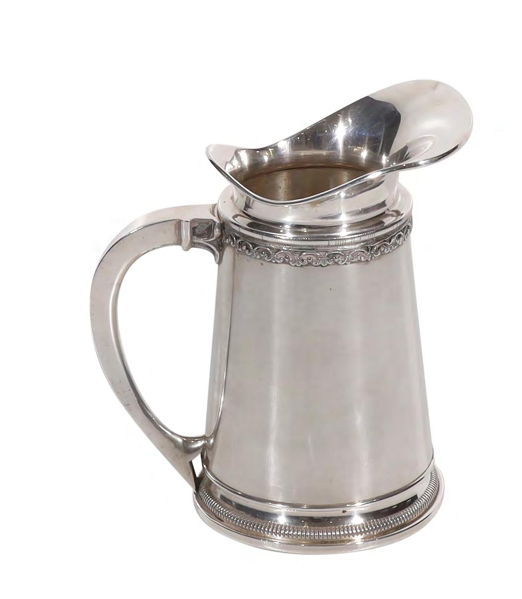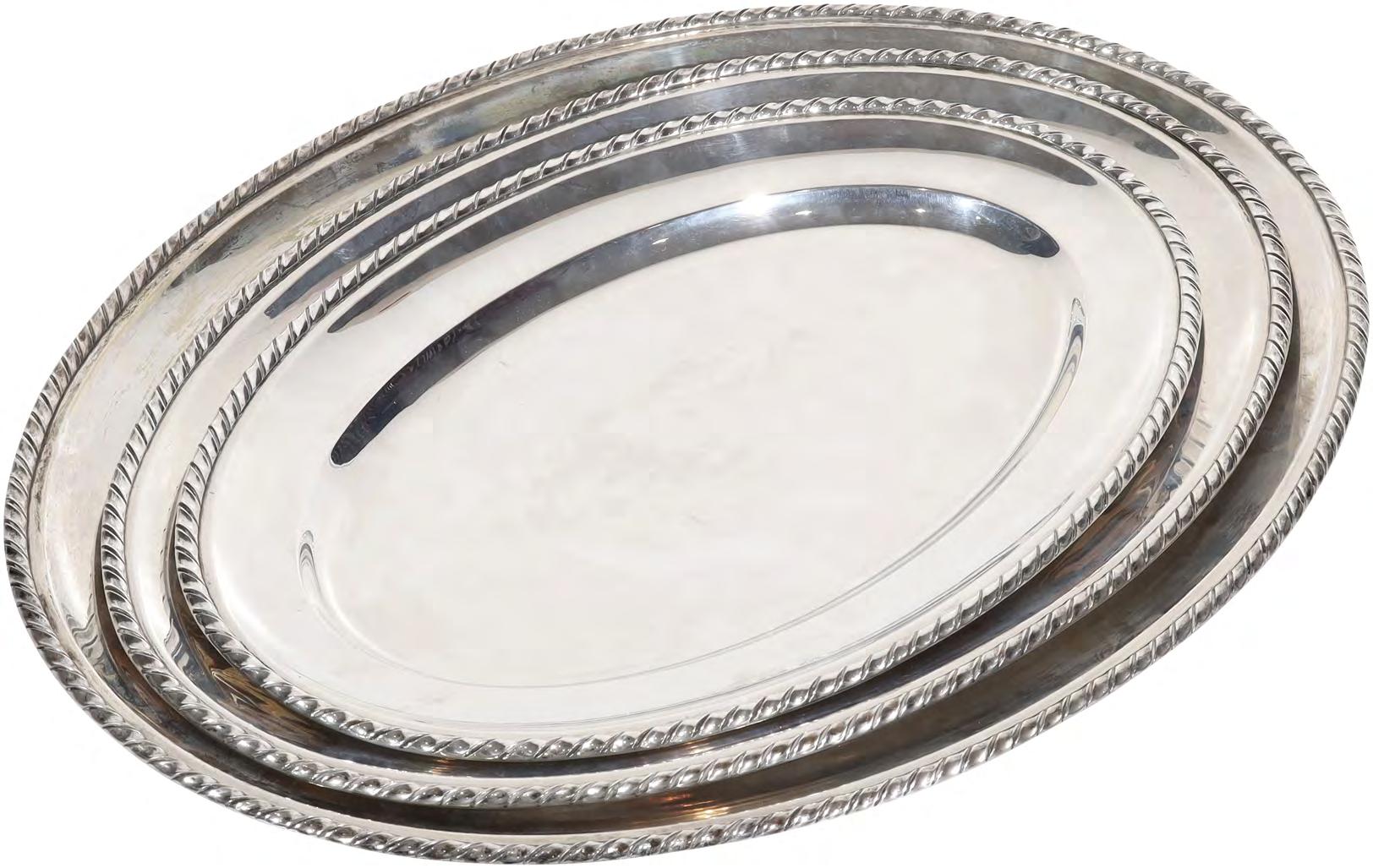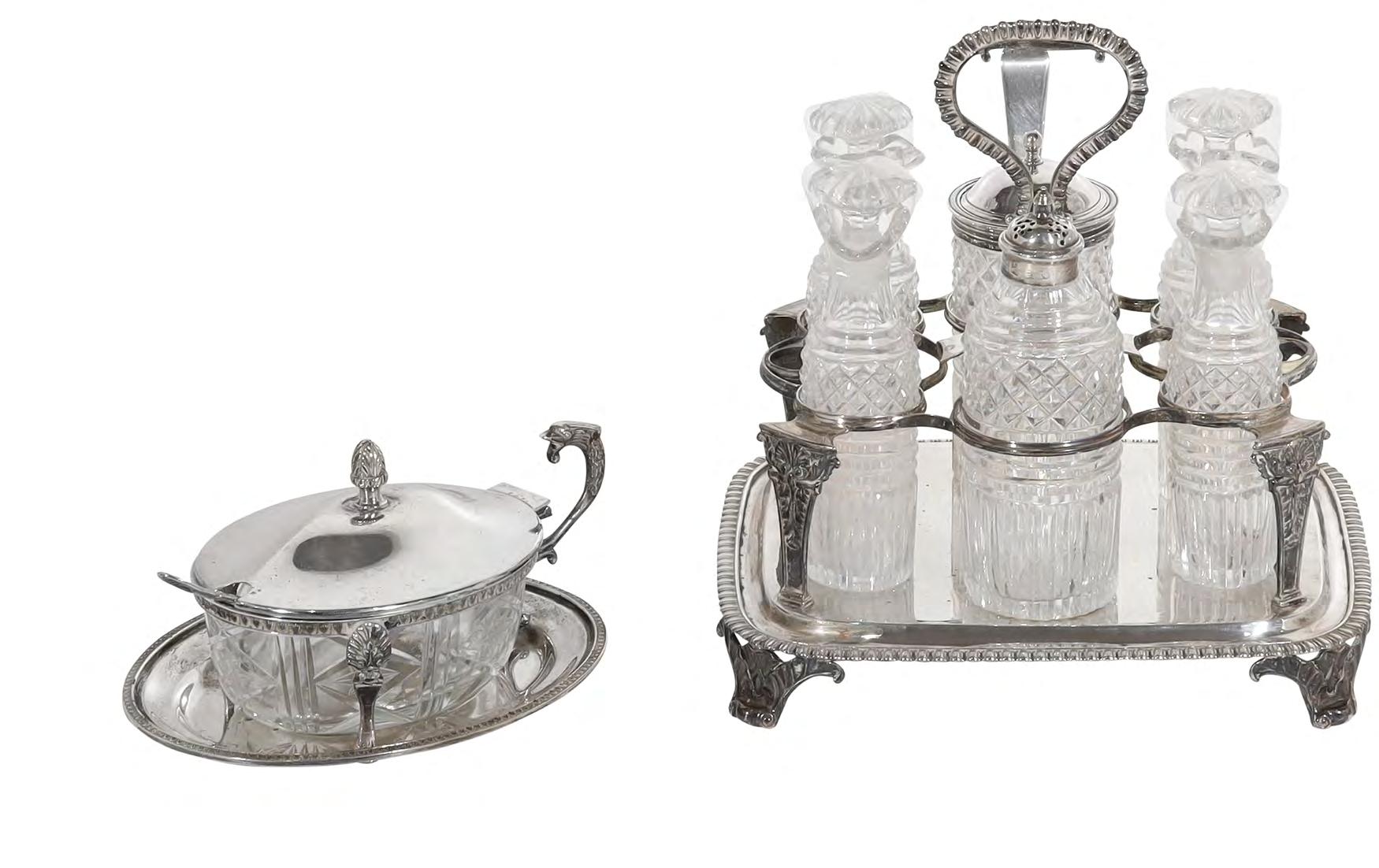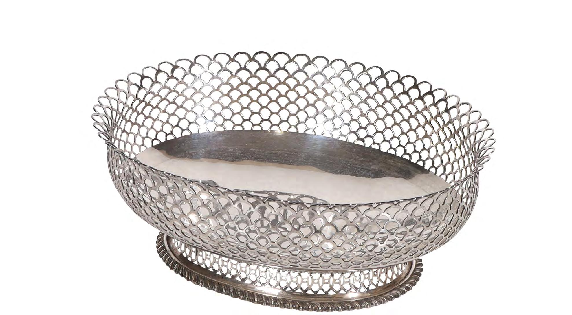 in argento a corpo liscio, alla base ornati a foglie piumate. Prese laterali ad anello sostenute da teste d’aquila, gr. 1.130 ca.