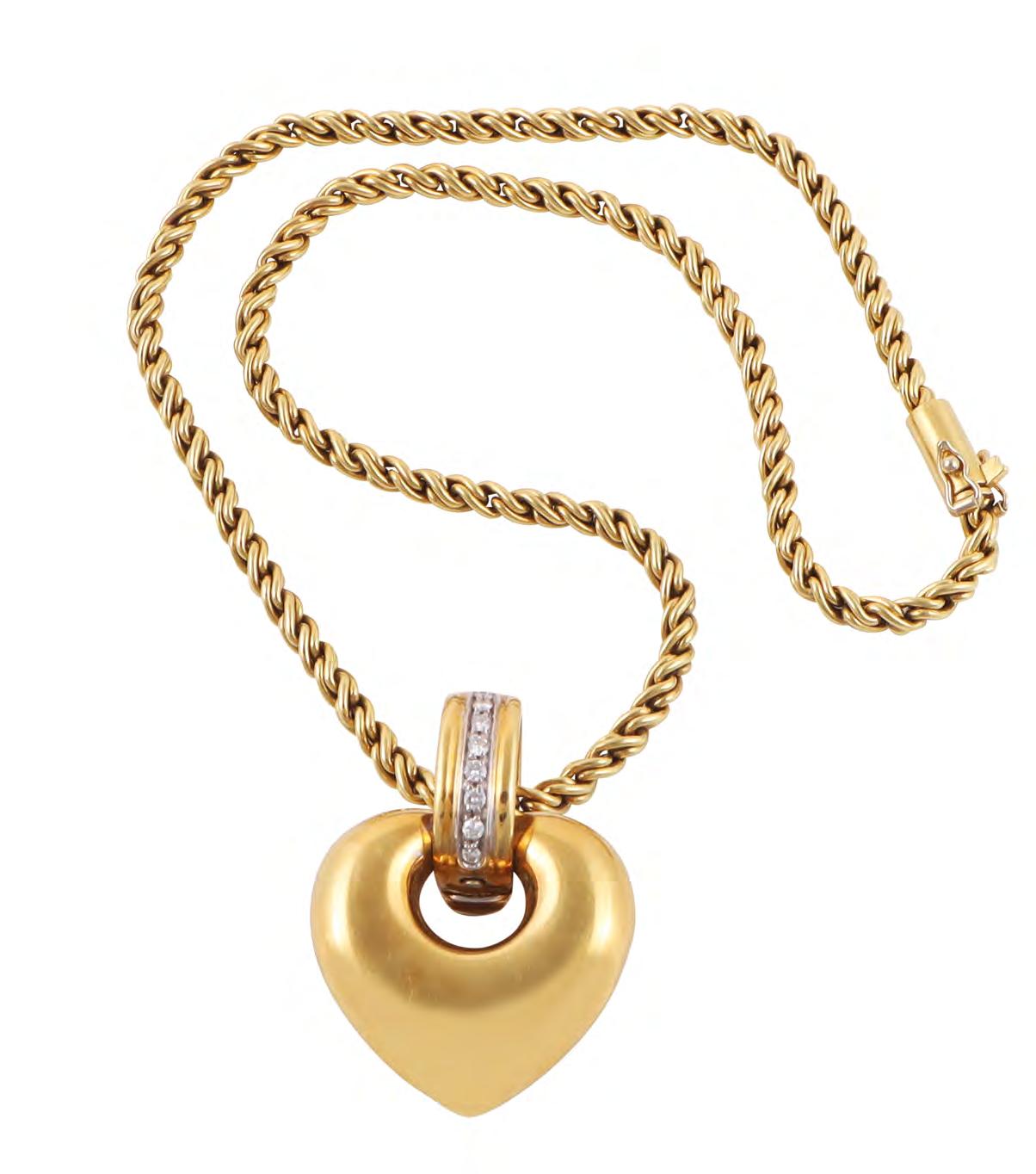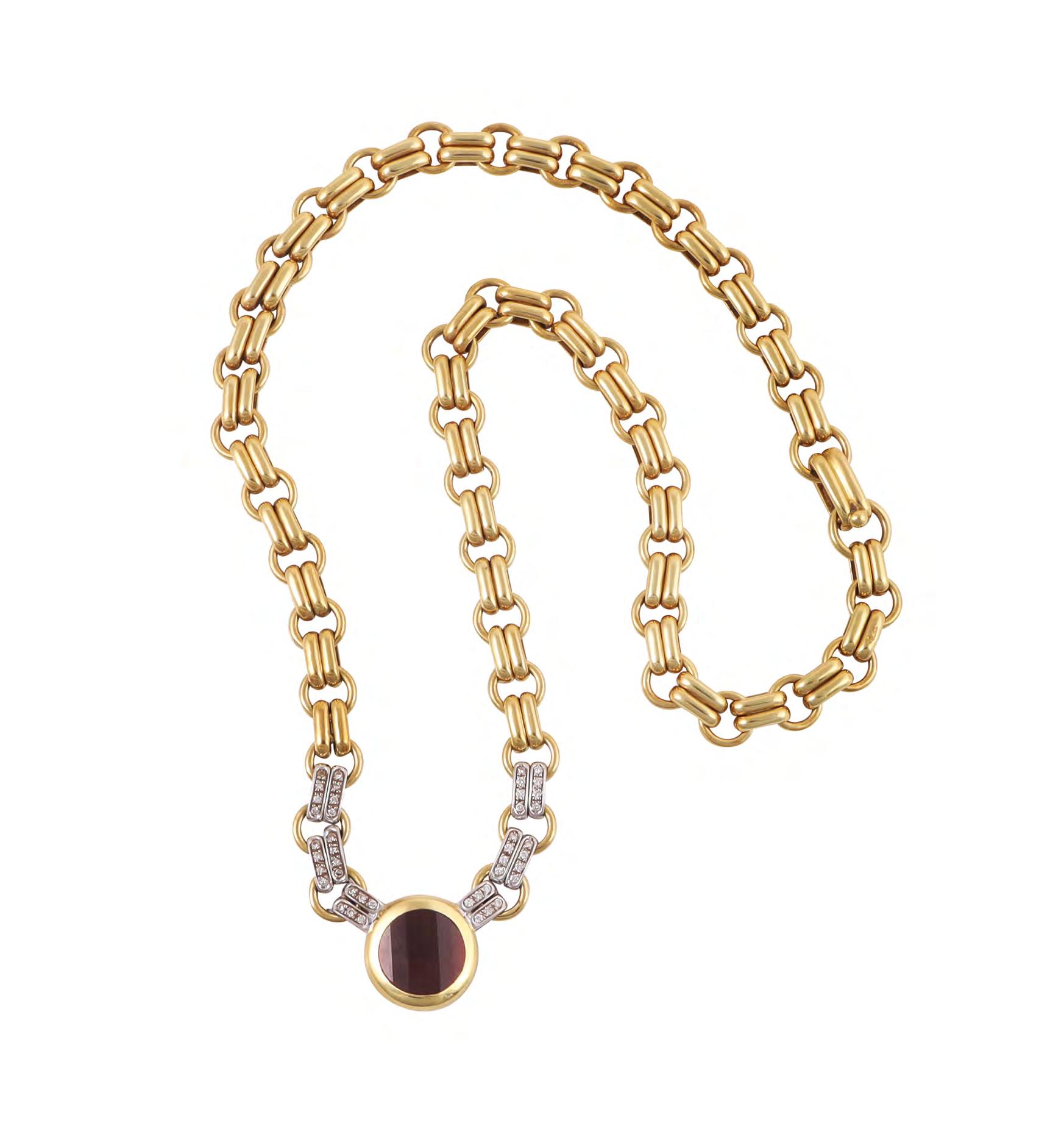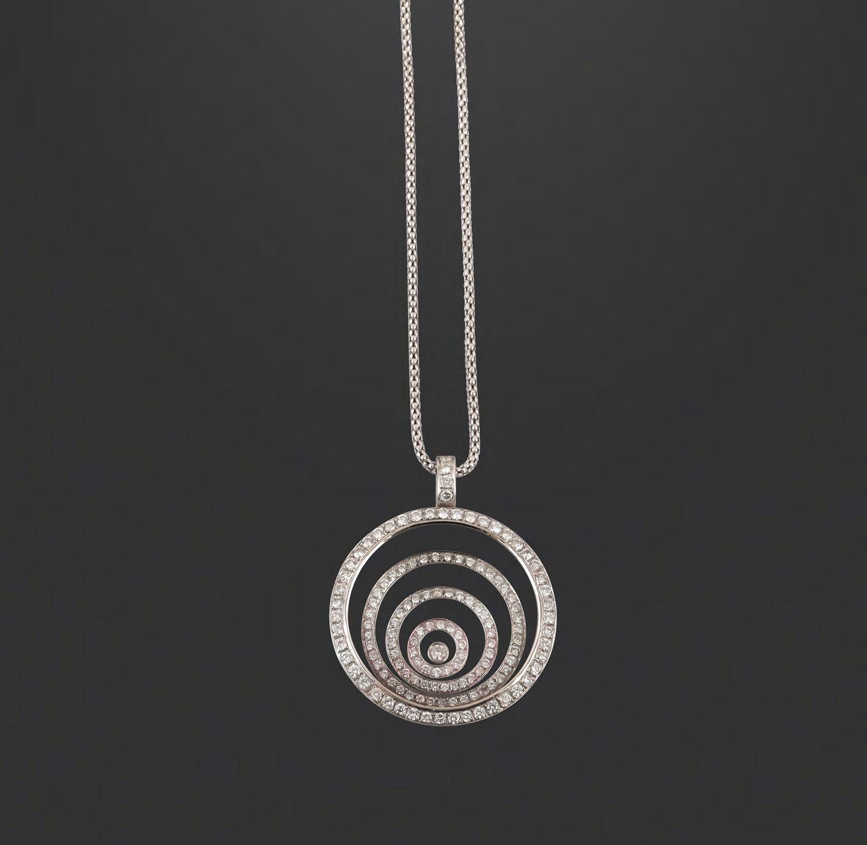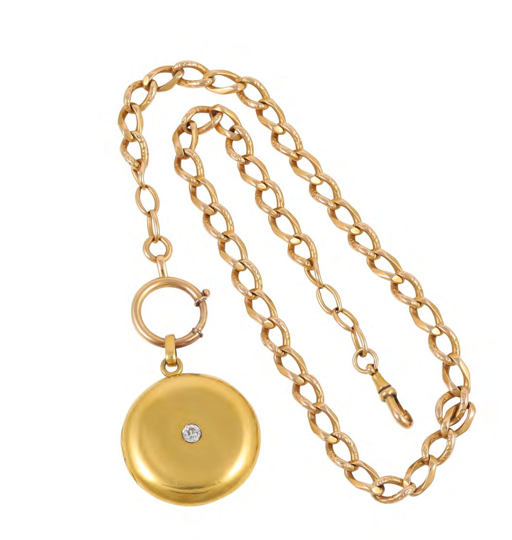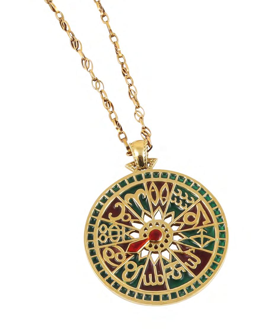 in oro, a forma circolare raffigurante i segni zodiacali con smalti policromi “plique-à-jour”, al centro lancetta girevole. Sorretto da una catena. Gr. complessivi 28,3.