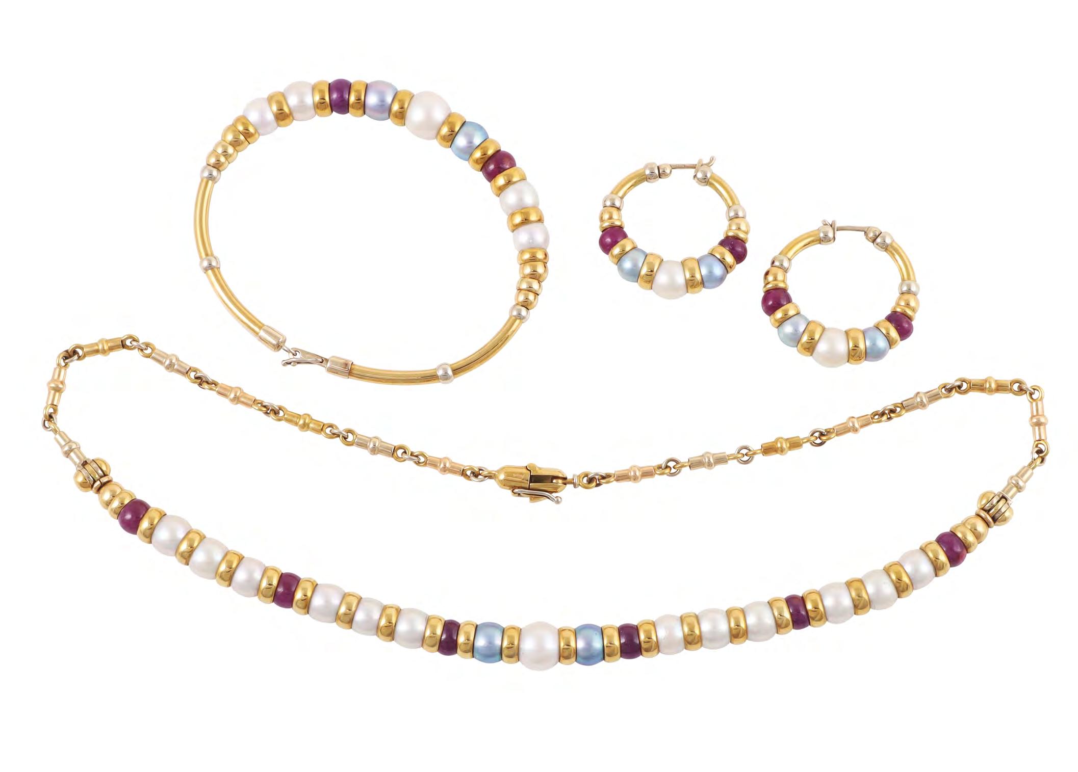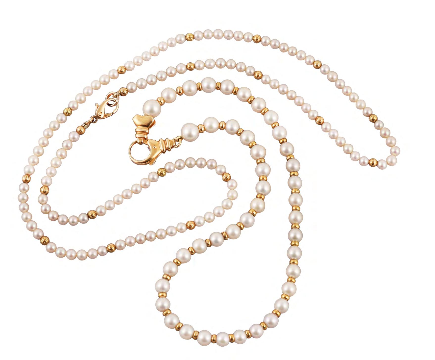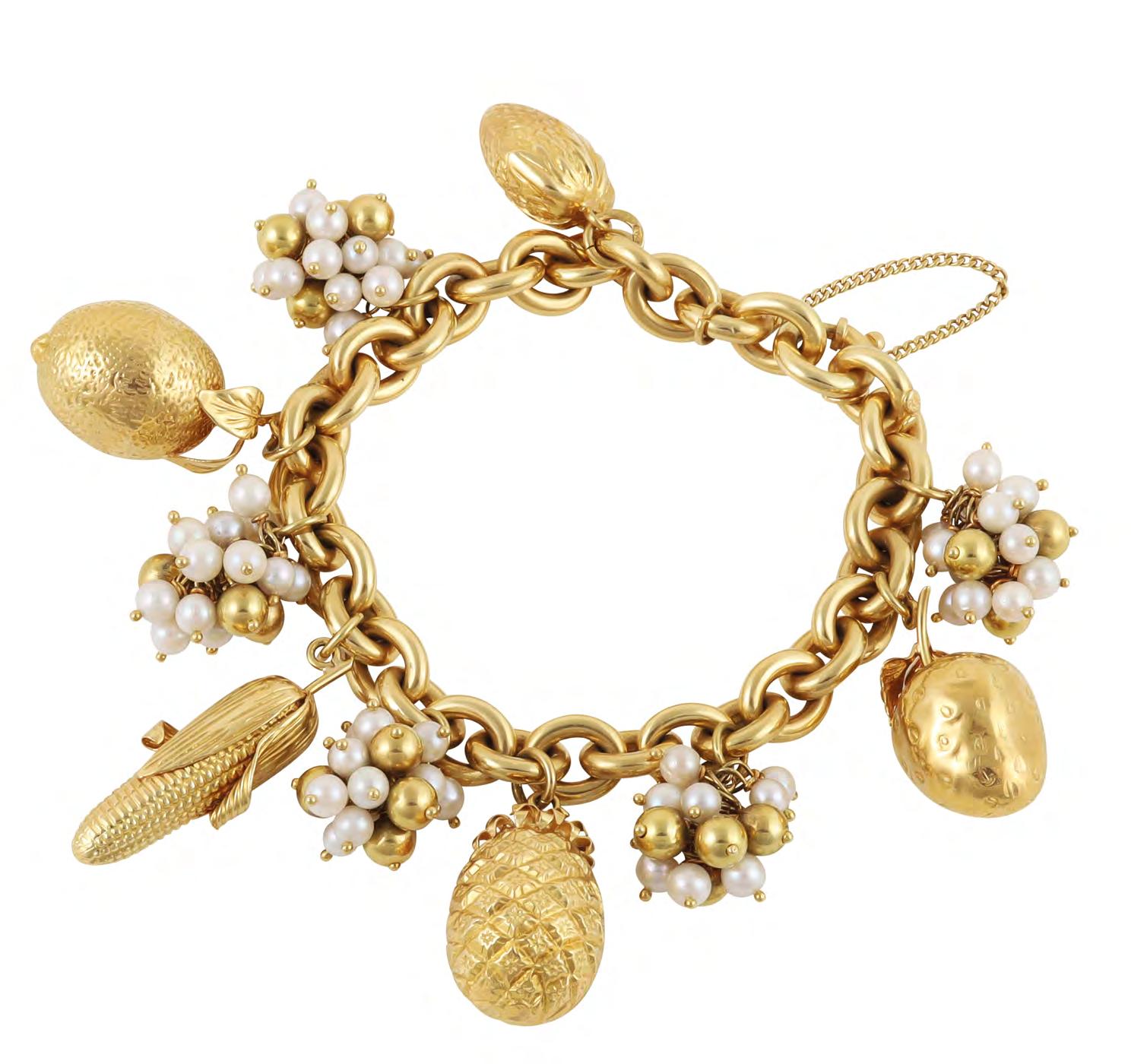 in oro giallo a maglie tonde con dieci charms a motivi vegetali, alternati a ciuffetti di perle coltivate e sferette, gr. 62,8.