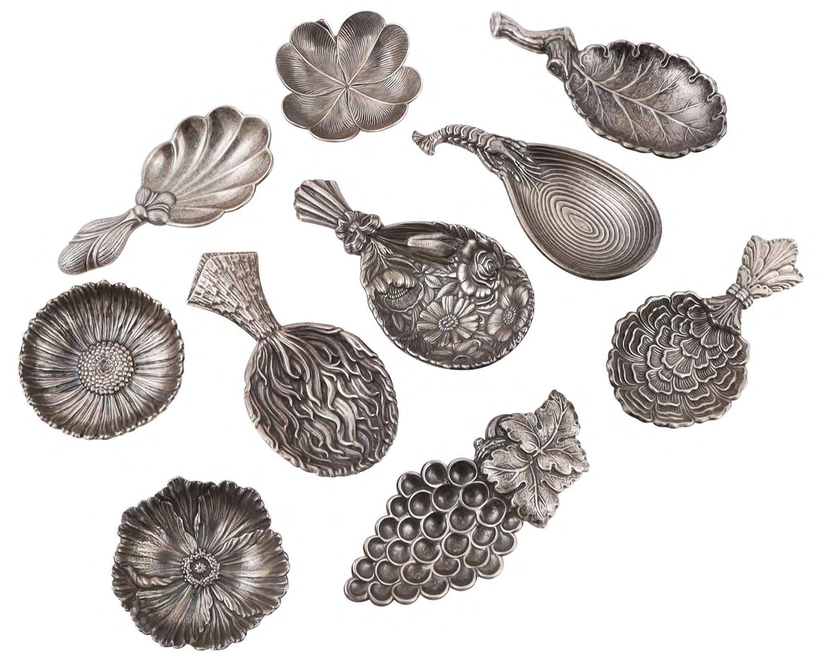 in argento 925 composto da sette cucchiaini dosa tè a motivi vegetali e tre piccole ciotole a fiore e quadrifoglio, gr. complessivi 316,4.
