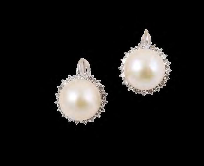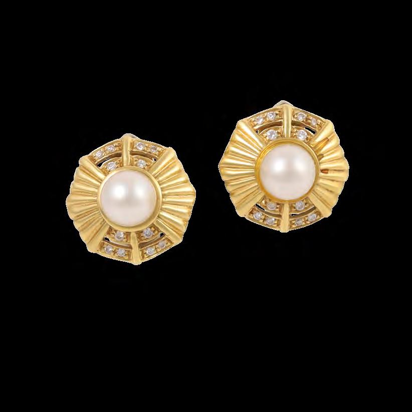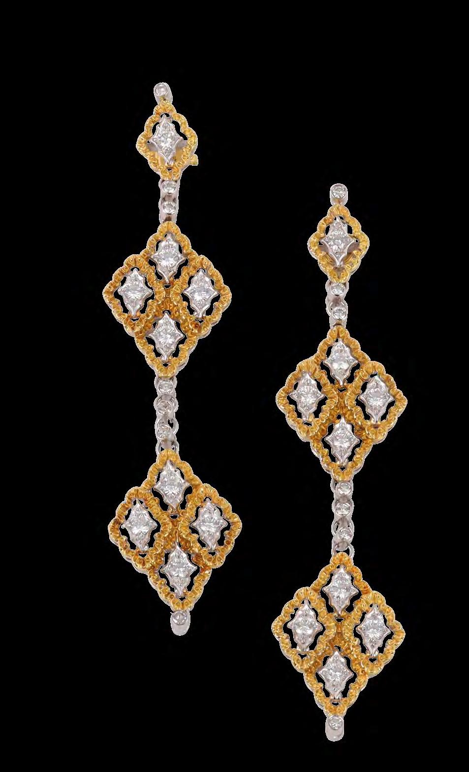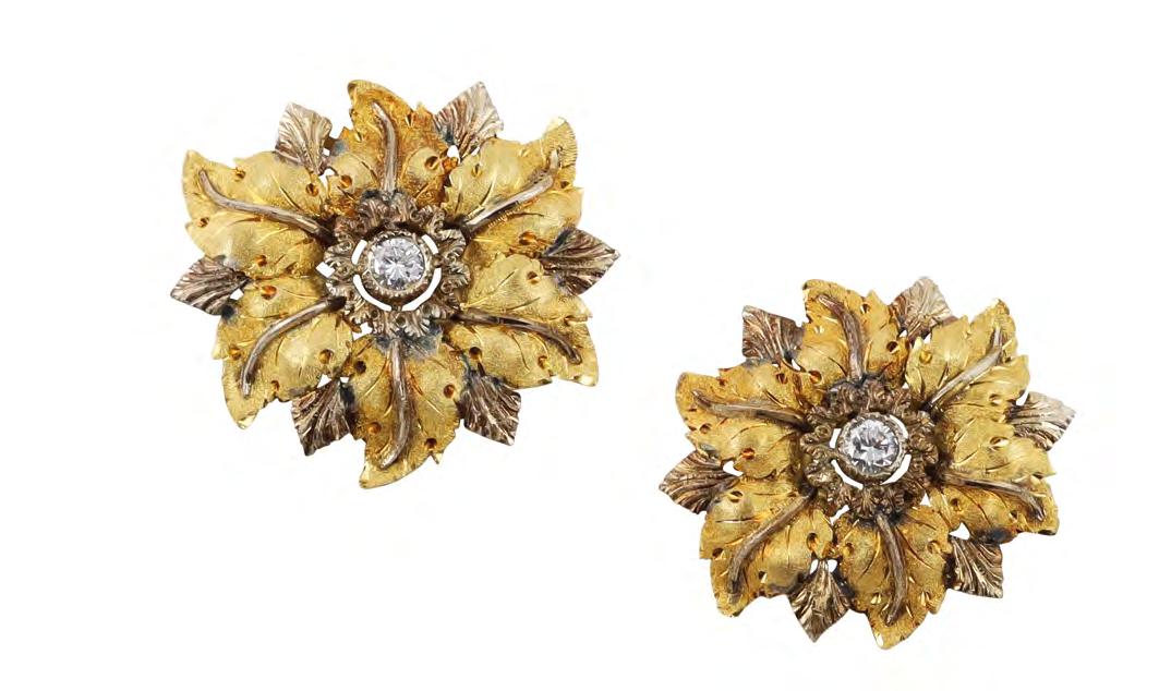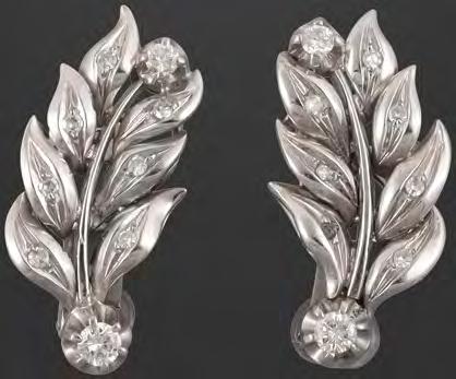 in oro giallo e bianco a motivi fogliati finemente cesellati, ciascuna con al centro un brillante, gr. complessivi 18,2. Dimensioni 3,4 x 3 cm ca. e 3 x 2,8 cm ca.