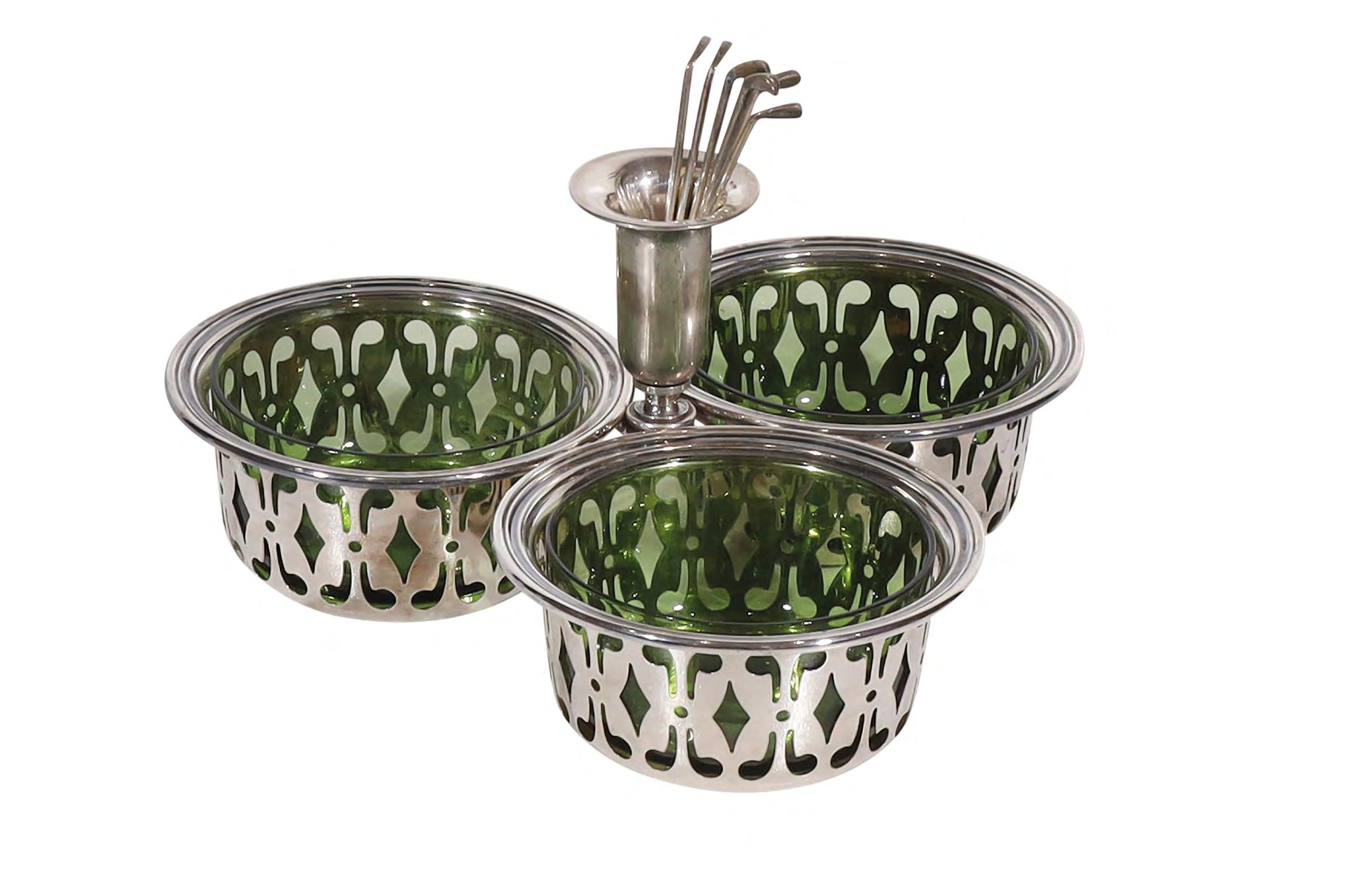 in argento a tre corpi lavorati a giorno con vaschette in vetro verde e stecchini in argento a guisa di mazze da golf, gr. complessivi 250 ca. (escluse parti in vetro).