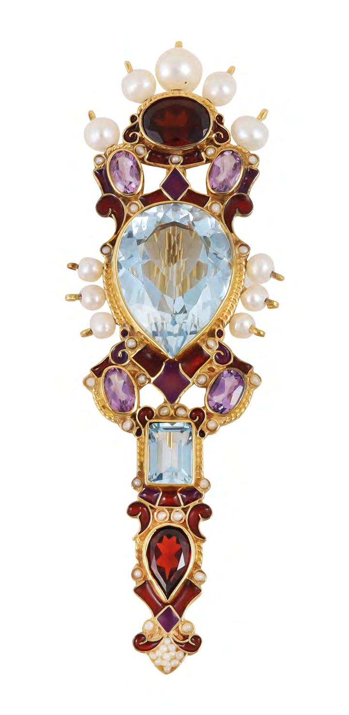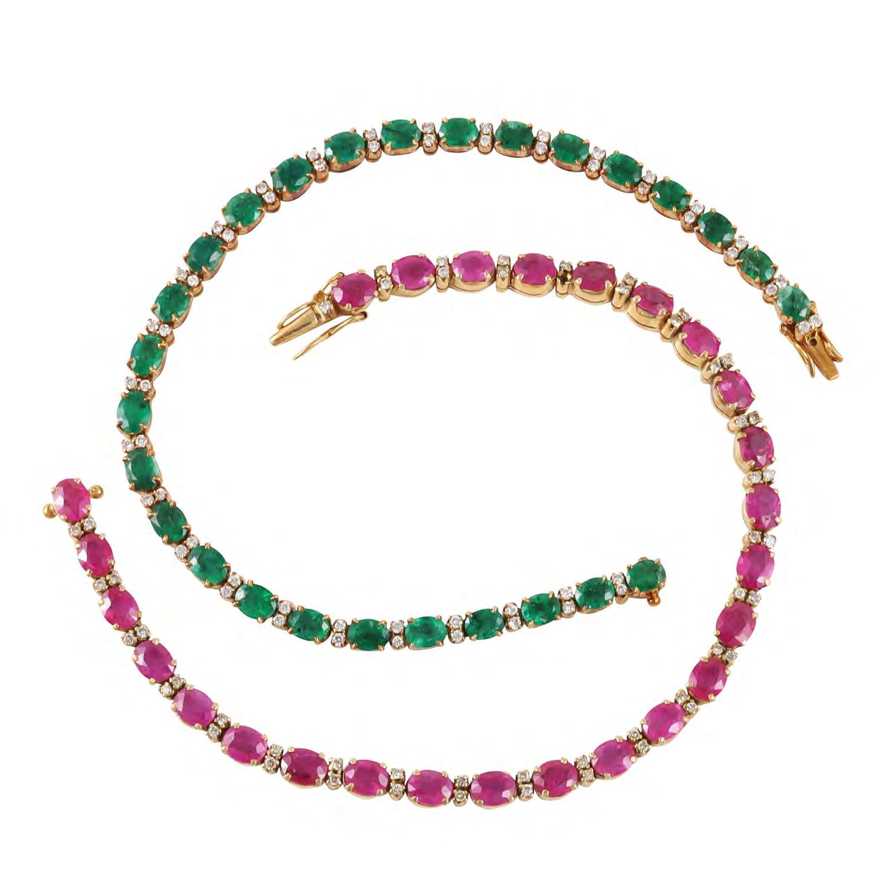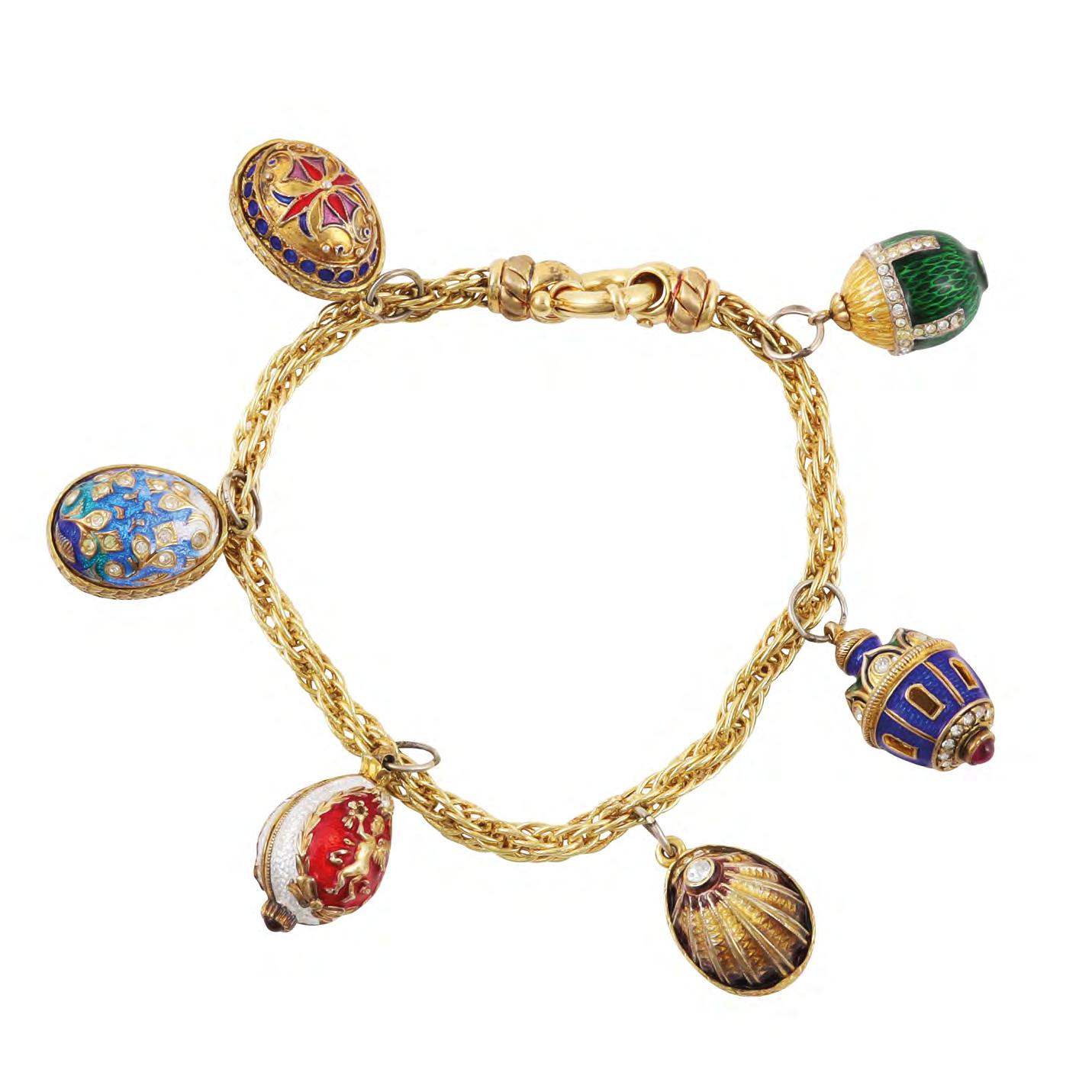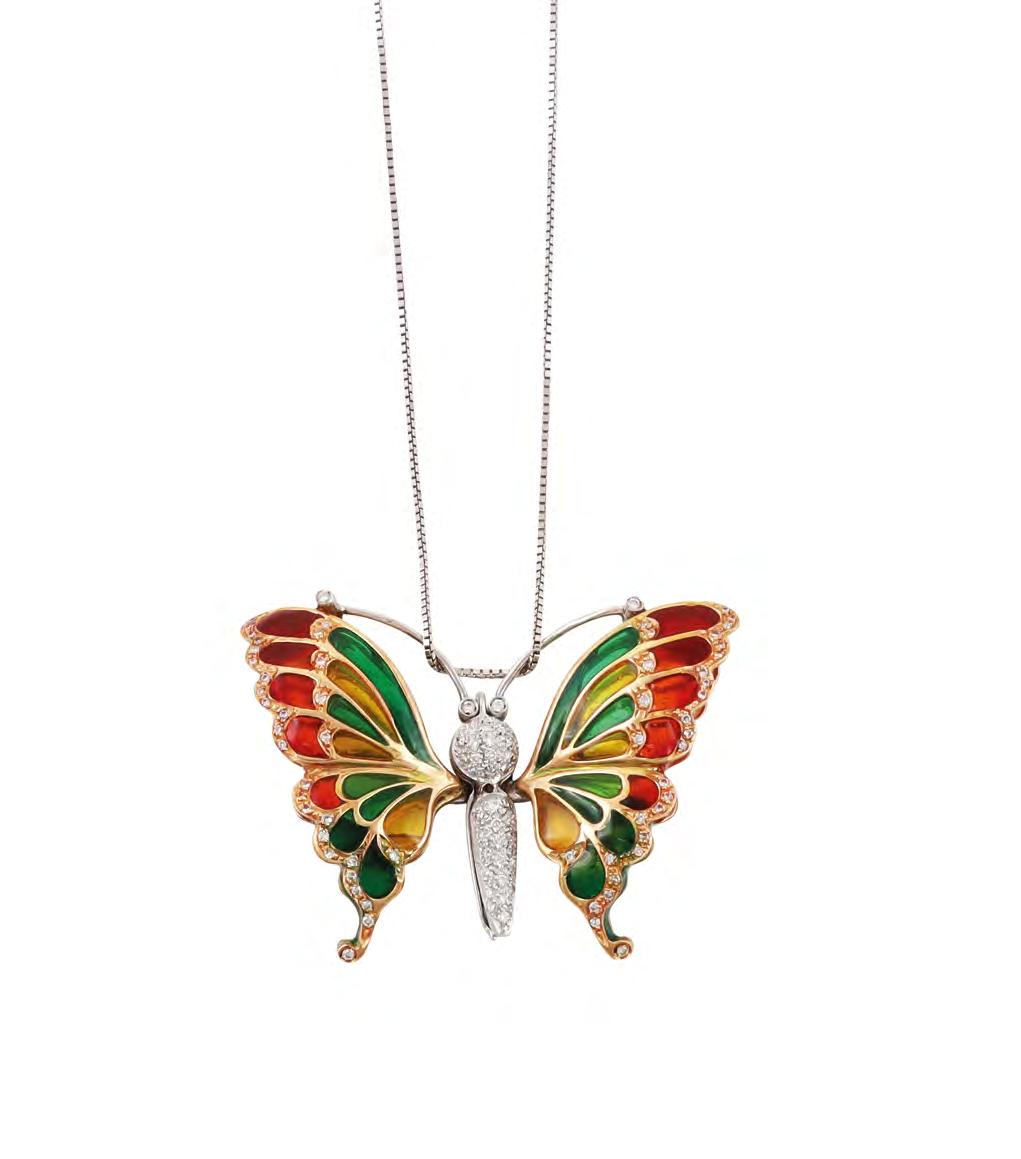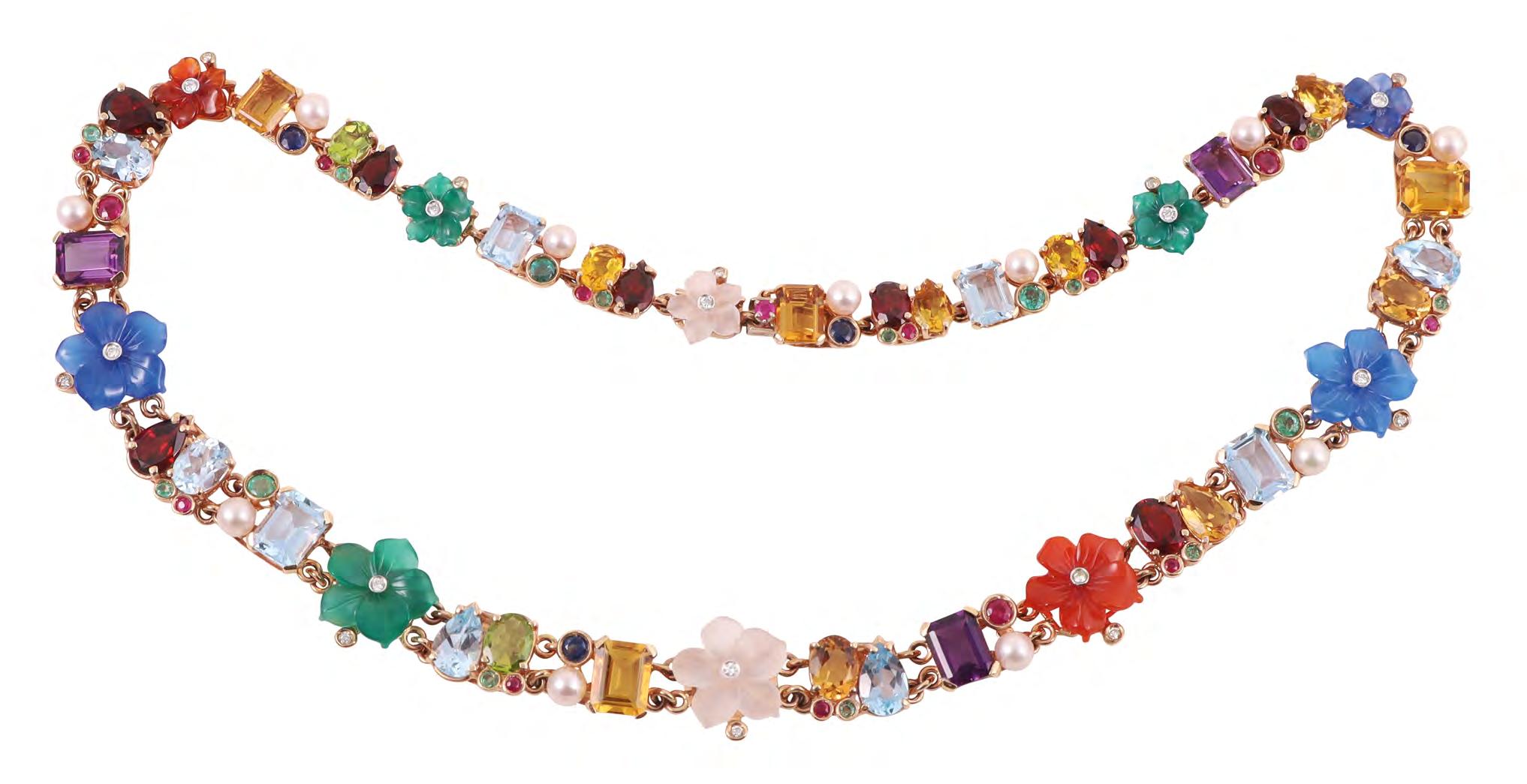in oro giallo con ovetti pendenti in argento dorato, smalti e pietre sintetiche, gr. lordi 54,8. Lunghezza 20 cm